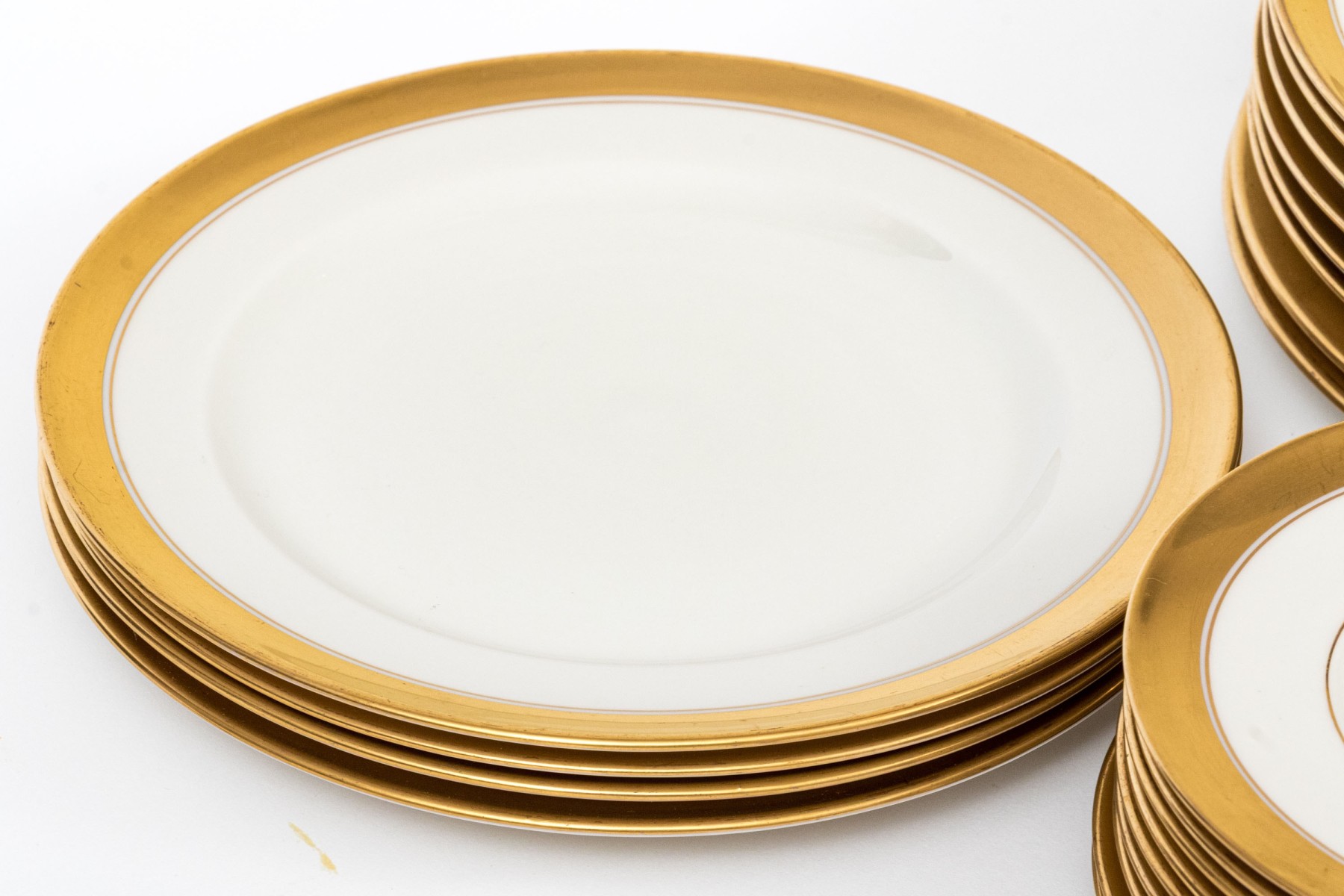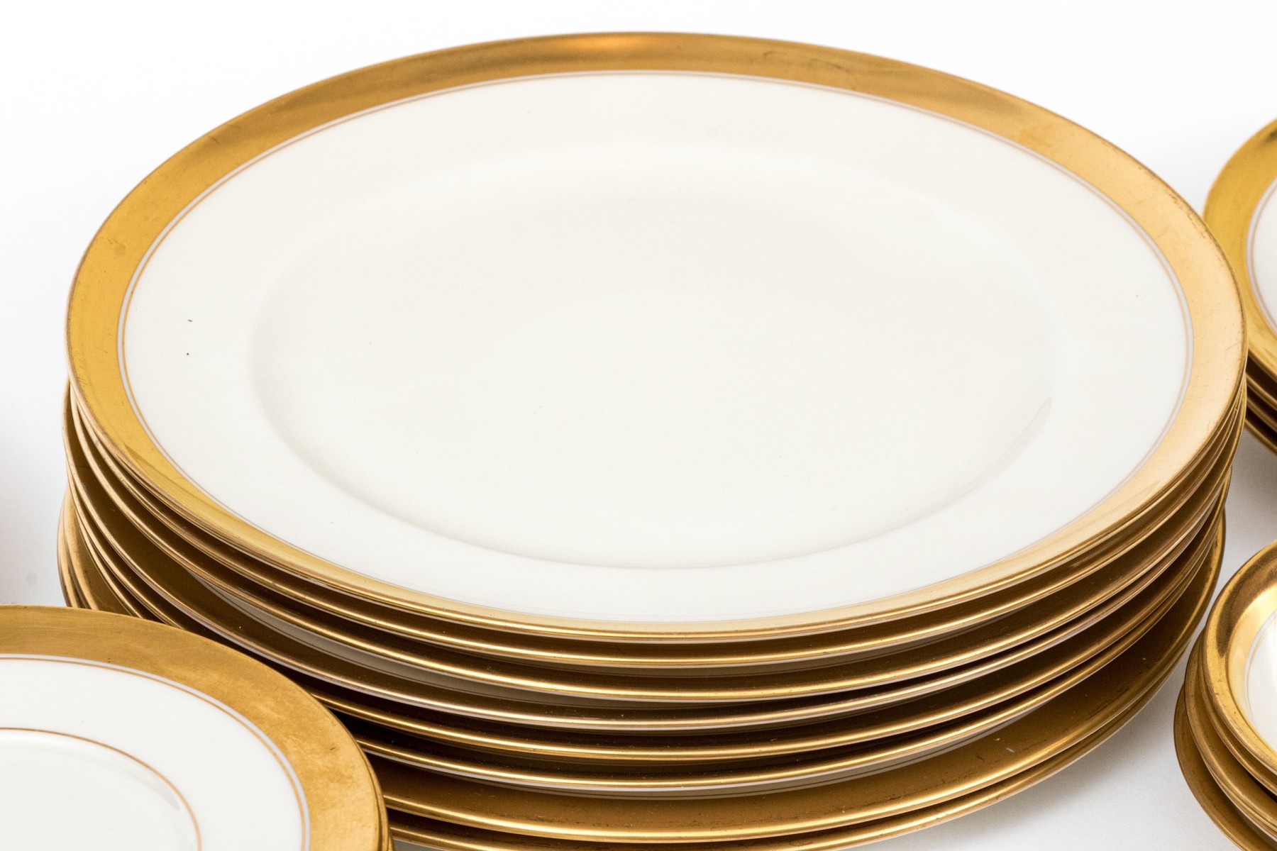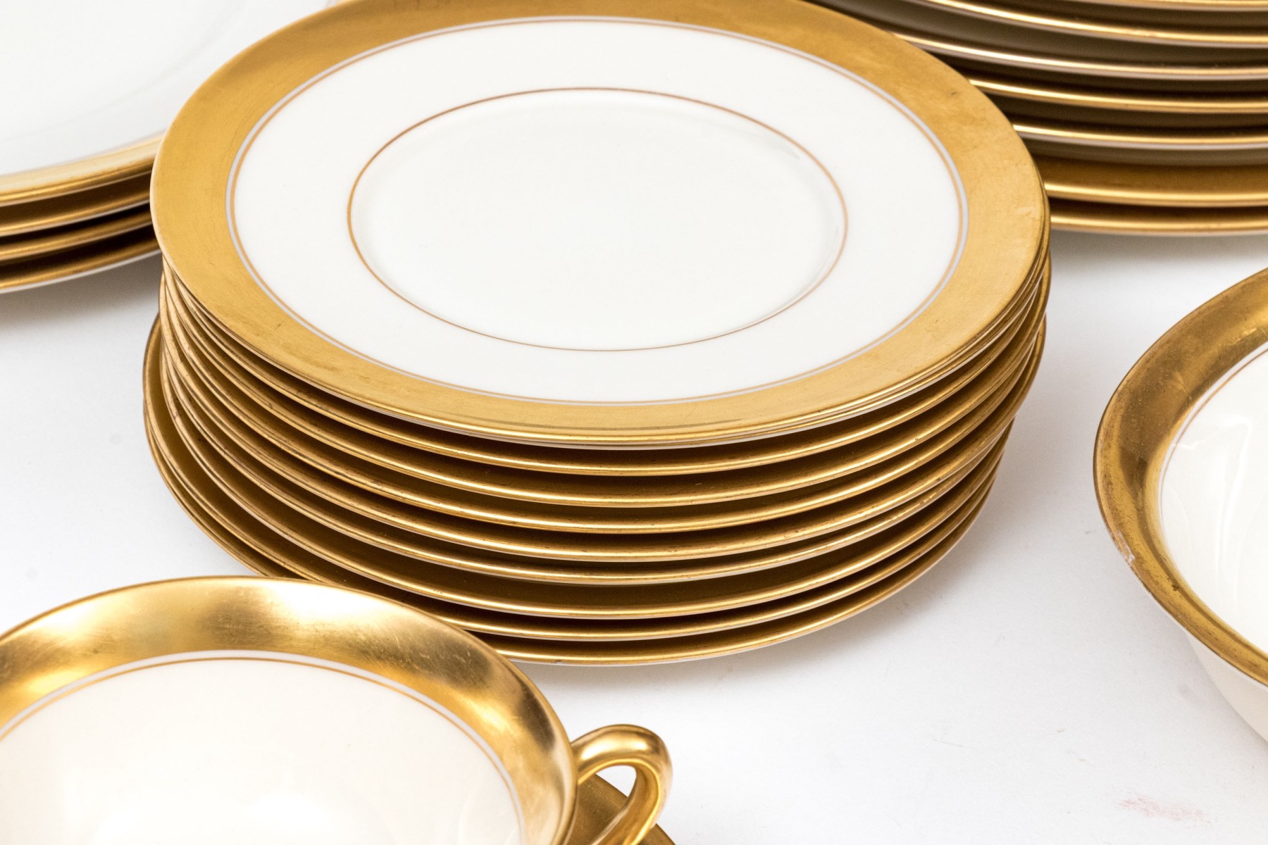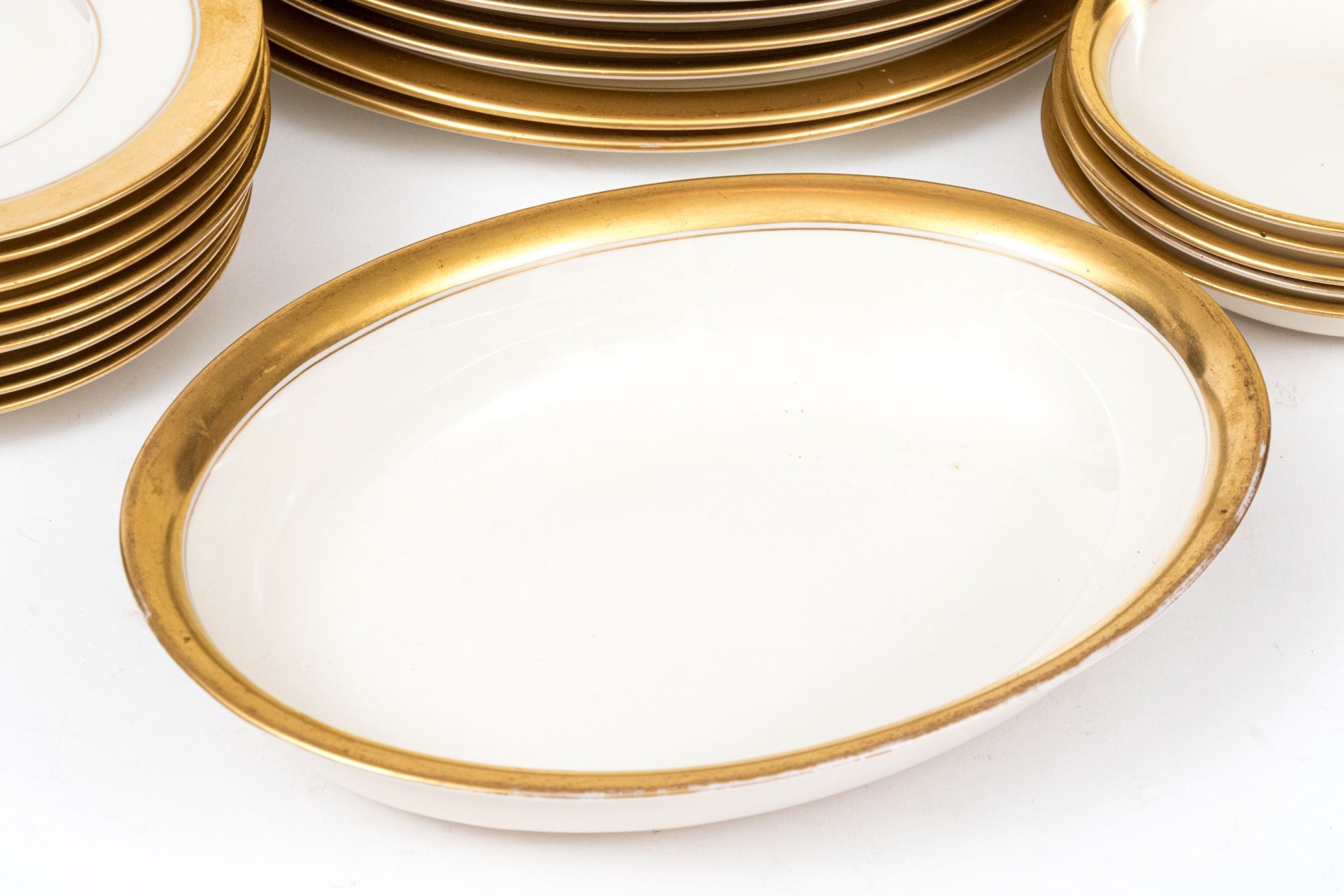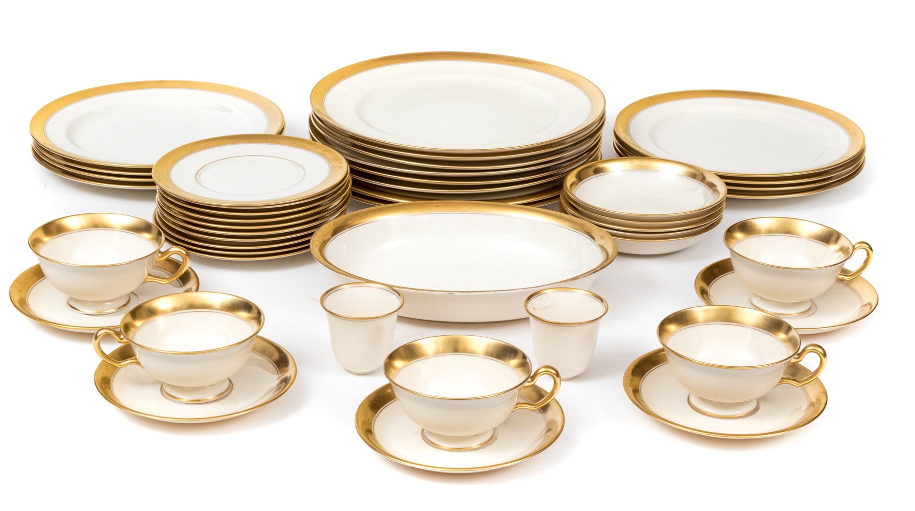 An extensive collection of Lenox "86 1-2" china service made expressly for Davis & Hawley Jewelers, Bridgeport-Waterbury, Connecticut. The pieces features sleek, cream white bodies with richly gilt rims followed by thin gilt stripes.