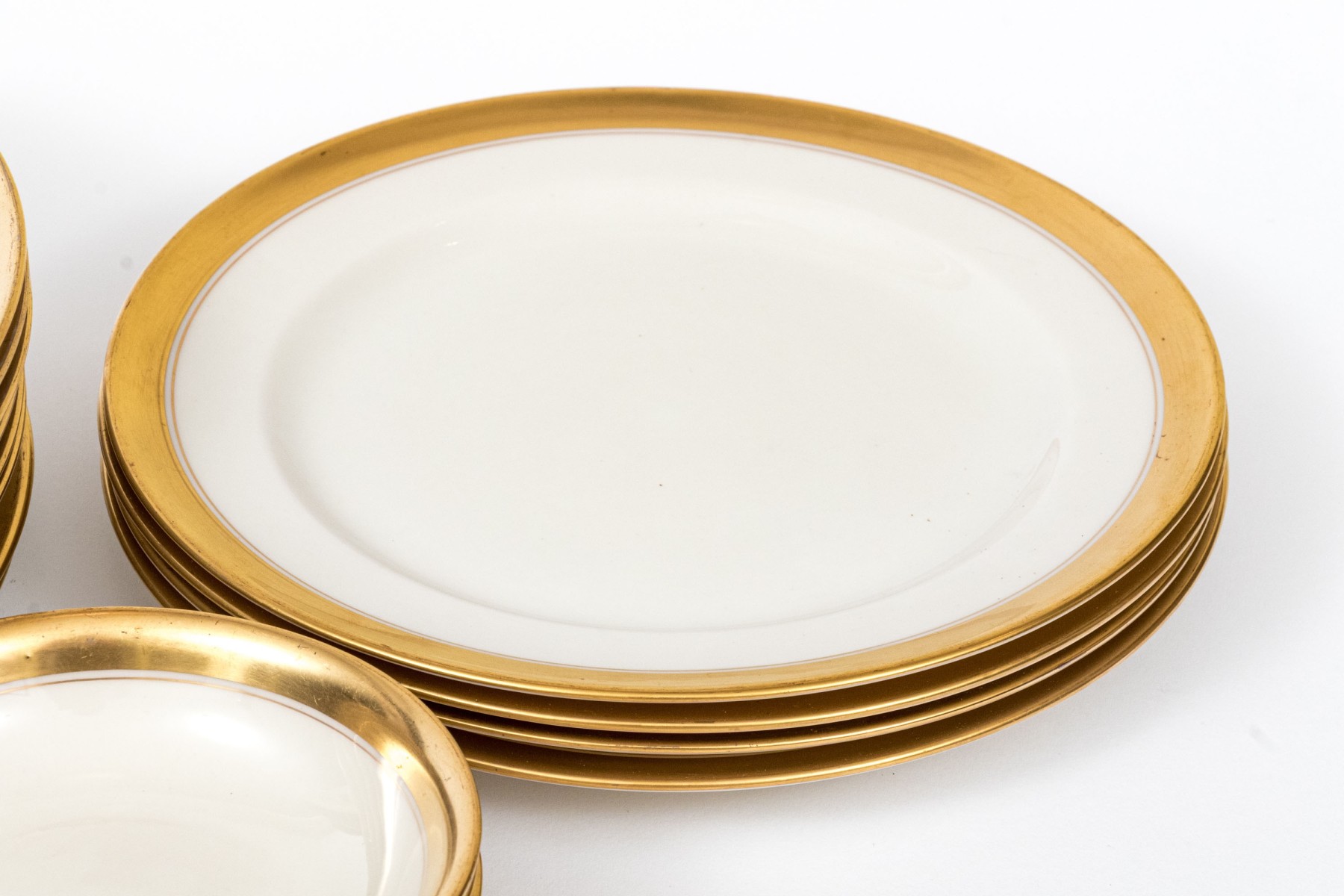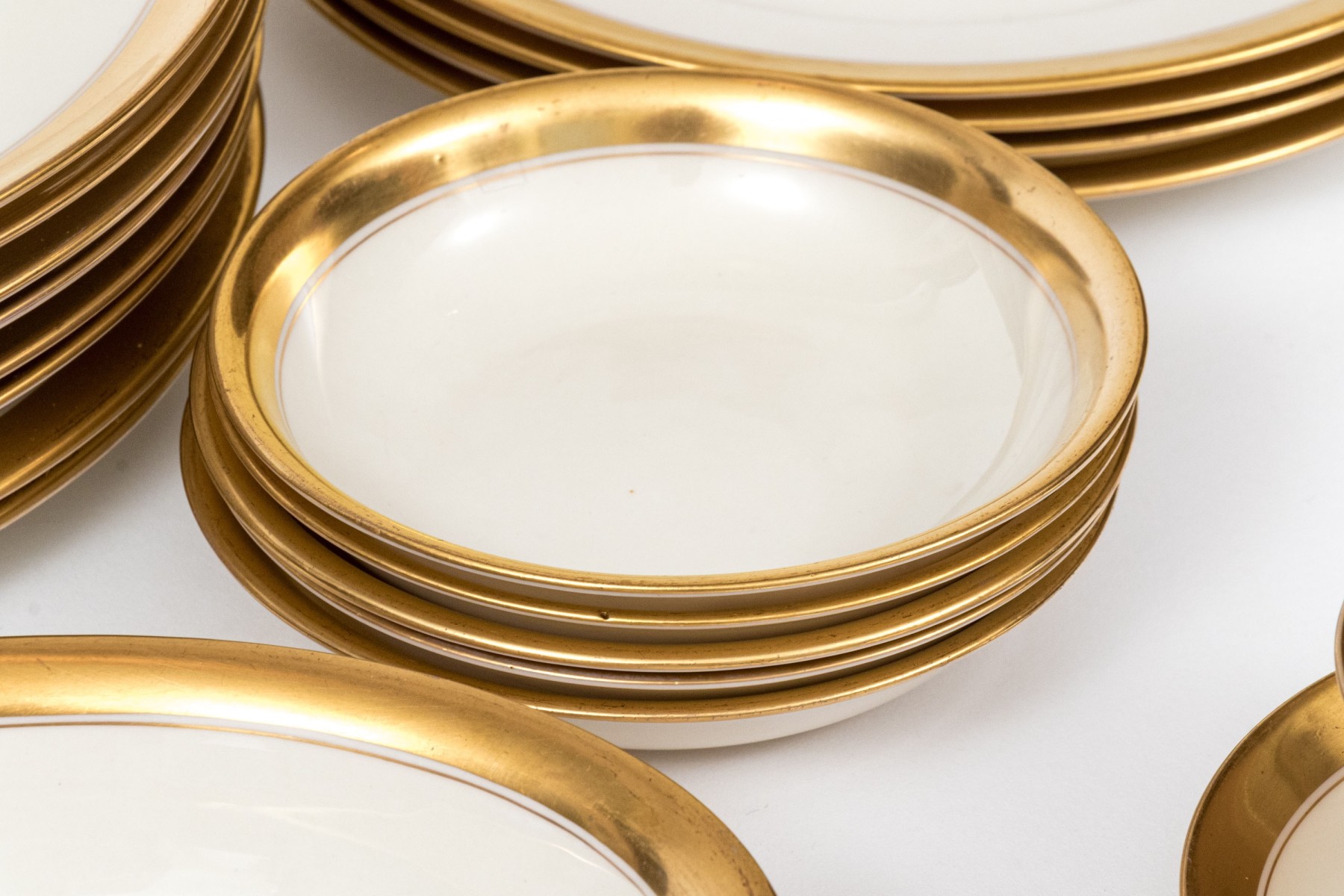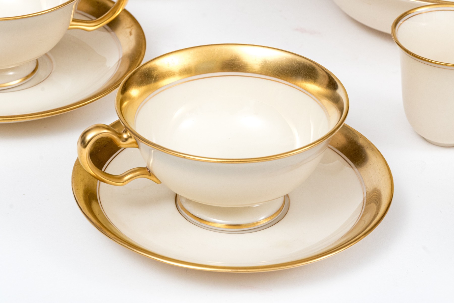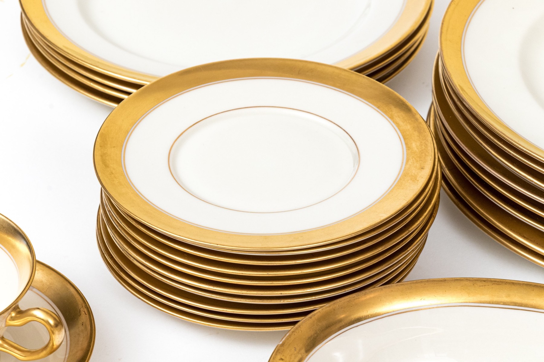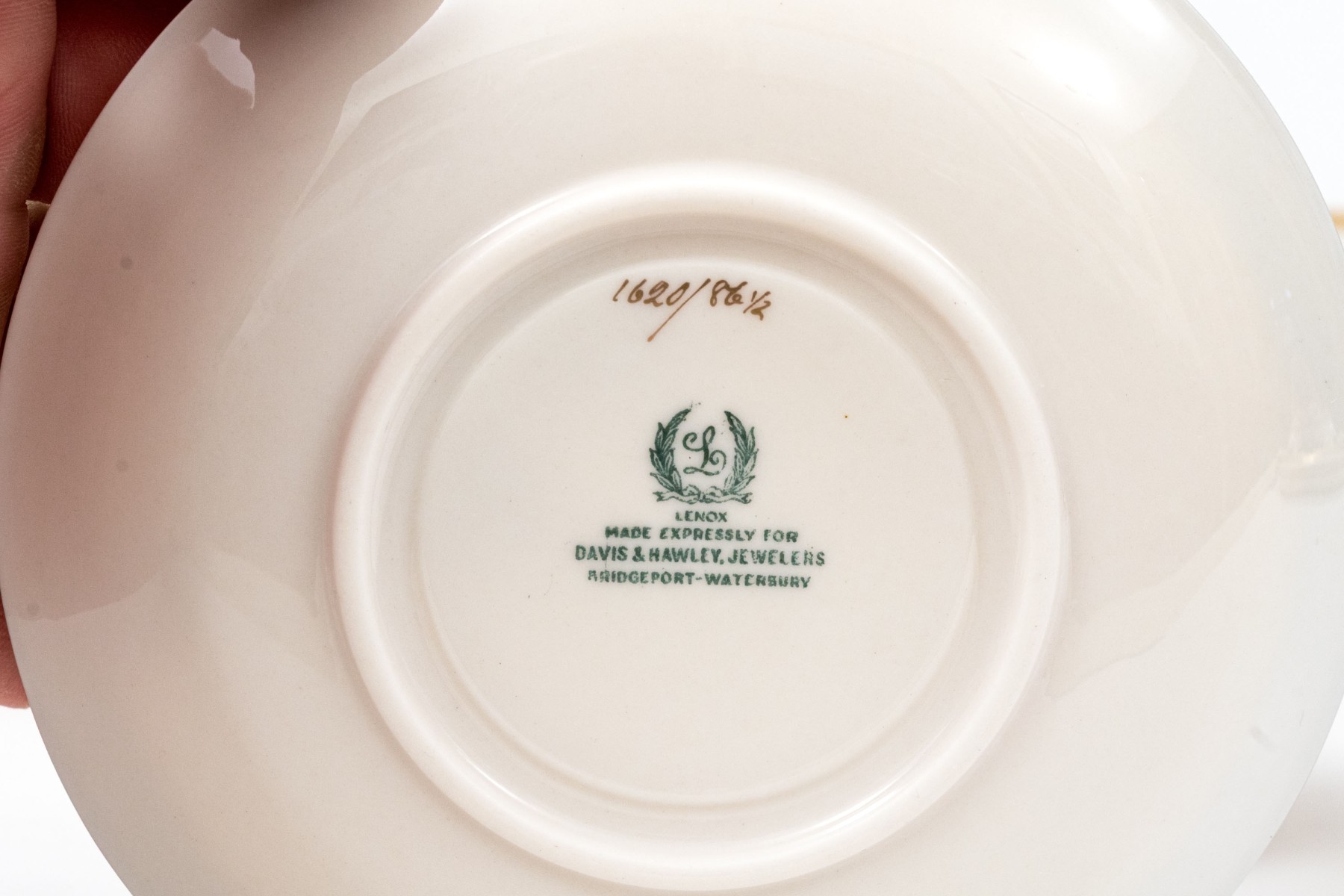 An extensive collection of Lenox "86 1-2" china service made expressly for Davis & Hawley Jewelers, Bridgeport-Waterbury, Connecticut. The pieces features sleek, cream white bodies with richly gilt rims followed by thin gilt stripes.