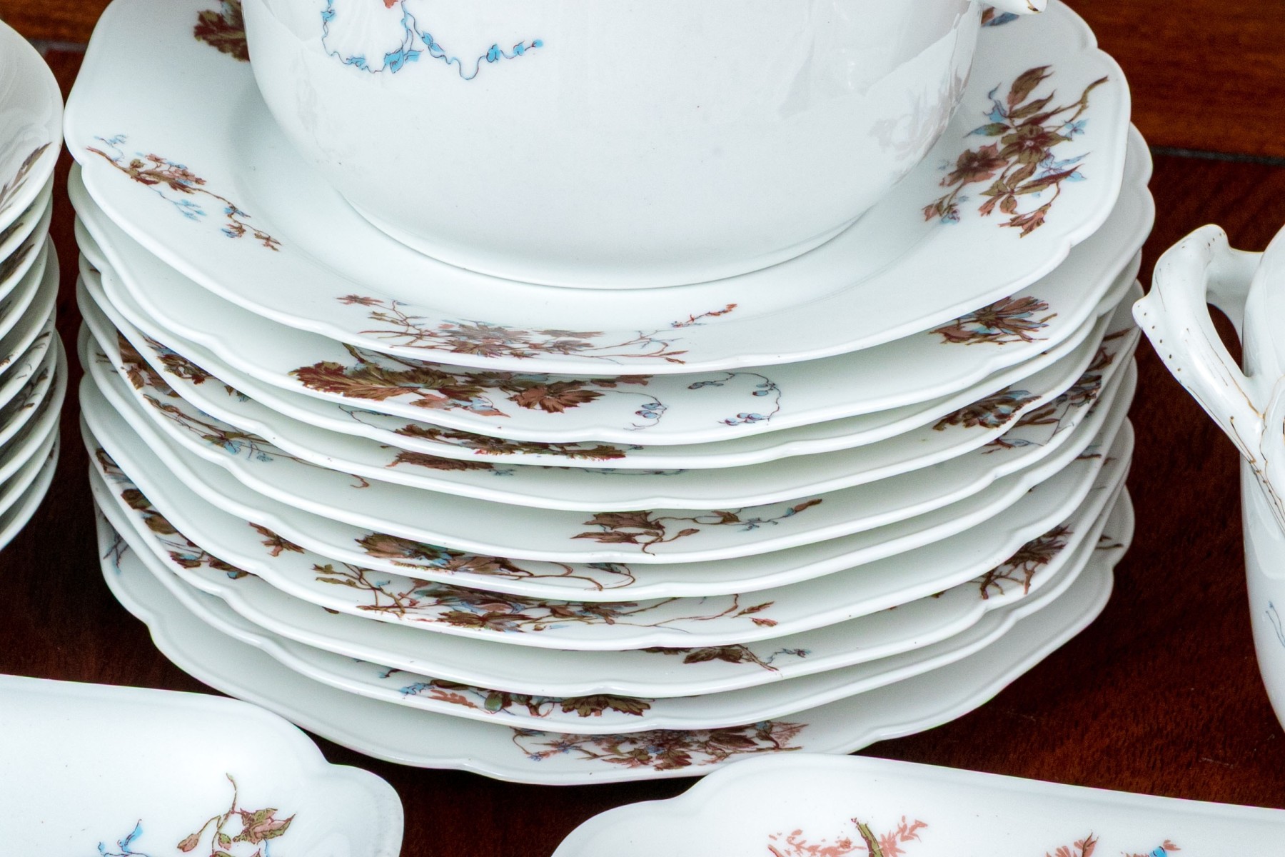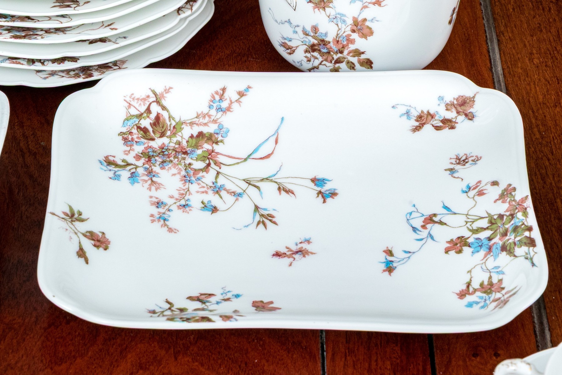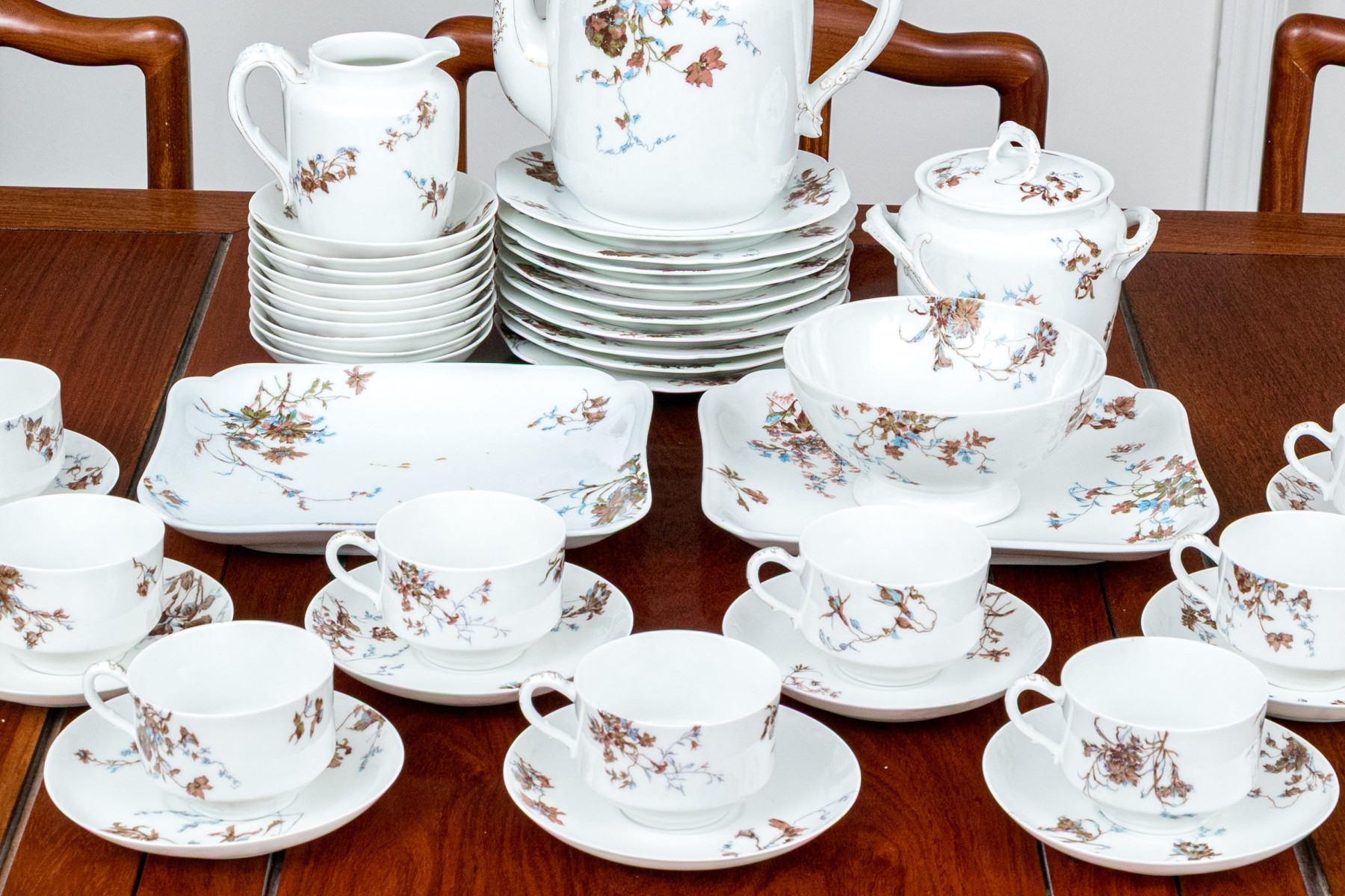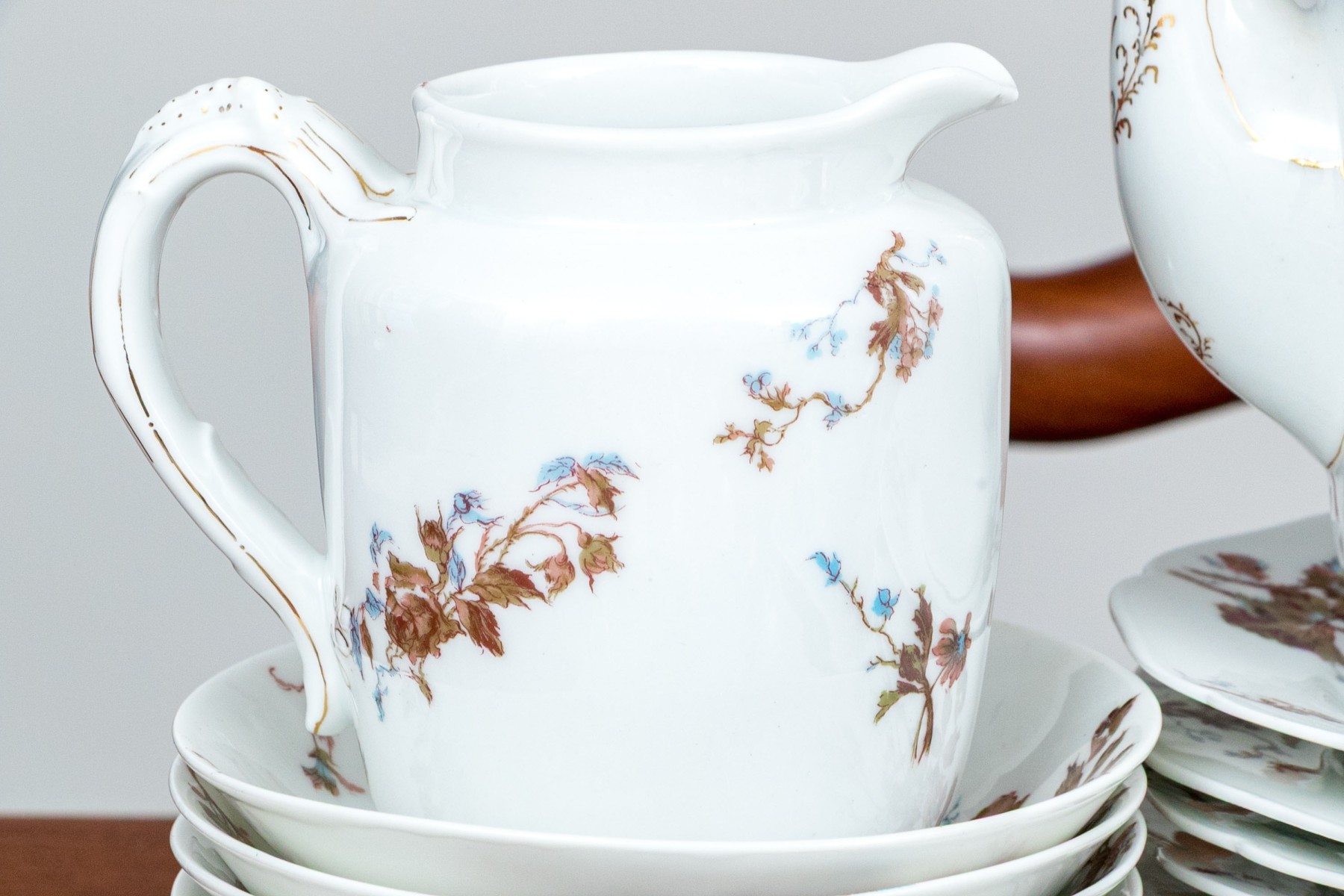 A delightful Haviland & Co Limoges porcelain service showcasing bright white bodies with rotund cylindrical forms on the vessels and scalloped rims on the plates, decorated with dainty blue and brown foliage sprays for an elegant and sophisticated appearance.