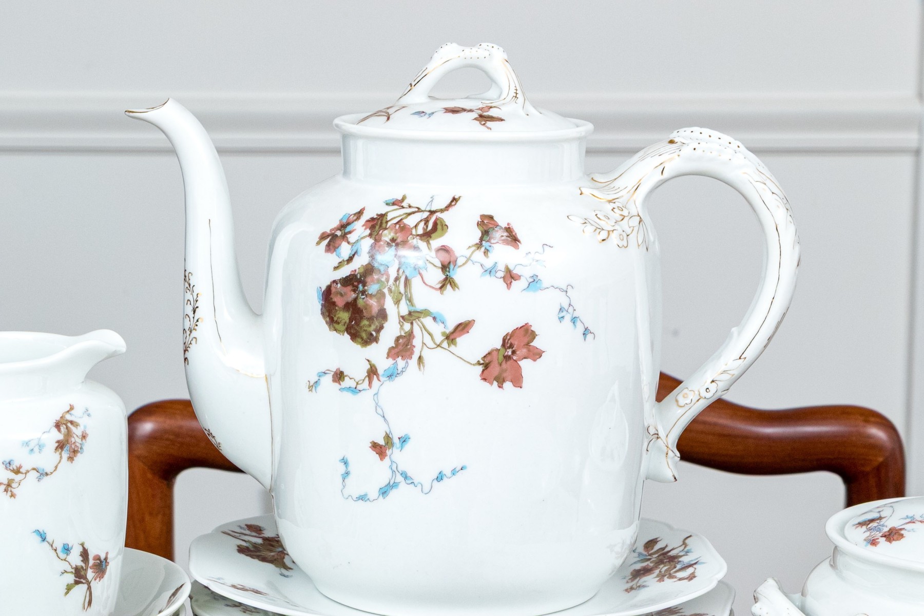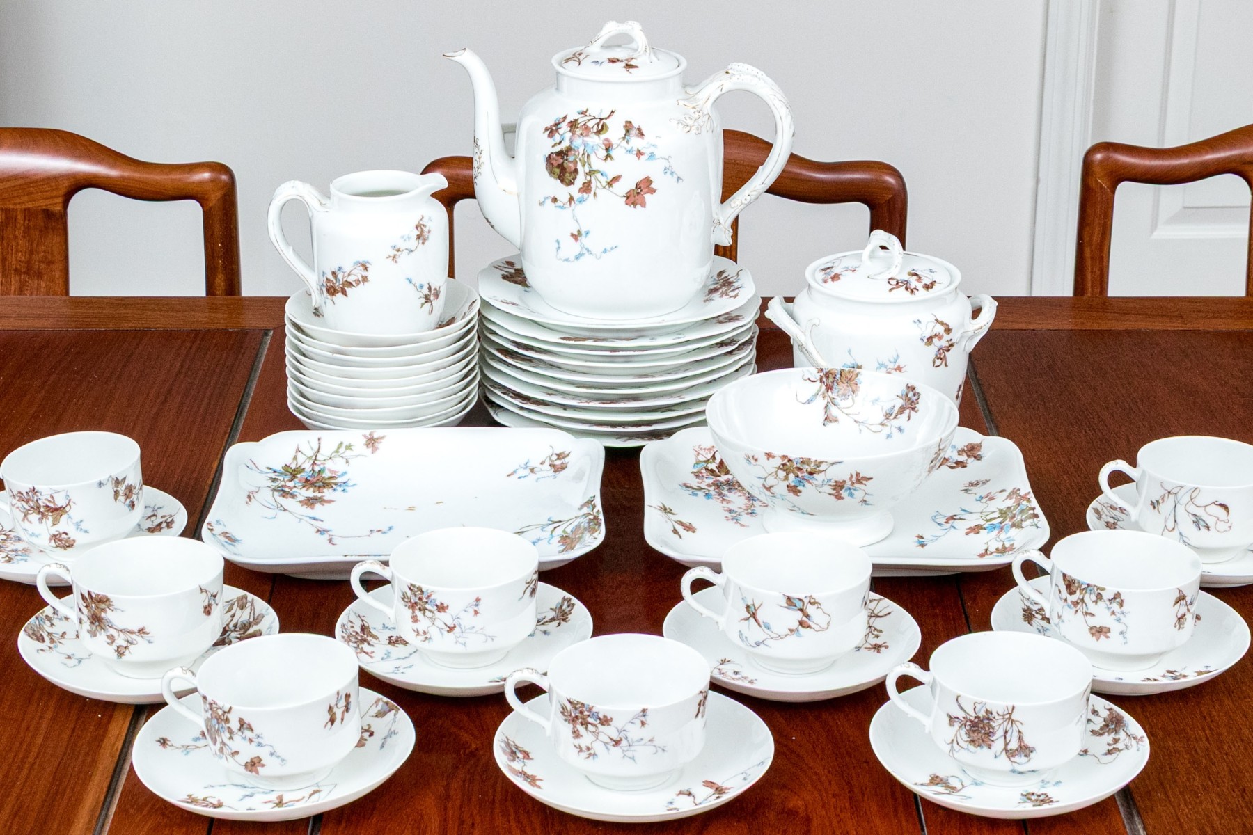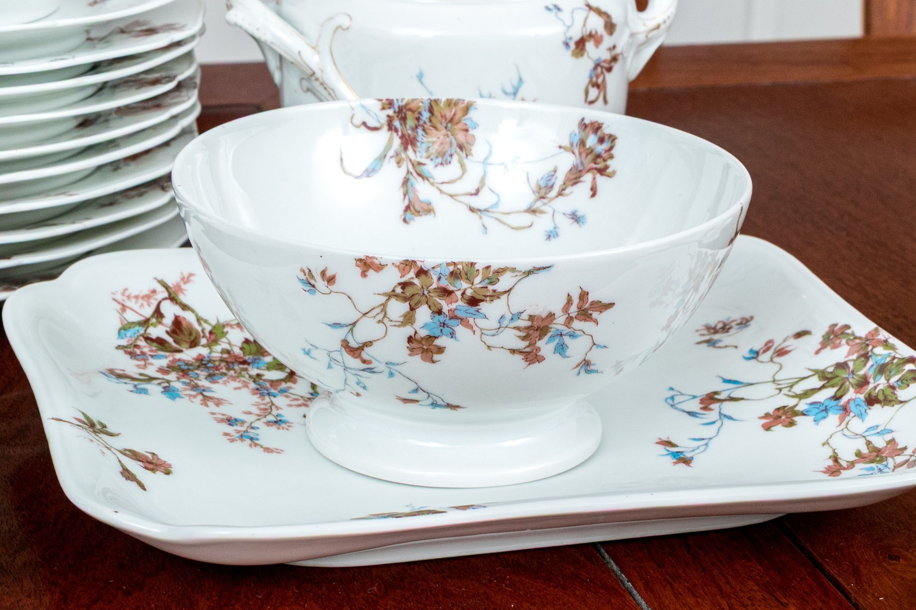 A delightful Haviland & Co Limoges porcelain service showcasing bright white bodies with rotund cylindrical forms on the vessels and scalloped rims on the plates, decorated with dainty blue and brown foliage sprays for an elegant and sophisticated appearance.