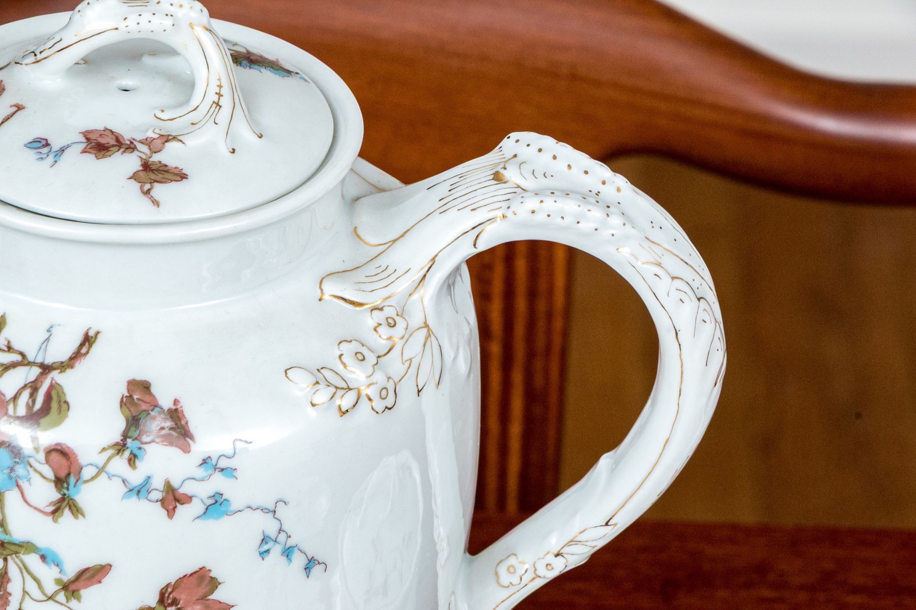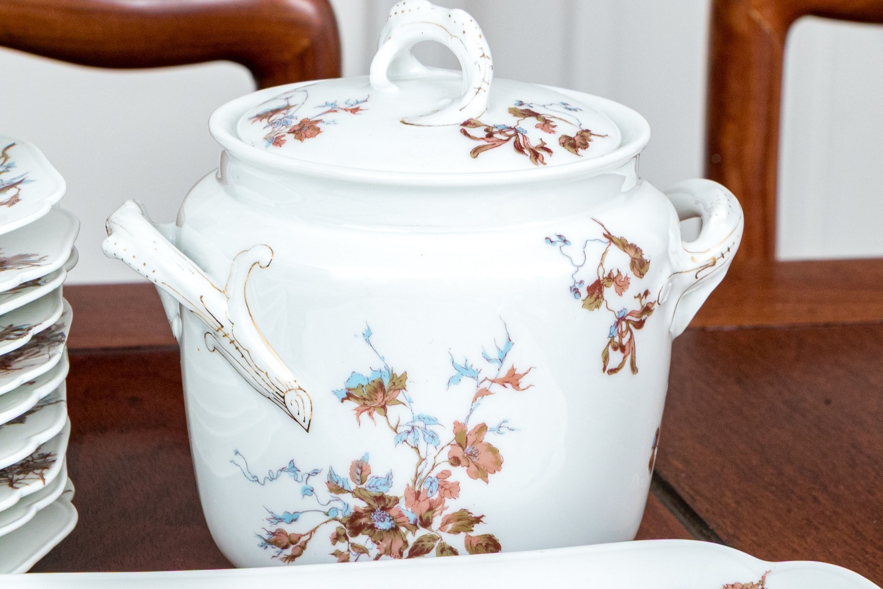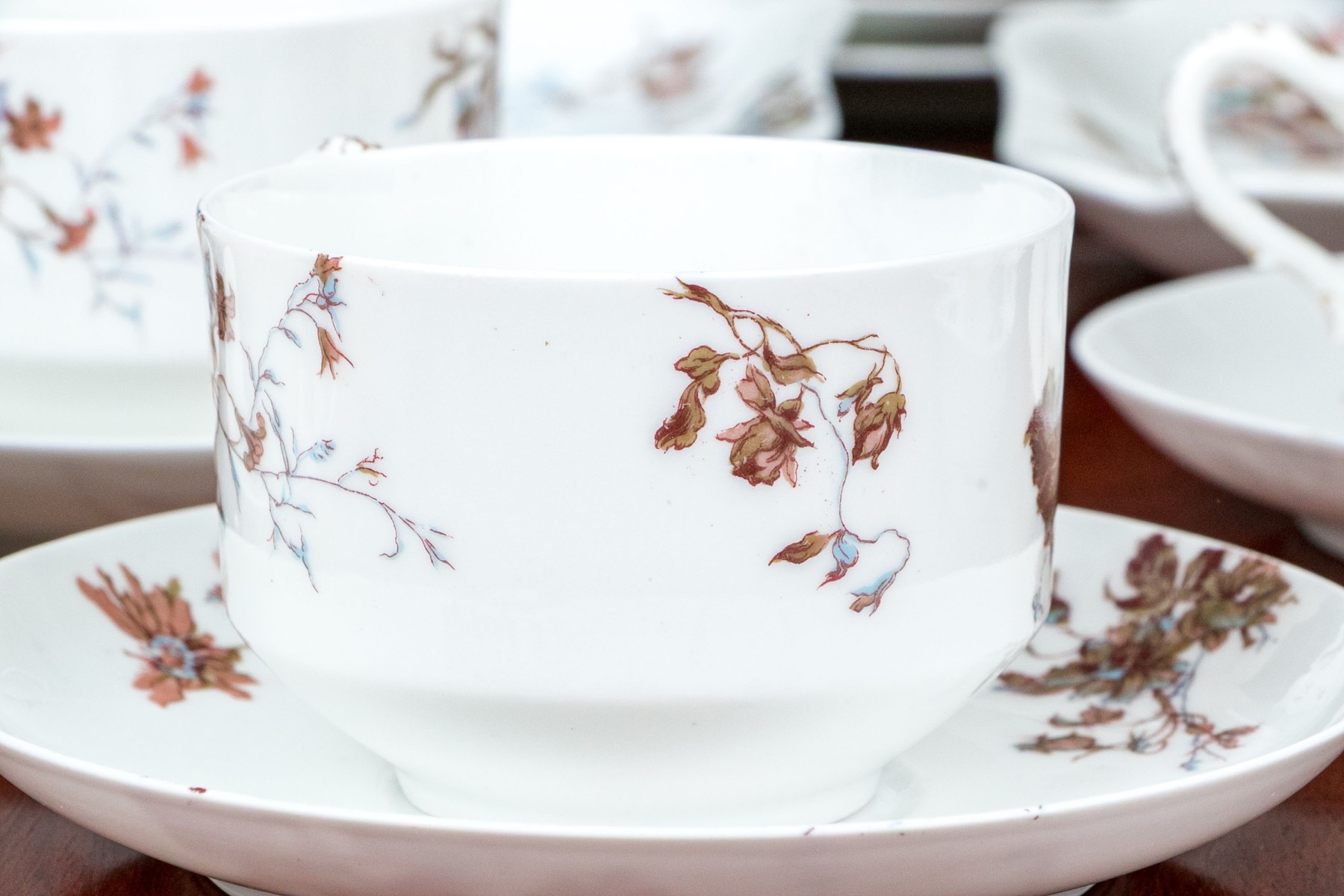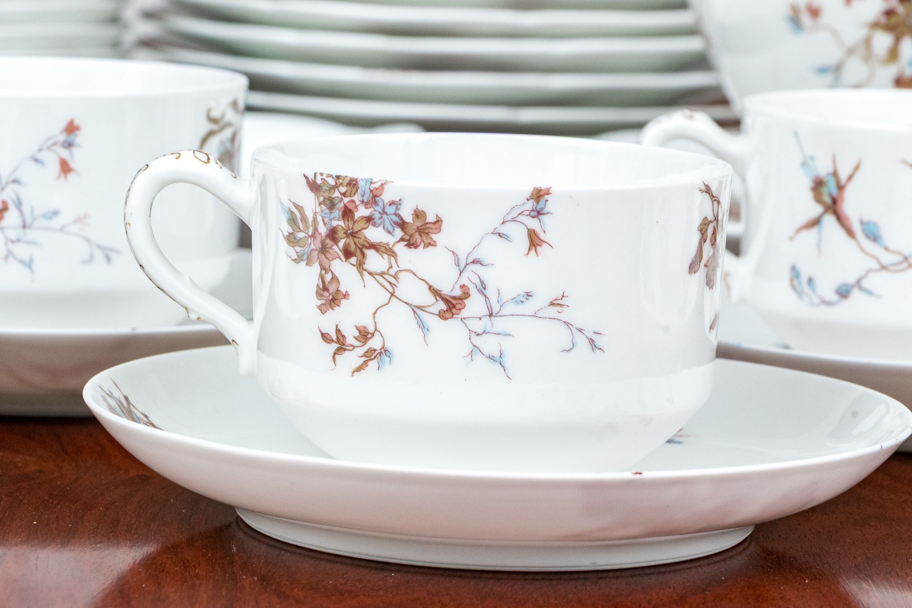 A delightful Haviland & Co Limoges porcelain service showcasing bright white bodies with rotund cylindrical forms on the vessels and scalloped rims on the plates, decorated with dainty blue and brown foliage sprays for an elegant and sophisticated appearance.