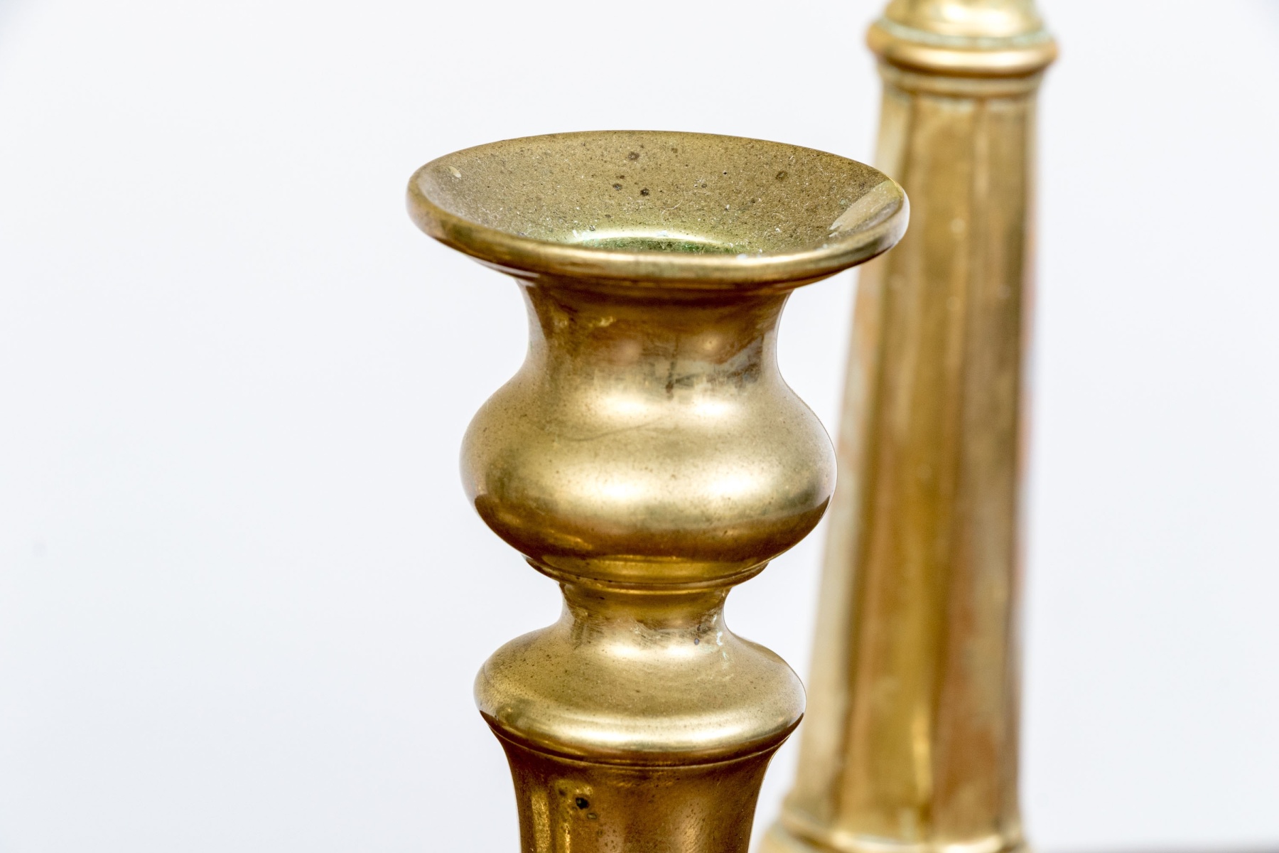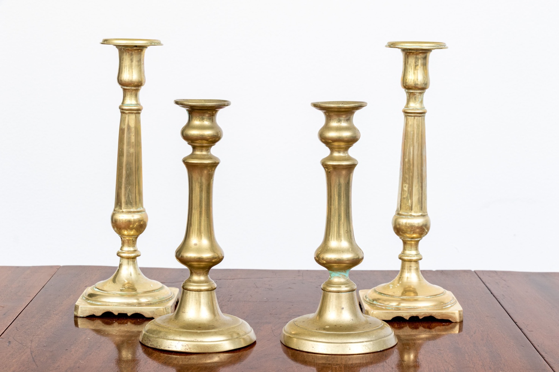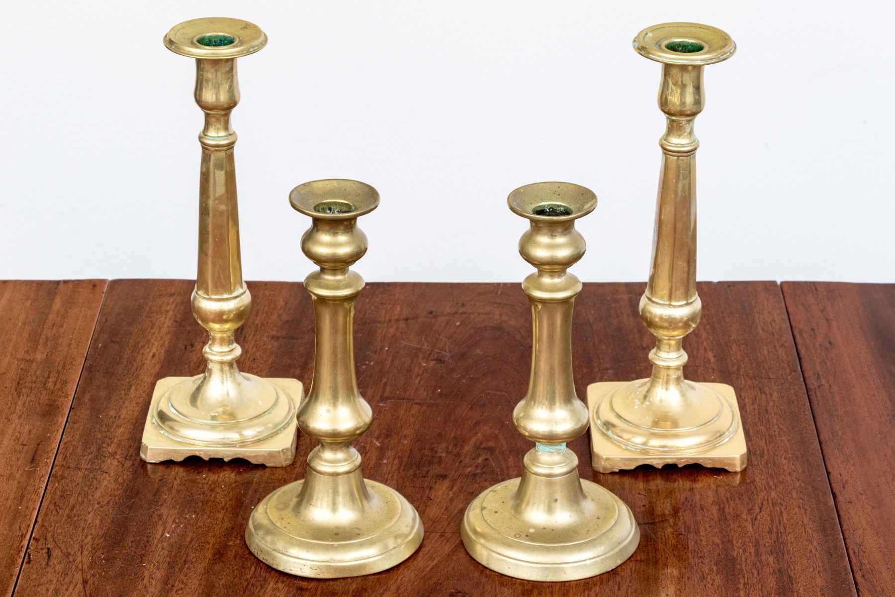 A fabulous collection of 19th century brass candlesticks in two pairs. The first pair sports wide nozzls and elongated capitals leading to faceted and tapered columns with circular bases on squared bracket feet. The second pair features urn form capitals and gently concave curved columns tapering out to bulbous knops over circular feet.