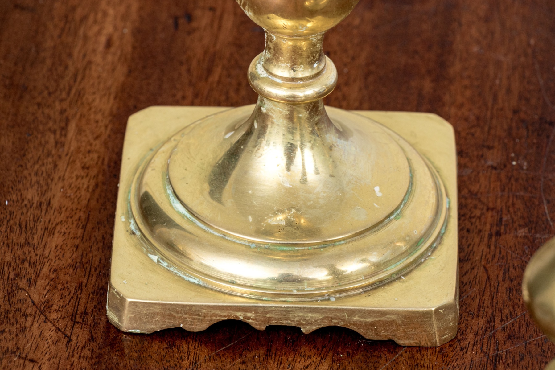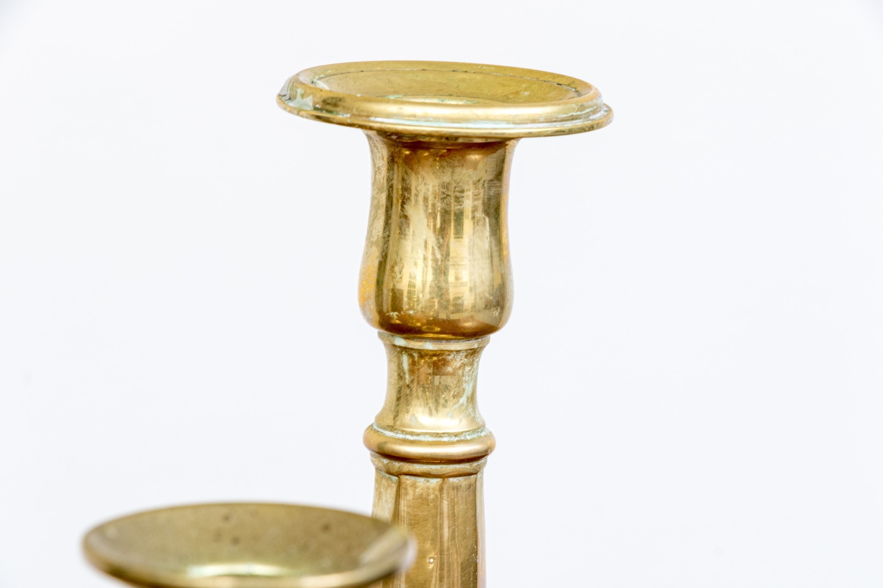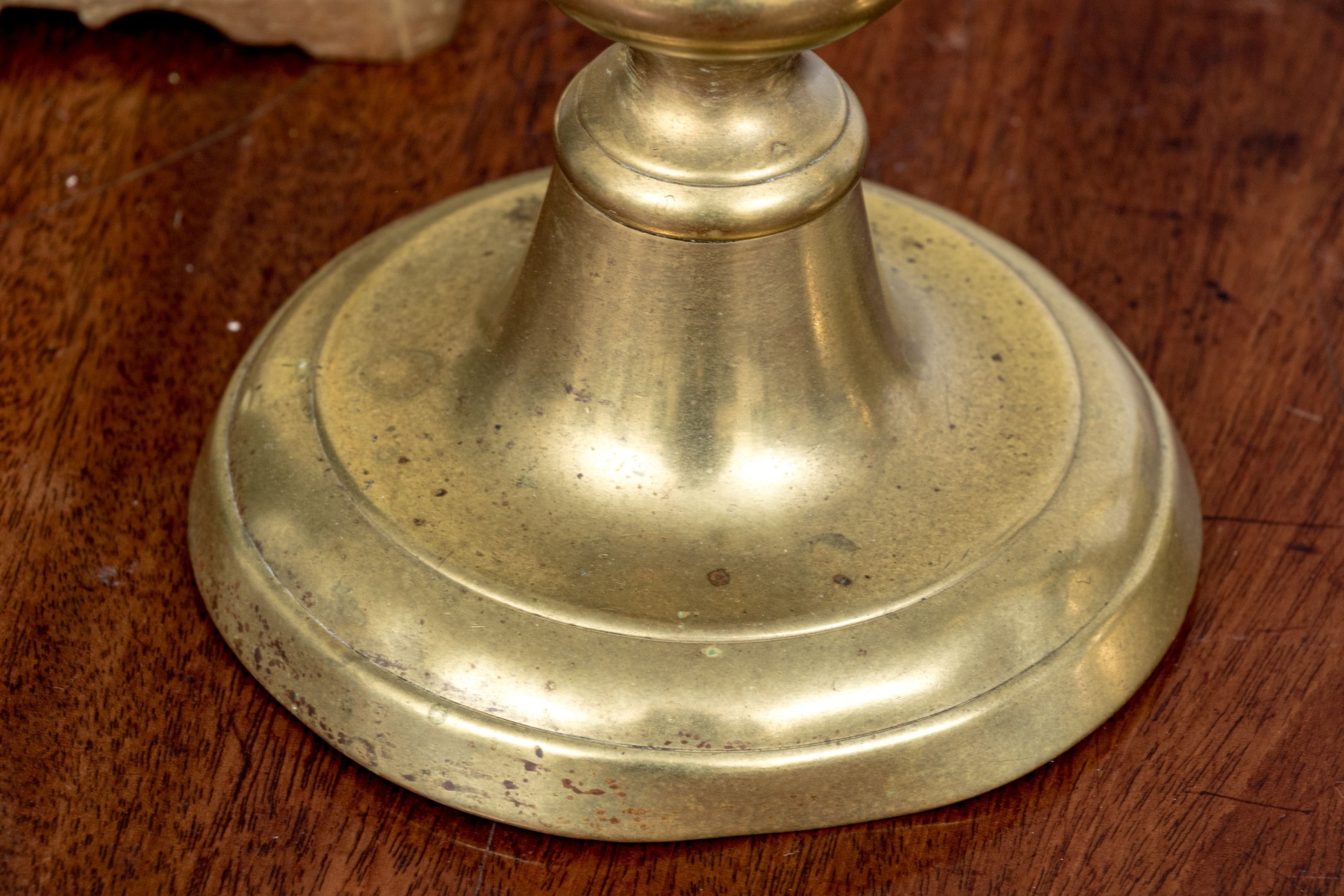 A fabulous collection of 19th century brass candlesticks in two pairs. The first pair sports wide nozzls and elongated capitals leading to faceted and tapered columns with circular bases on squared bracket feet. The second pair features urn form capitals and gently concave curved columns tapering out to bulbous knops over circular feet.