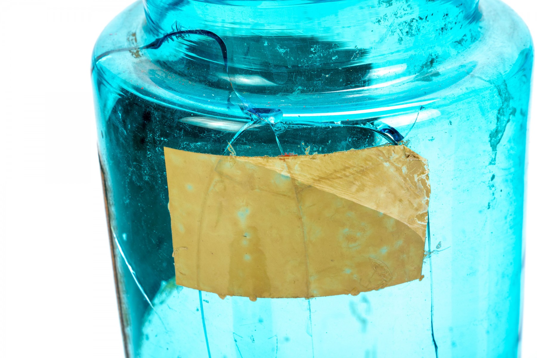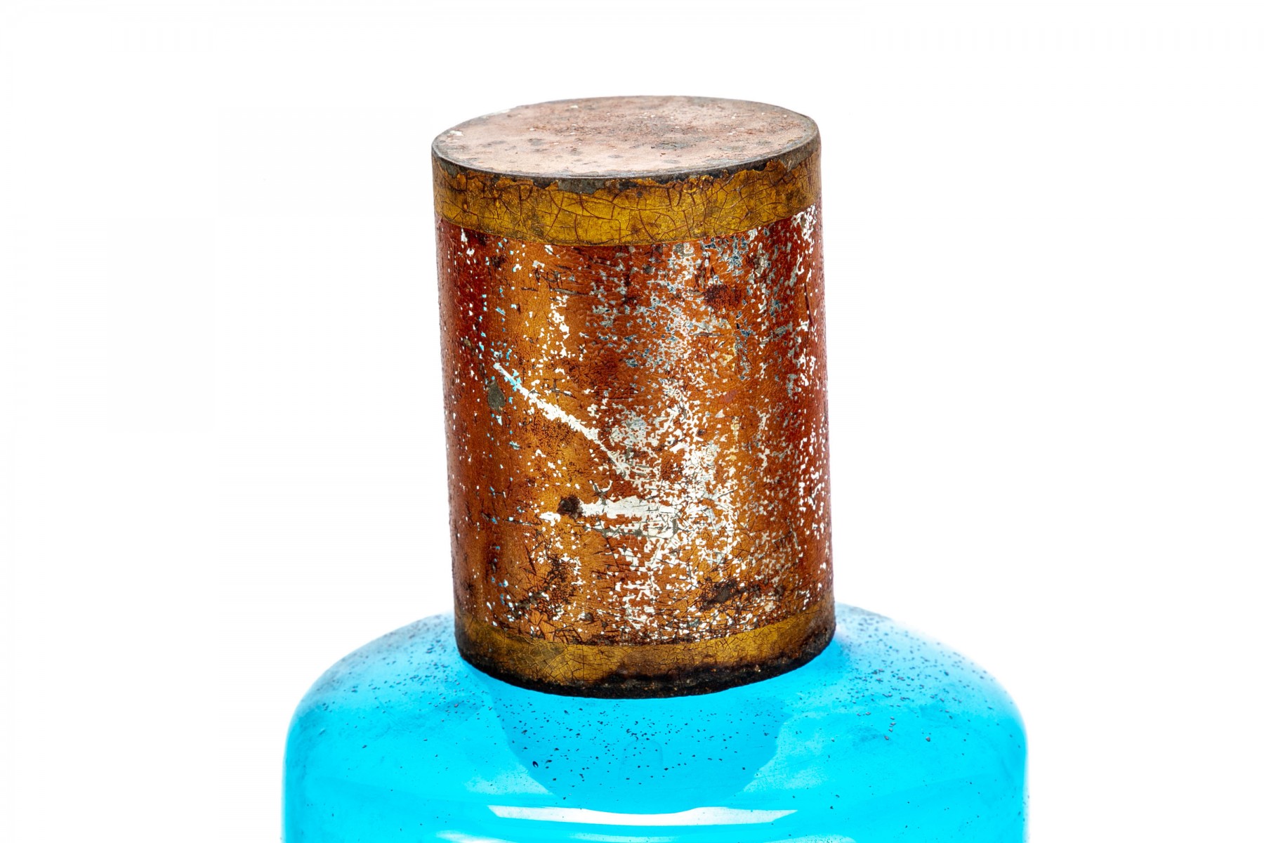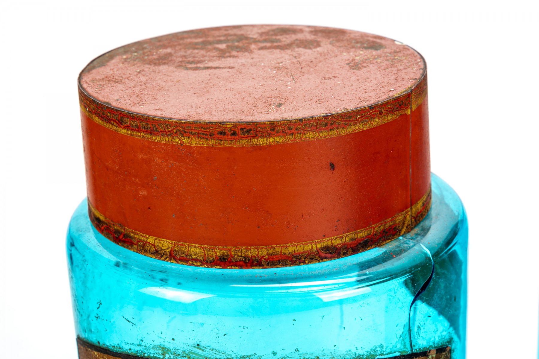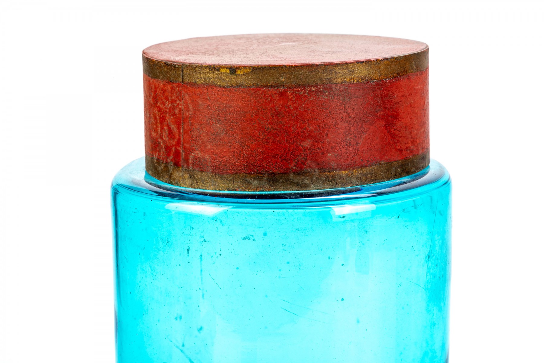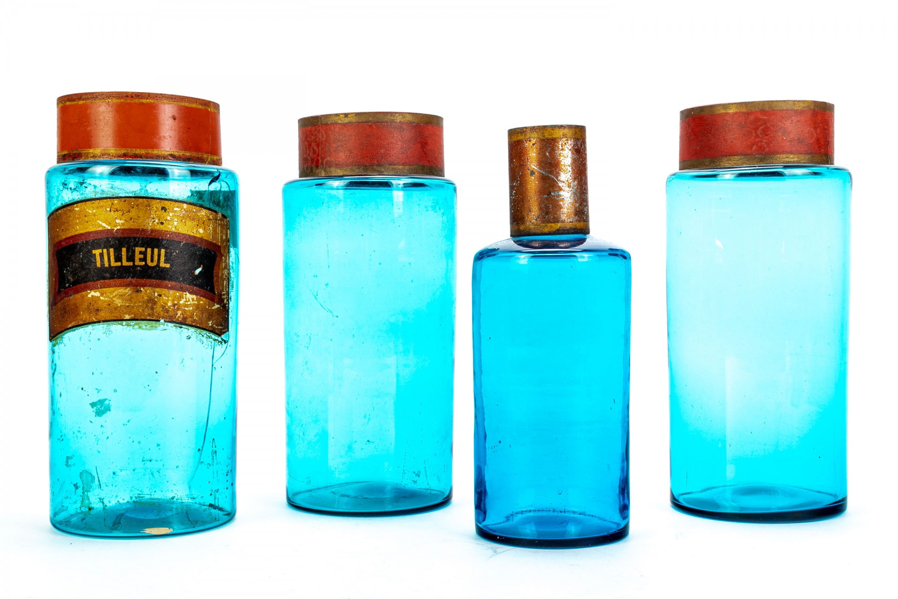 A set of antique apothecary jars in a pretty cerulean like blue hue with red and gold metal tops. Come in two sizes with one jar labeled Tilleul which translates to lime tree.