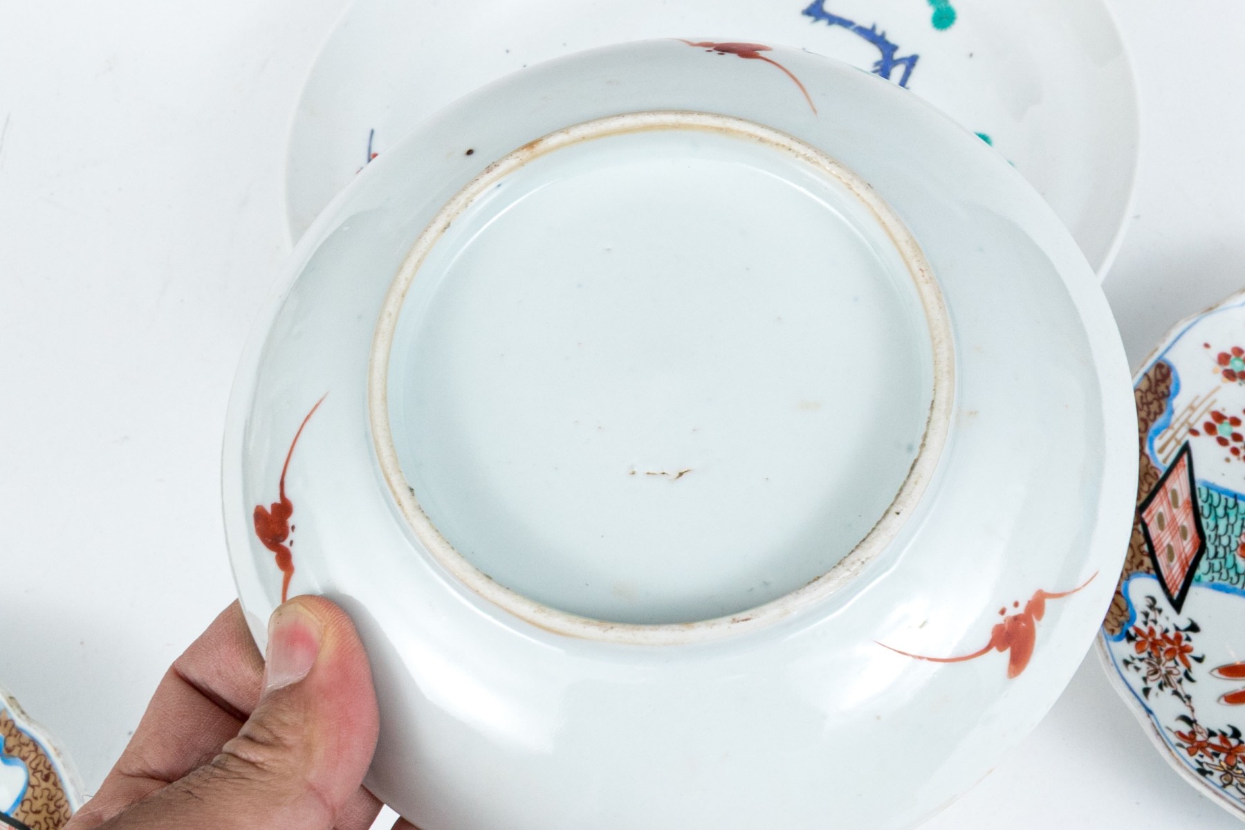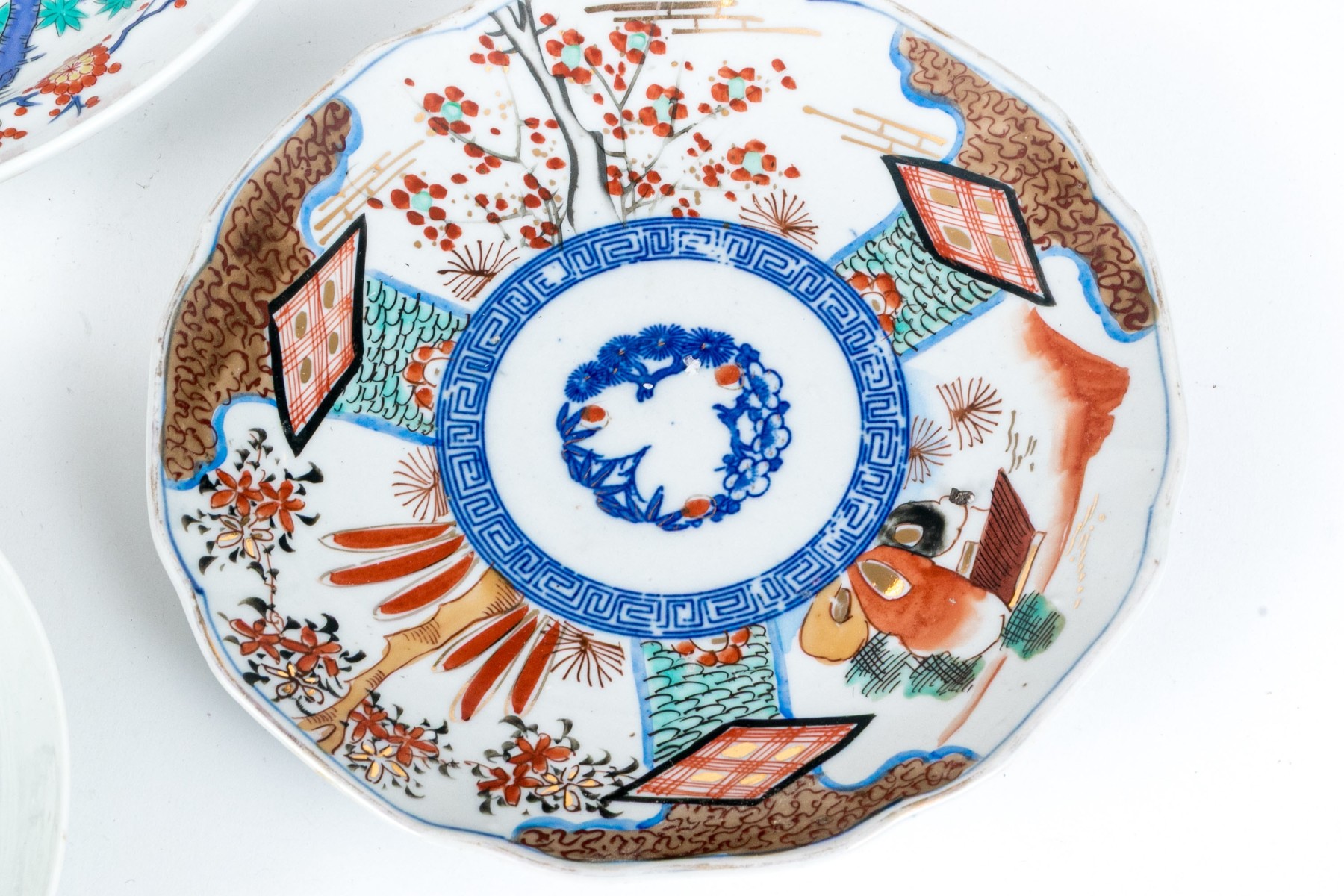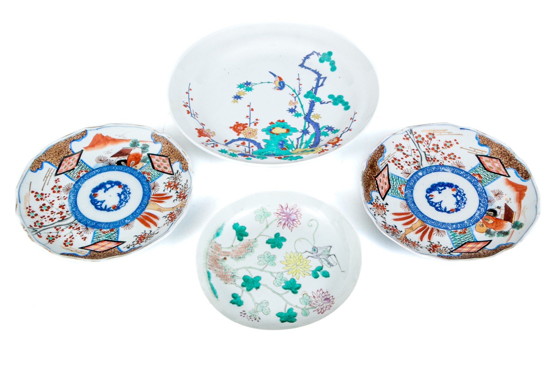 A lovely collection of four Asian porcelain plates with vibrant enameled decoration. Two matching plates feature orange and brown scenes of nature around blue centers. The largest plate features vibrant teal, blue, and orange foliage and rockery. The smallest depict a grasshopper over flowering foliage.