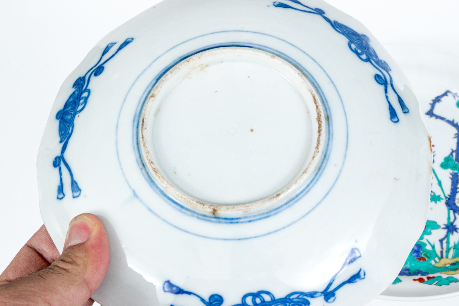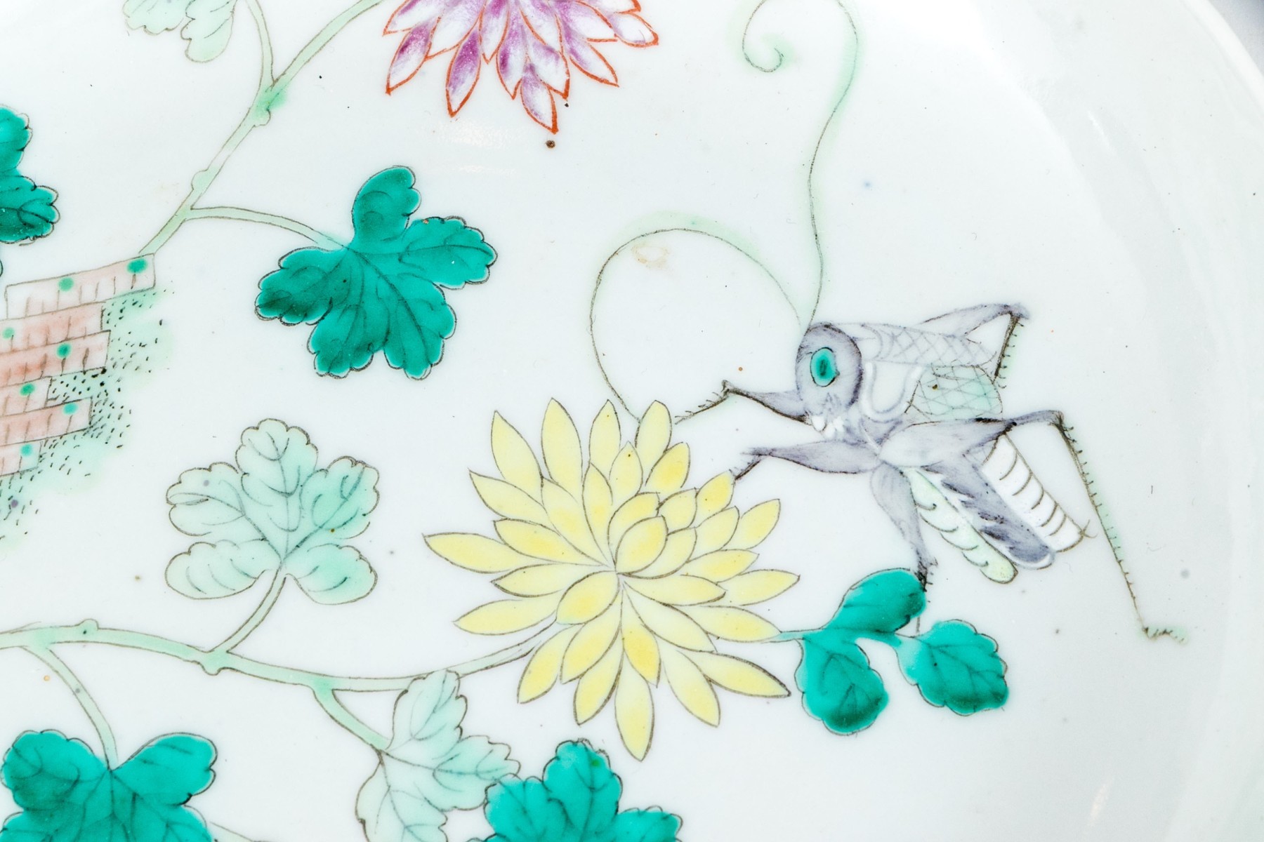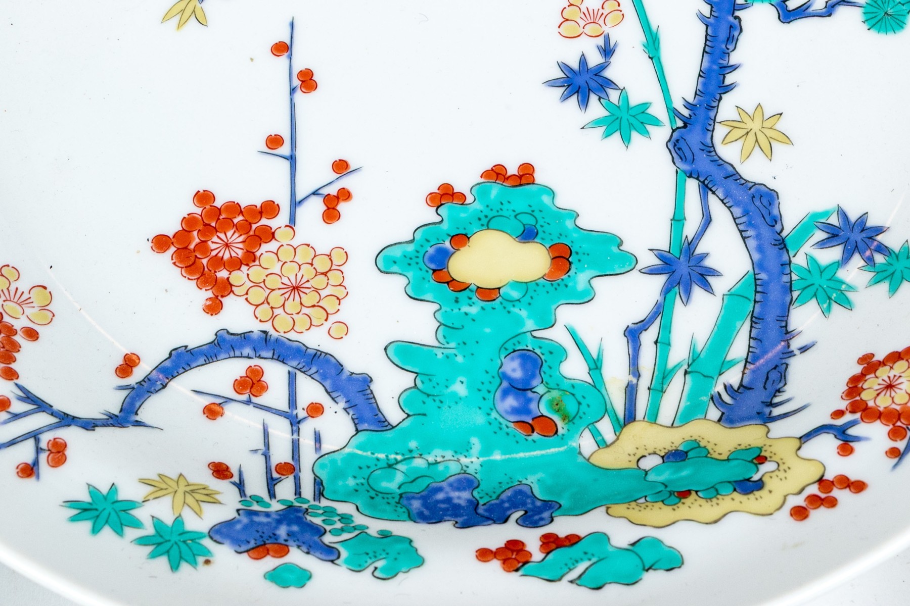 A lovely collection of four Asian porcelain plates with vibrant enameled decoration. Two matching plates feature orange and brown scenes of nature around blue centers. The largest plate features vibrant teal, blue, and orange foliage and rockery. The smallest depict a grasshopper over flowering foliage.