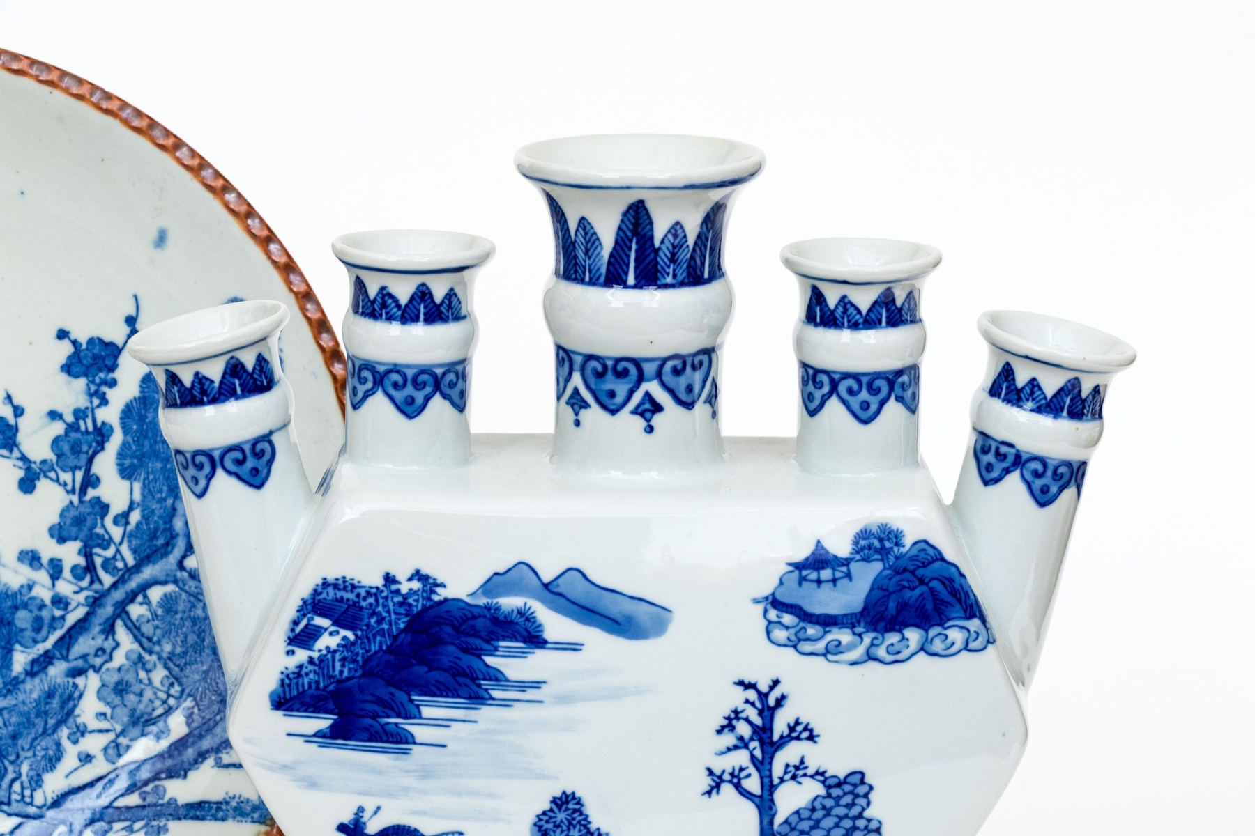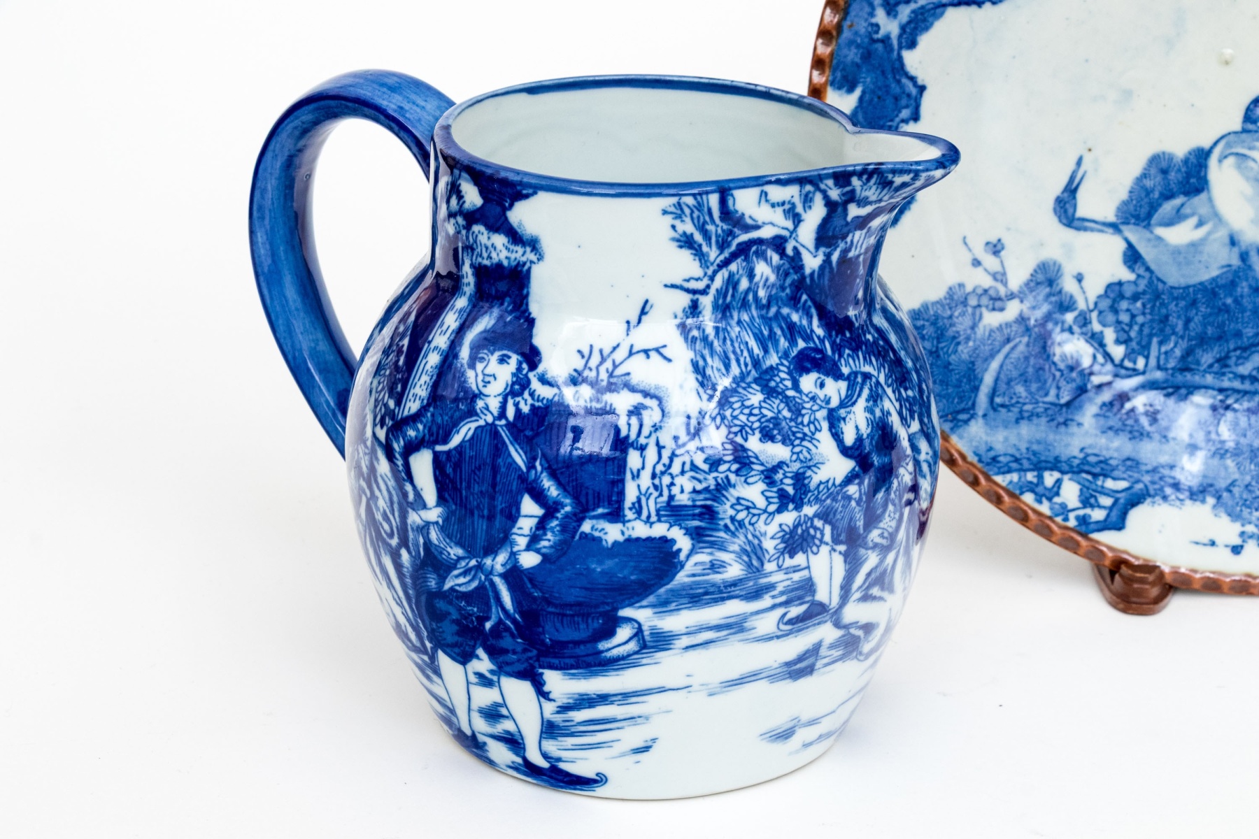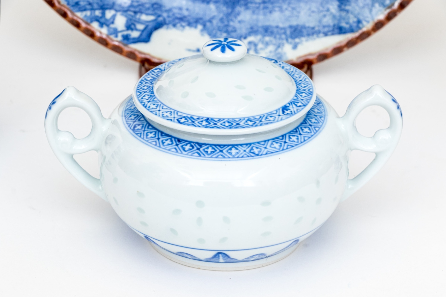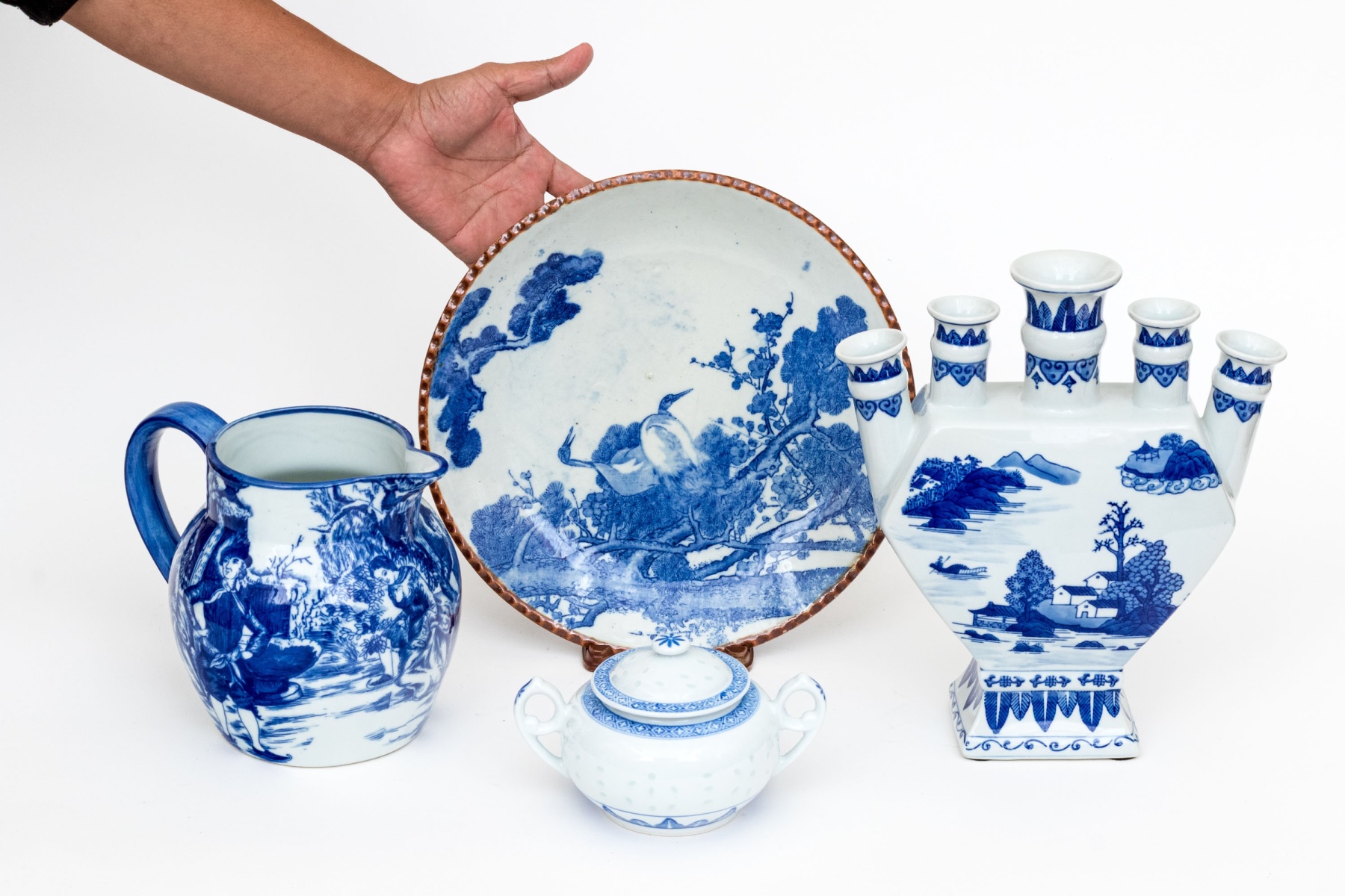 A wonderful collection of blue and white English and Asian ceramics comprised of a five nozzle tulipiere, a Victoria Ware transferware water pitcher, a charger with brown finished textural trim, and a twin-handled and lidded rice pattern sugar bowl.