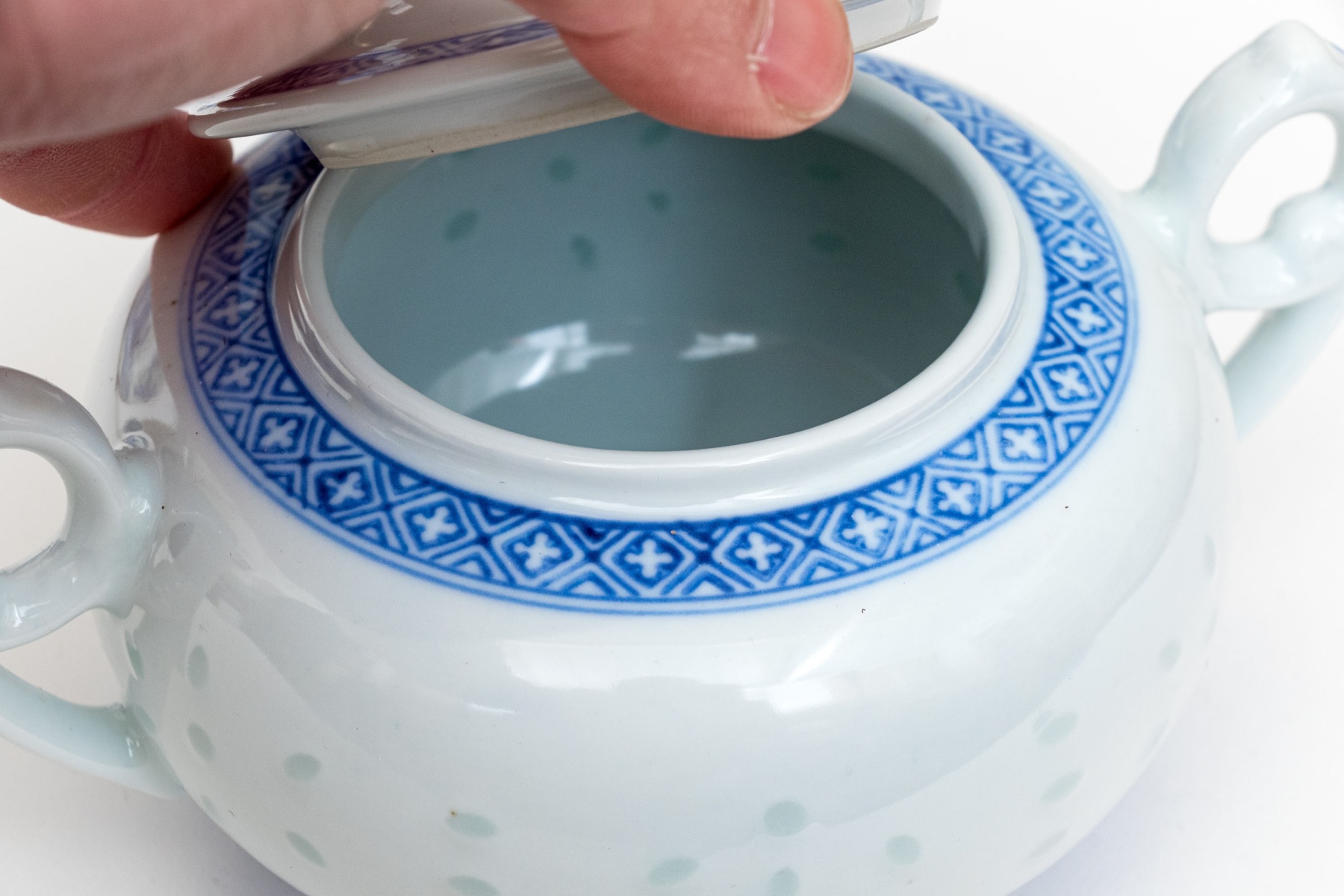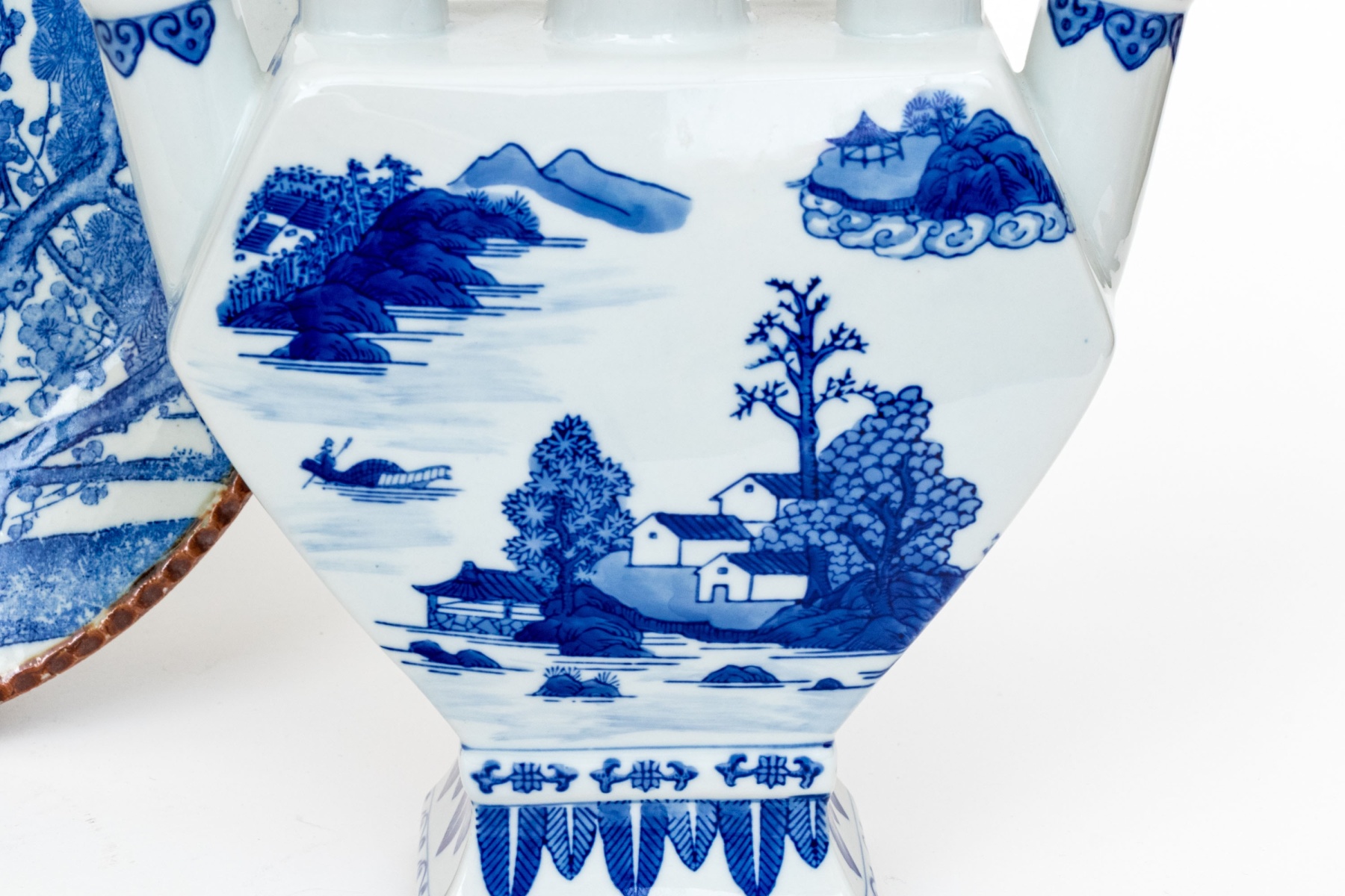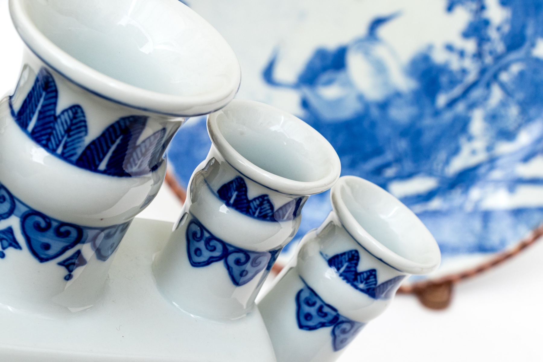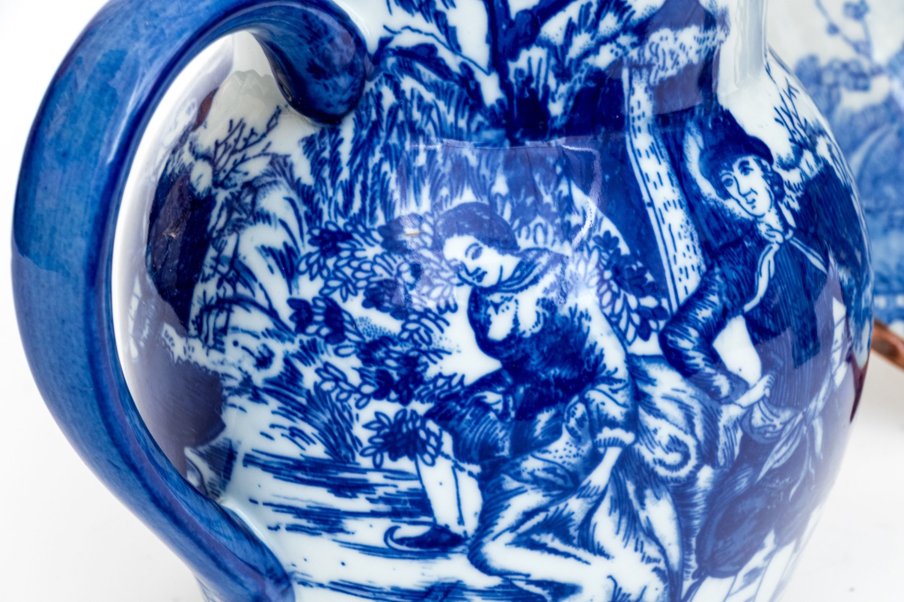A wonderful collection of blue and white English and Asian ceramics comprised of a five nozzle tulipiere, a Victoria Ware transferware water pitcher, a charger with brown finished textural trim, and a twin-handled and lidded rice pattern sugar bowl.