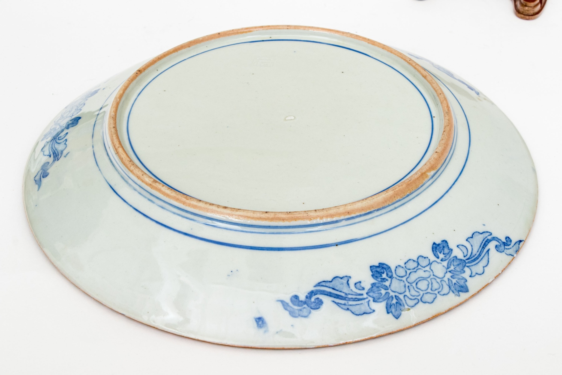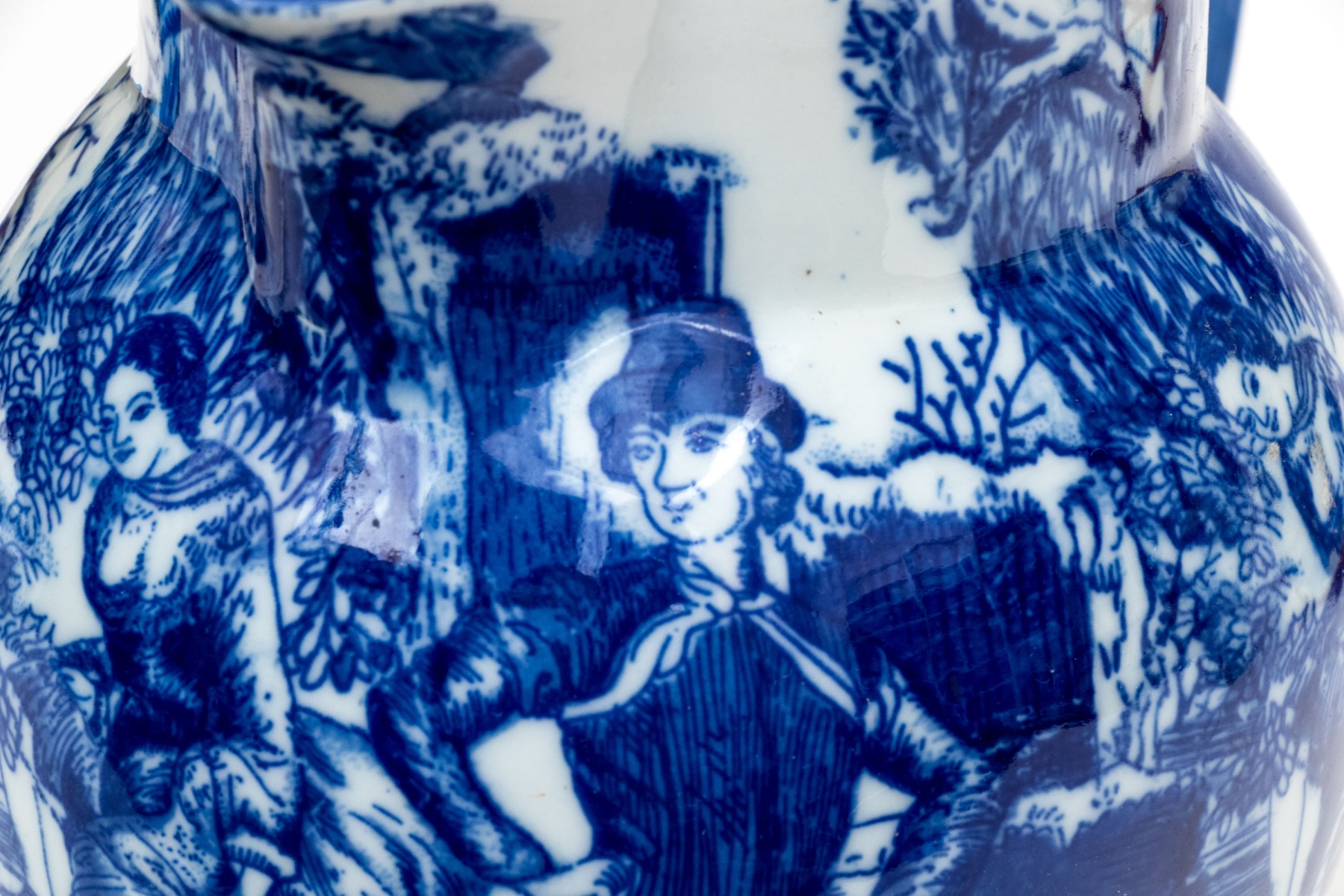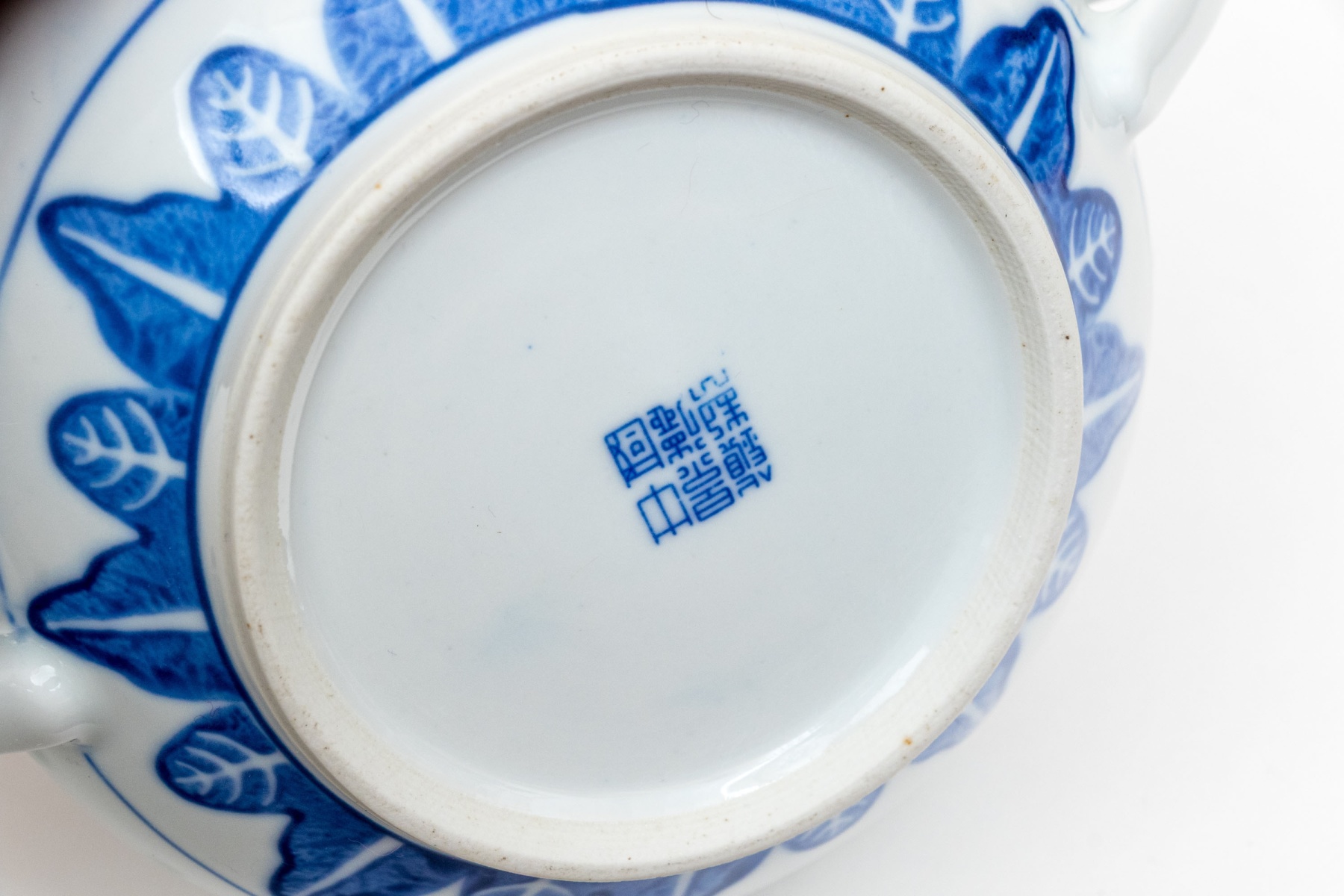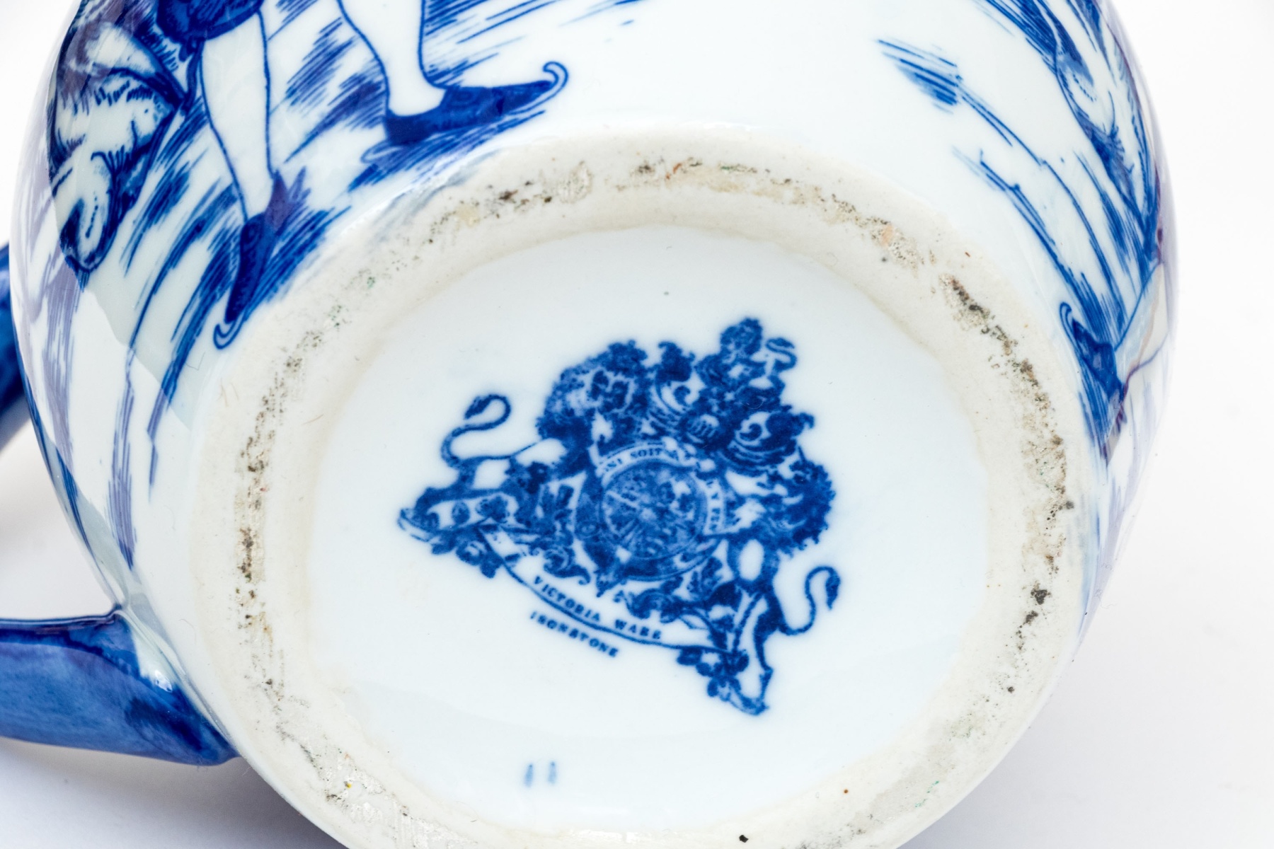 A wonderful collection of blue and white English and Asian ceramics comprised of a five nozzle tulipiere, a Victoria Ware transferware water pitcher, a charger with brown finished textural trim, and a twin-handled and lidded rice pattern sugar bowl.