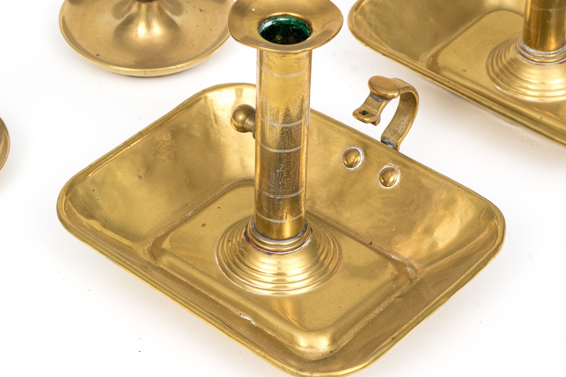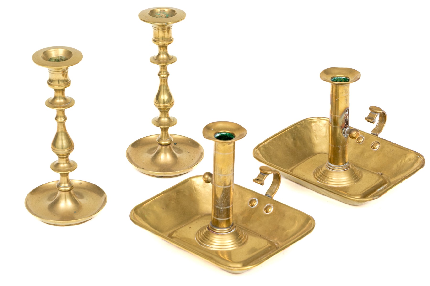 A lovely group of brass candlesticks comprised of a pair of square chamber sticks with rectangular bowls, together with a pair of candlesticks.