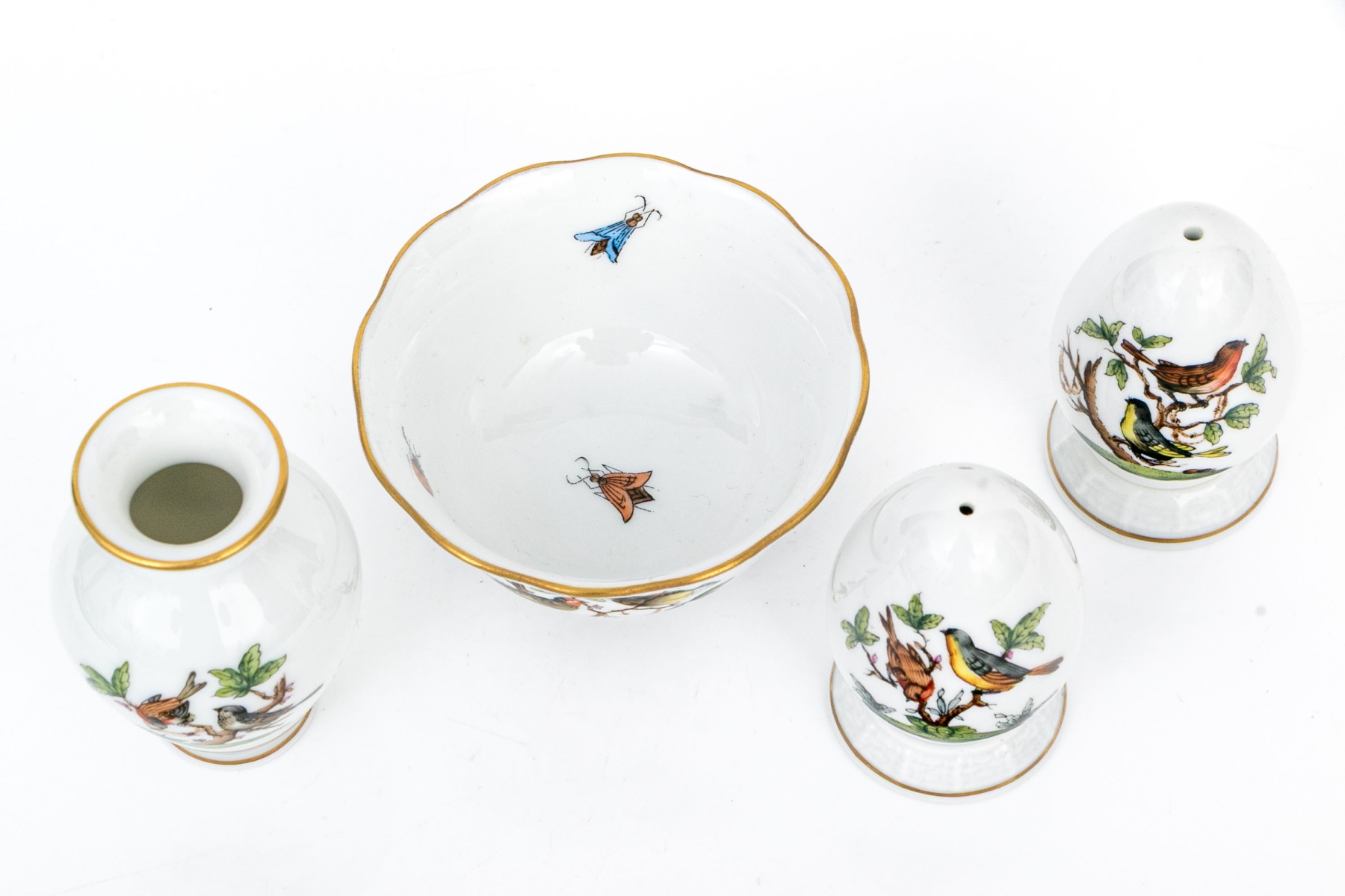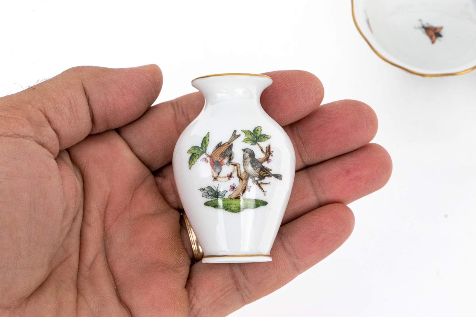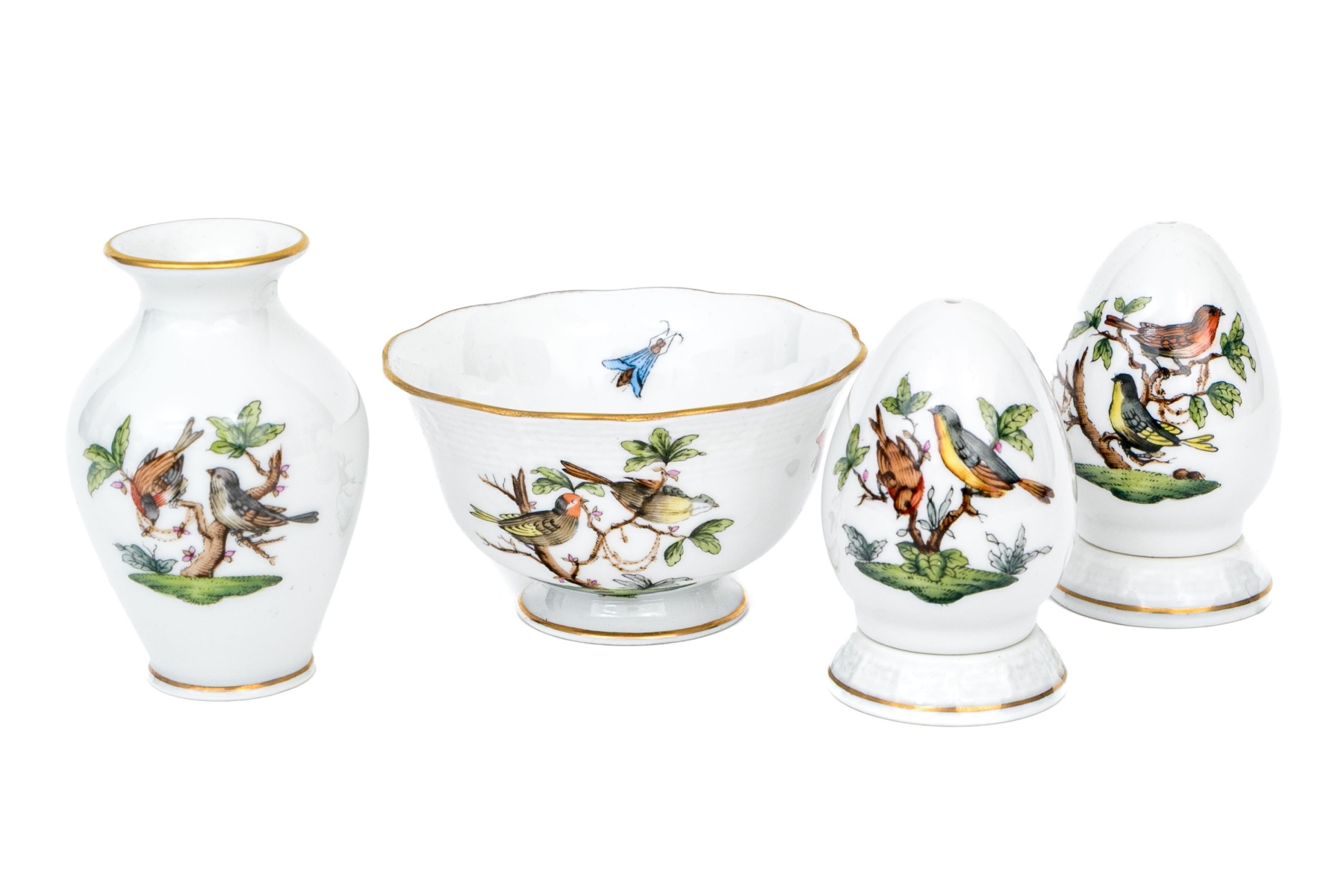 A charming set of four Herend Hungary hand-painted porcelain pieces in the Rothschild Bird (RO) pattern, featuring a miniature vase, small bowl, and a pair of salt and pepper shakers. Each is exquisitely hand-decorated with the Rothschild birds perched among leafy branches, accompanied by colorful butterflies on the reverse, and detailed with 24K gold accents. The vase and bowl display the Rothschild bird scenes framed in classic raised basketweave borders, while the egg-form shakers each feature a charming bird scene on one side and butterflies on the other. The interiors and undersides are finished in bright white glaze, and each piece bears the blue Herend Hungary shield mark, HANDPAINTED, along with their individual form numbers.