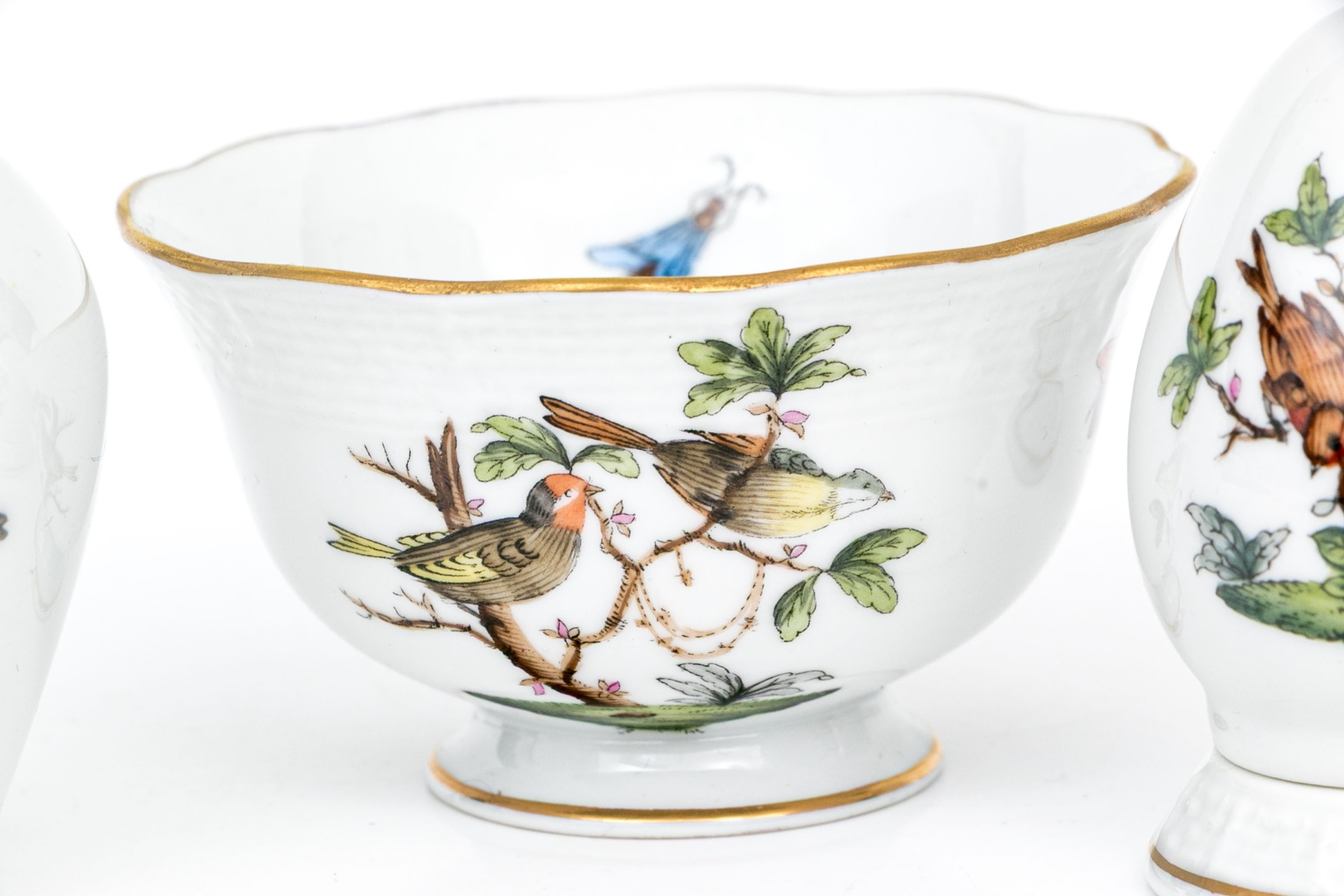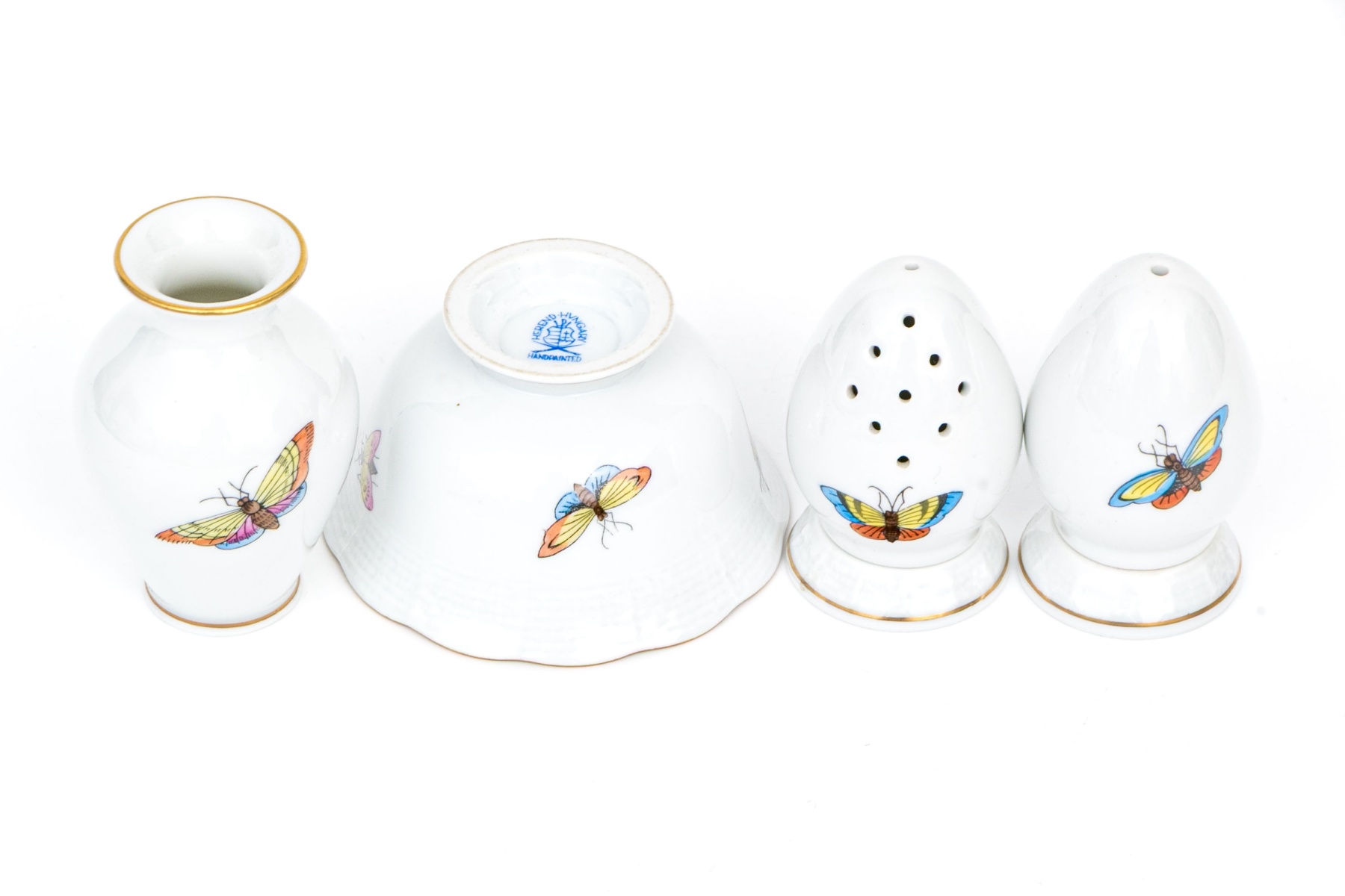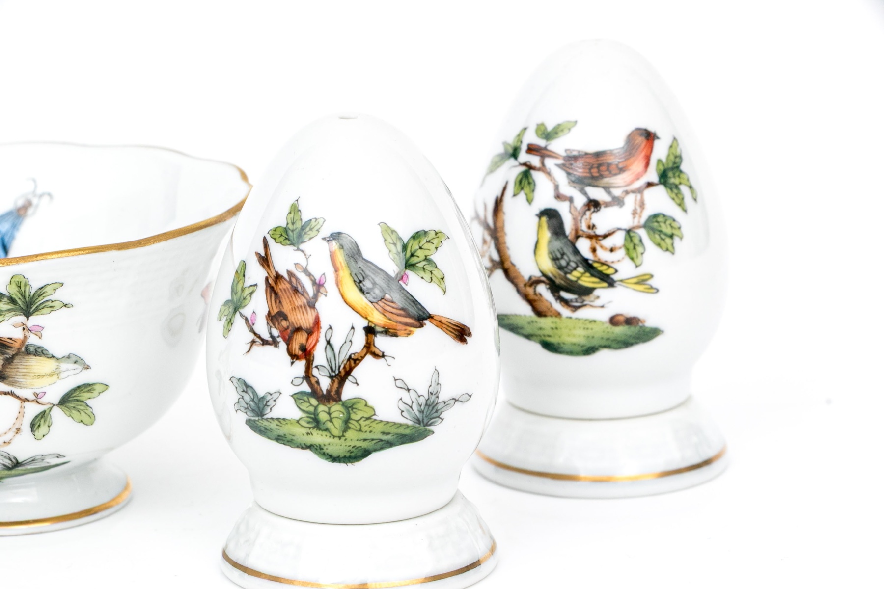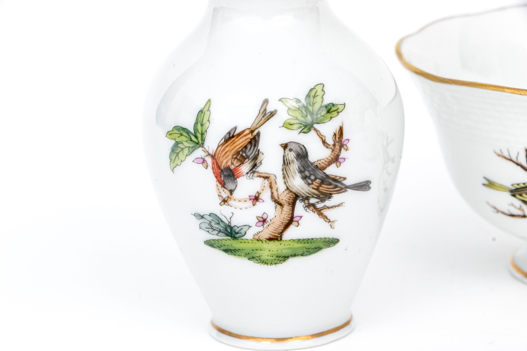 A charming set of four Herend Hungary hand-painted porcelain pieces in the Rothschild Bird (RO) pattern, featuring a miniature vase, small bowl, and a pair of salt and pepper shakers. Each is exquisitely hand-decorated with the Rothschild birds perched among leafy branches, accompanied by colorful butterflies on the reverse, and detailed with 24K gold accents. The vase and bowl display the Rothschild bird scenes framed in classic raised basketweave borders, while the egg-form shakers each feature a charming bird scene on one side and butterflies on the other. The interiors and undersides are finished in bright white glaze, and each piece bears the blue Herend Hungary shield mark, HANDPAINTED, along with their individual form numbers.