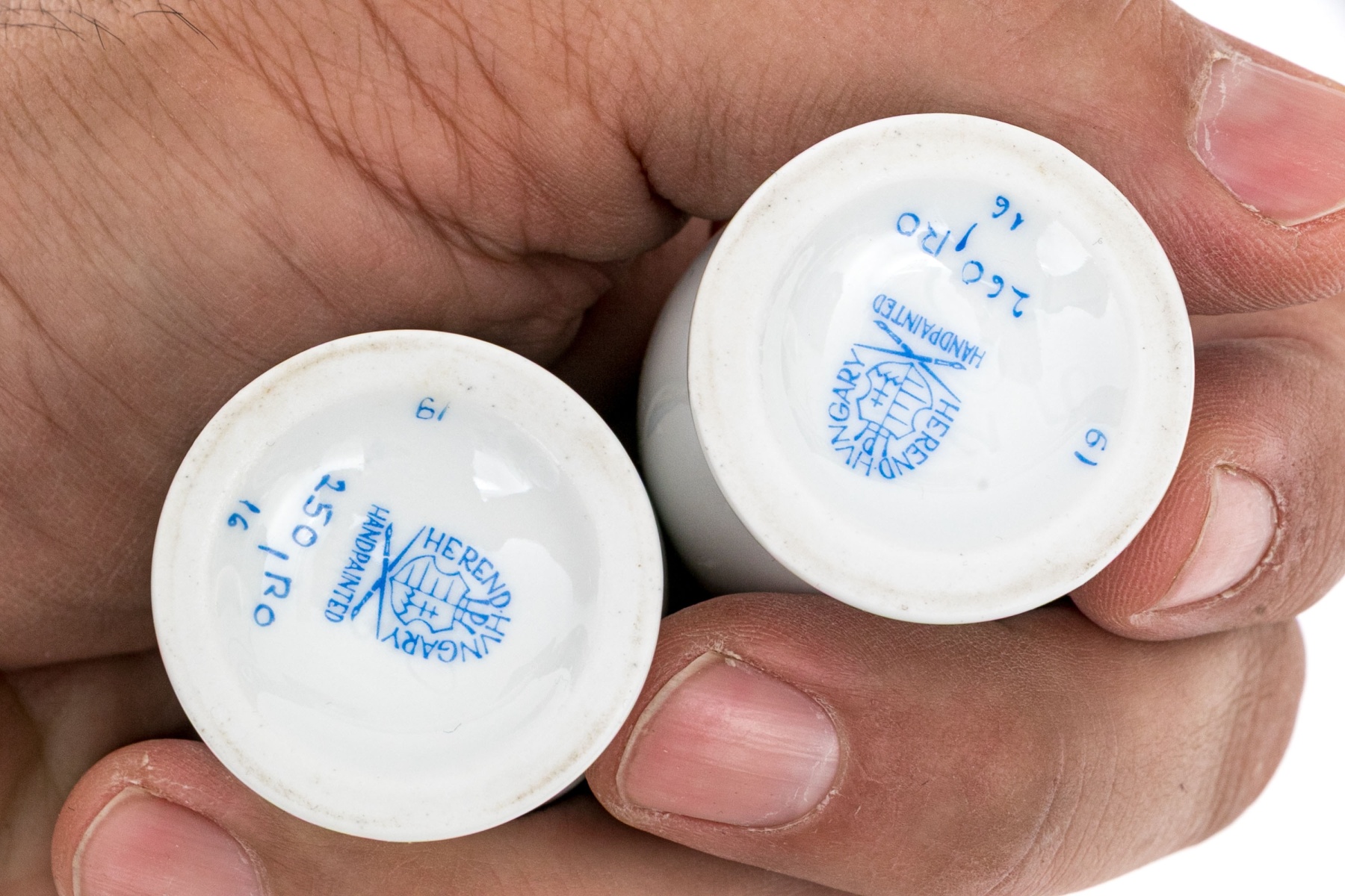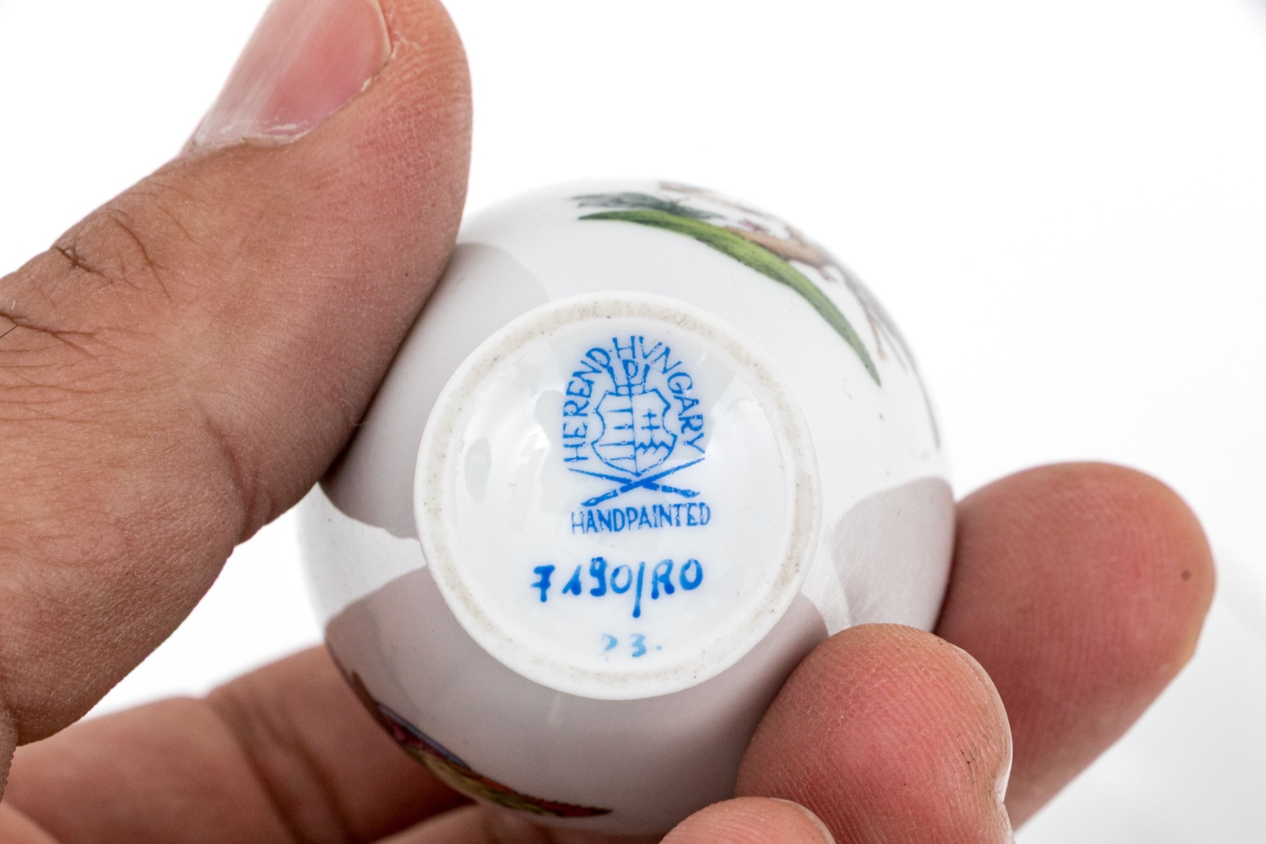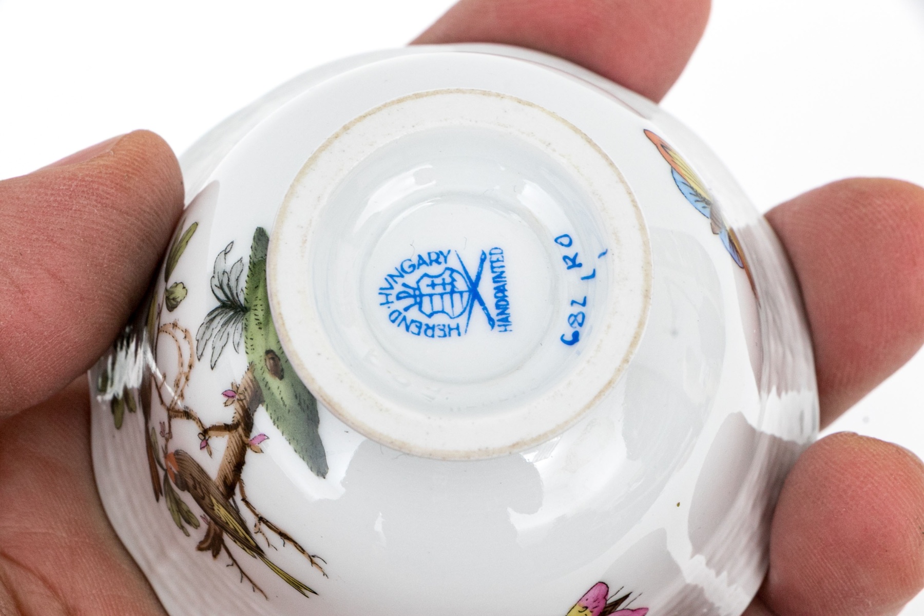 Condition: Excellent overall condition. All pieces are free of chips, cracks, or repairs. The hand-painted designs remain vibrant, and the gilt trim is crisp and intact with only minimal wear from display. The interiors are clean and glossy, and the bases retain clear Herend markings.