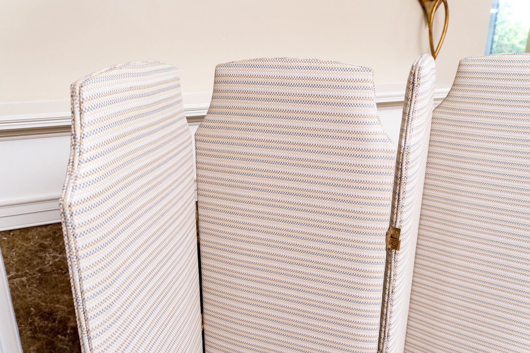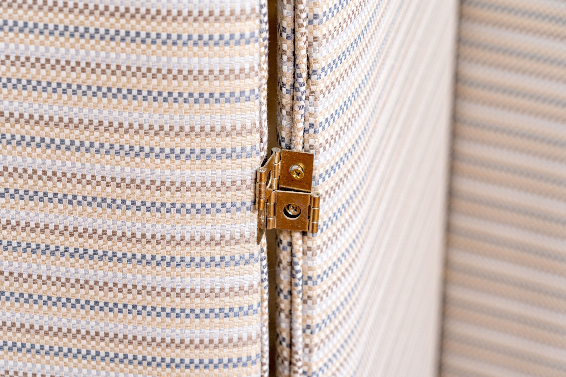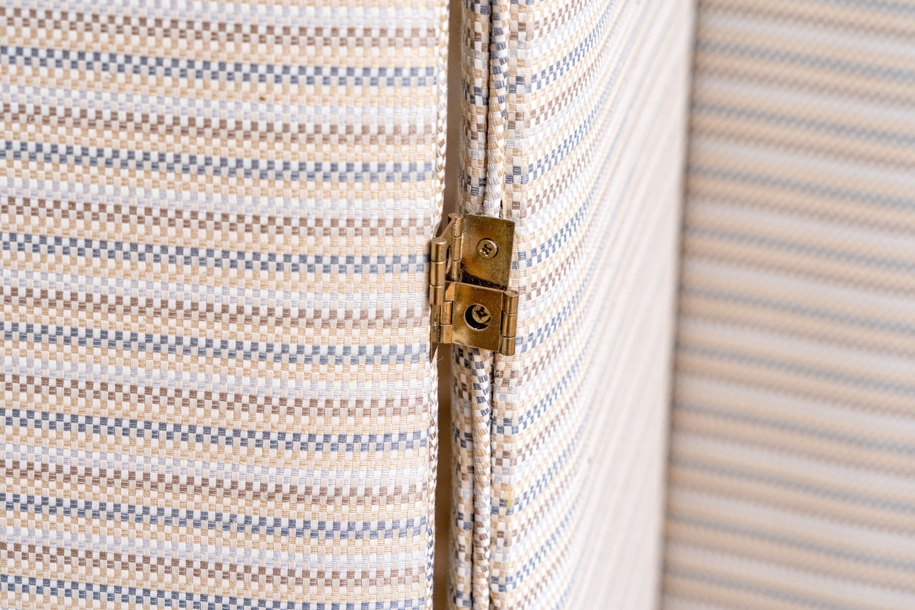 A fabulous folding screen with four panels upholstered in white, brown, yellow, and blue striped fabric with brass hinges in between.