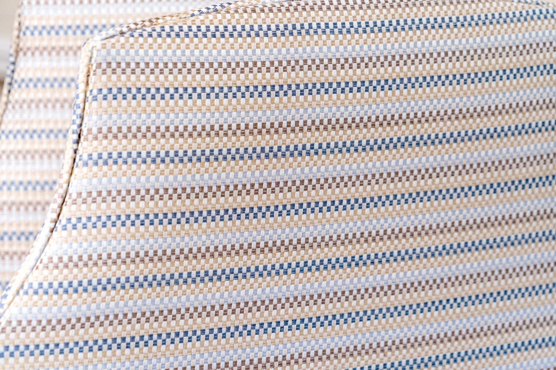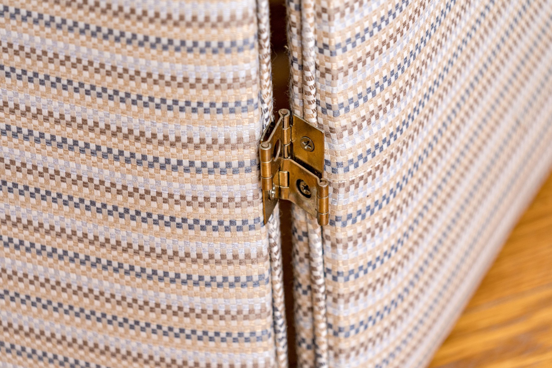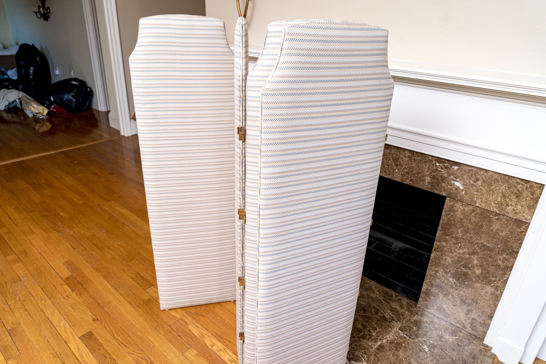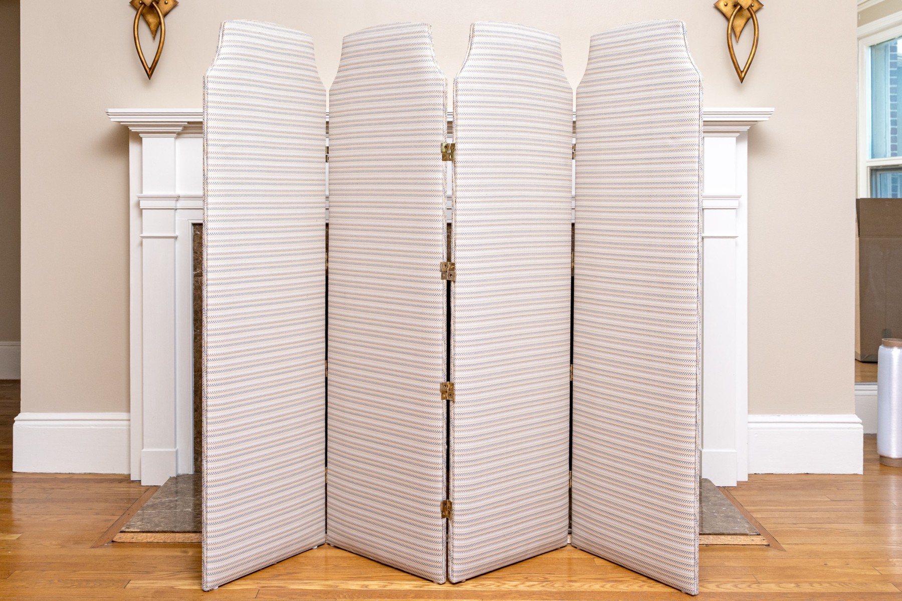 A fabulous folding screen with four panels upholstered in white, brown, yellow, and blue striped fabric with brass hinges in between.
