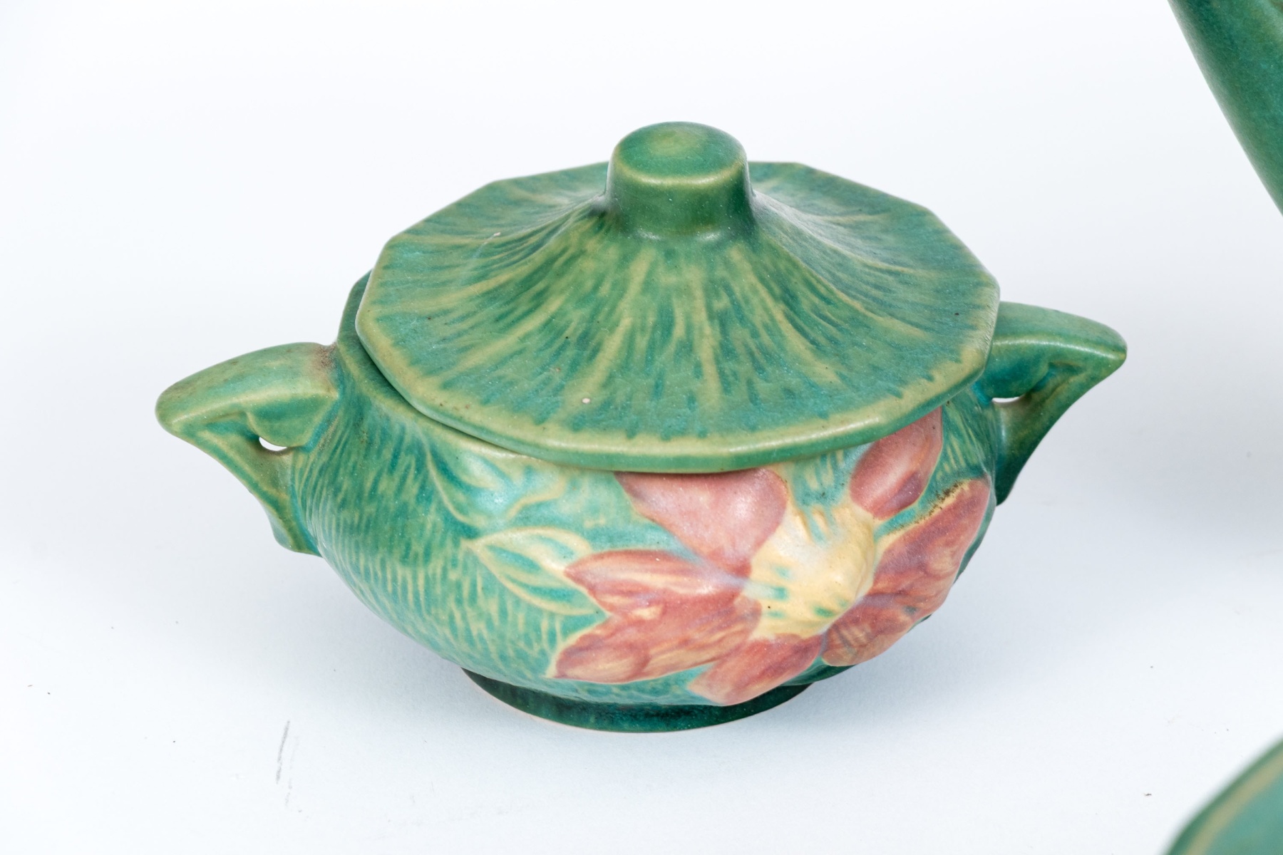 Large teapot, lidded twin handled sugar, creamer and twin handled serving bowl. Signed underfoot.