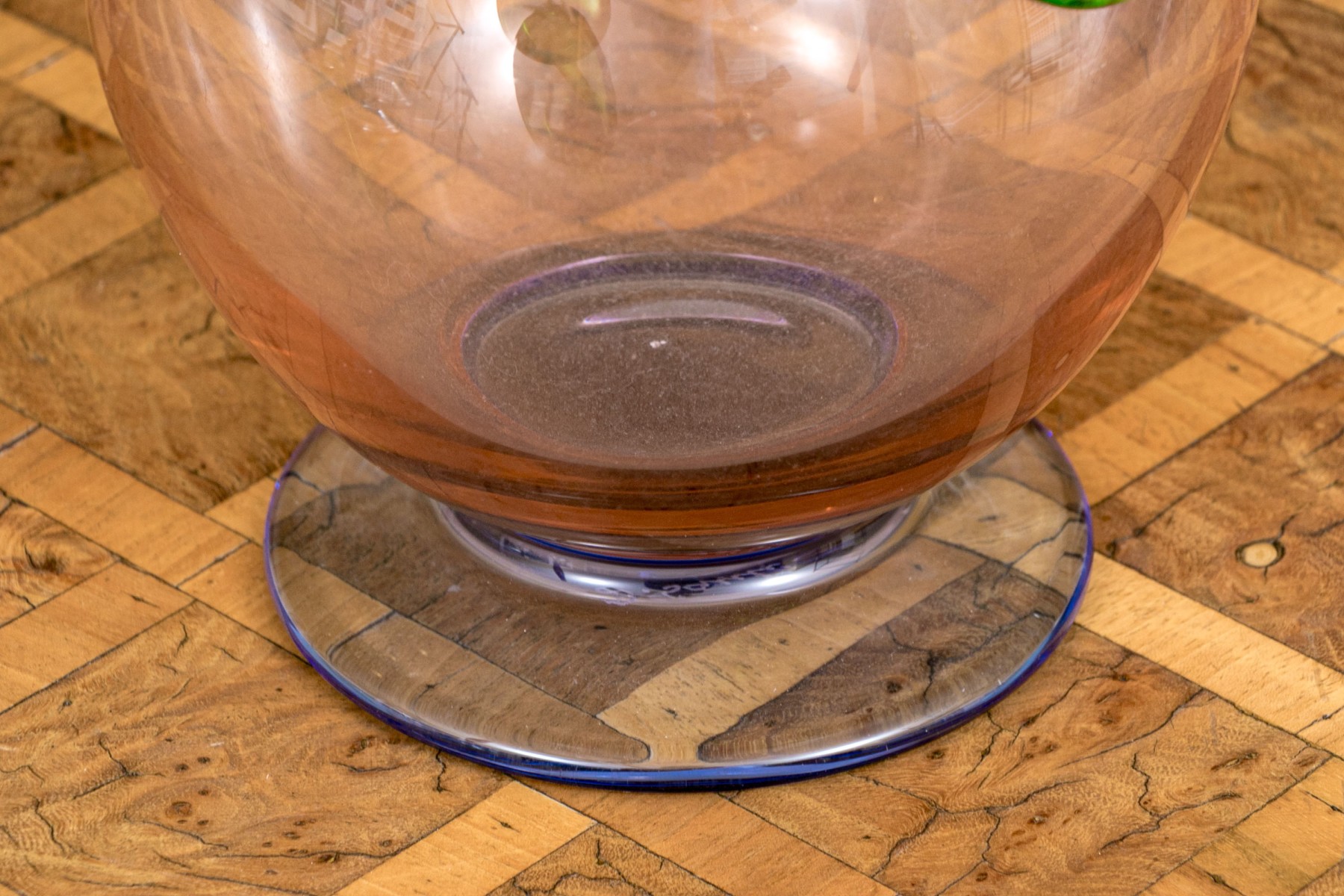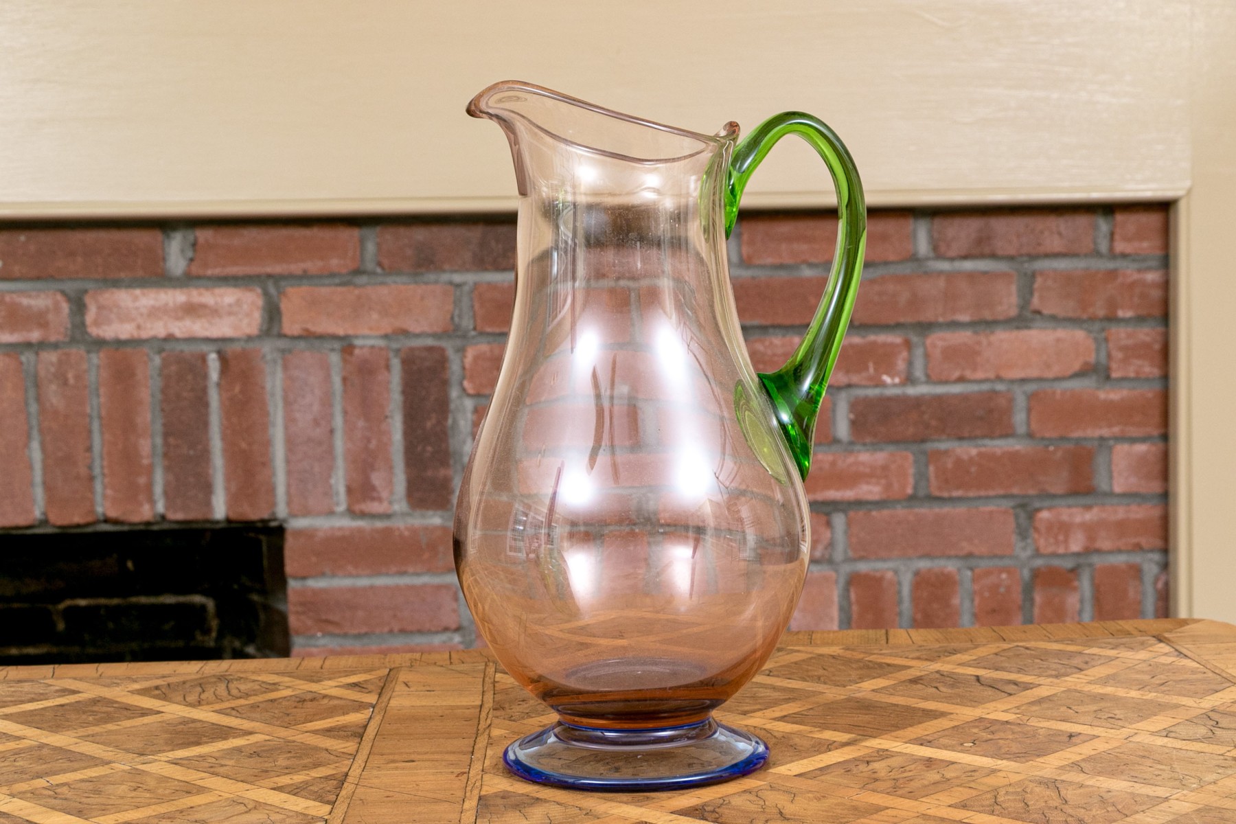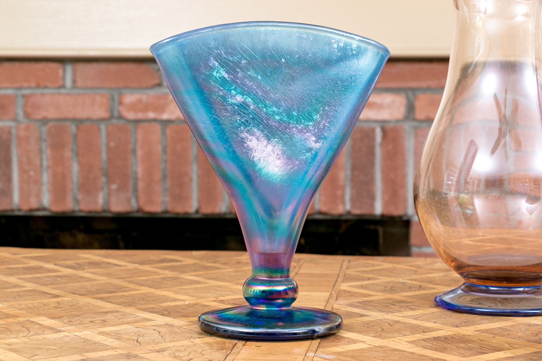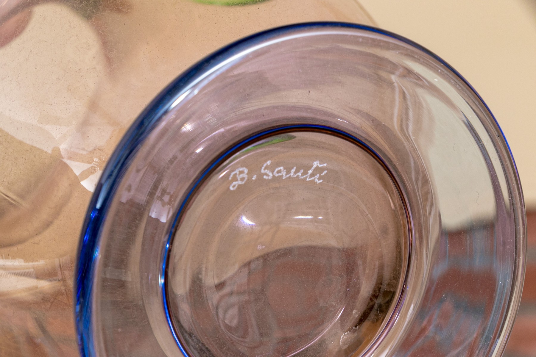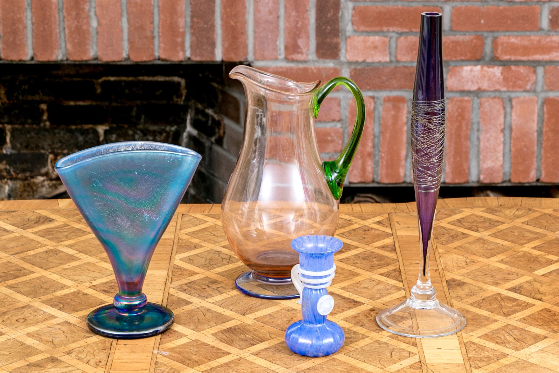 The tall purple vase is signed on the base, 14 1/2” high, pitcher is signed 11” high, blue hand blown vase 5”, stretch glass vintage fan vase 8 1/2”