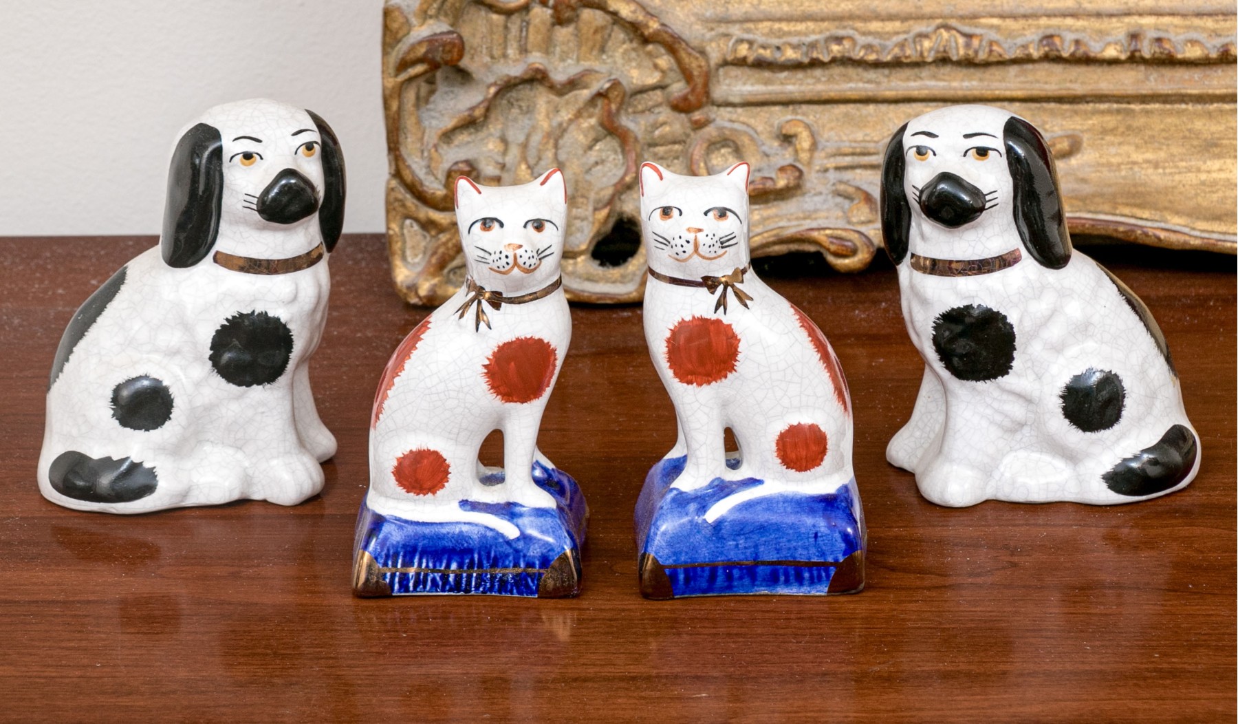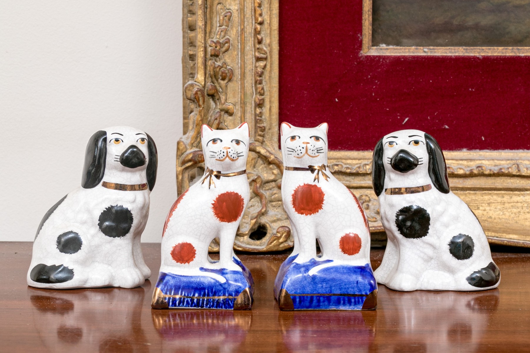 Four Reproduction English Staffordshire Animals Including Pair Of Spaniels And A Pair Of Cats.