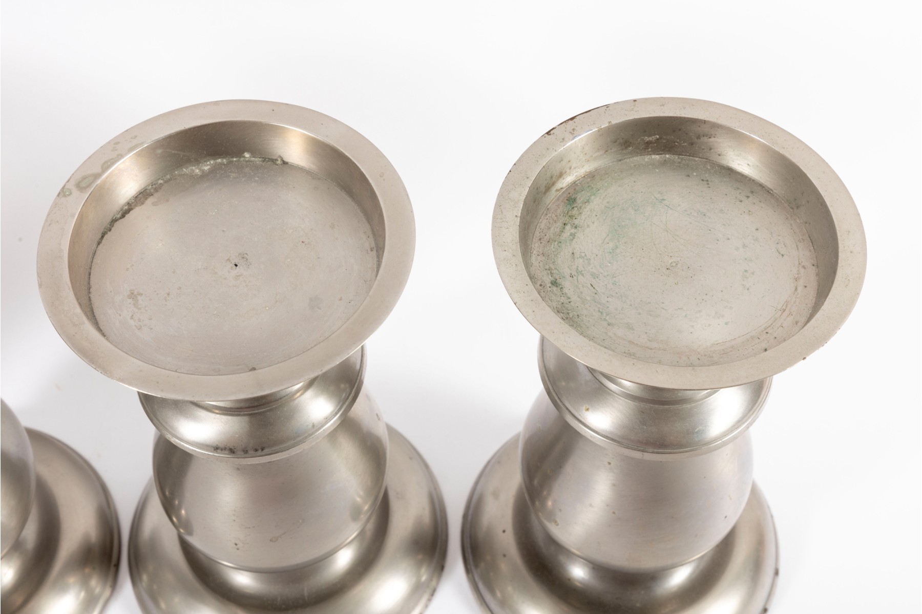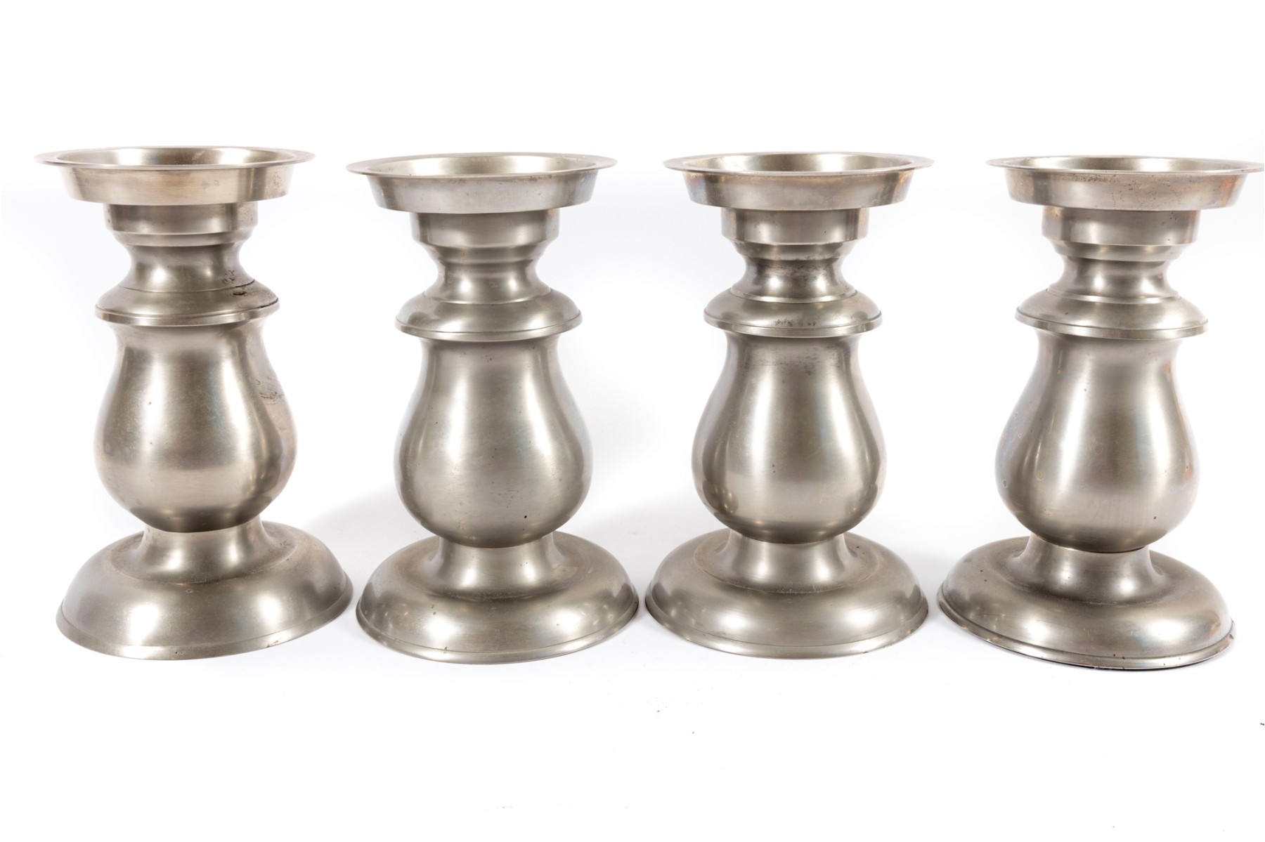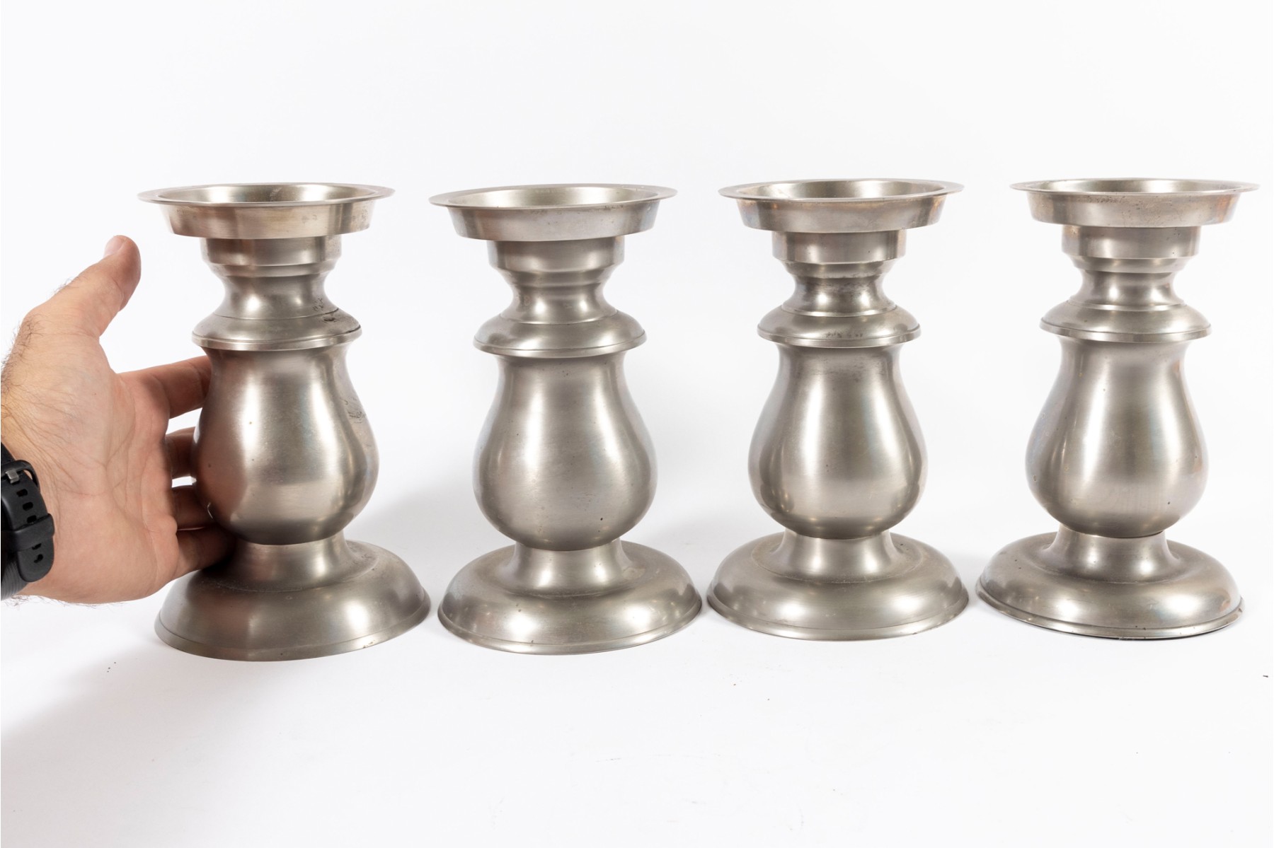 A set of four 7.5" tall bulbous baluster column candlestick holders produced by Restoration Hardware.