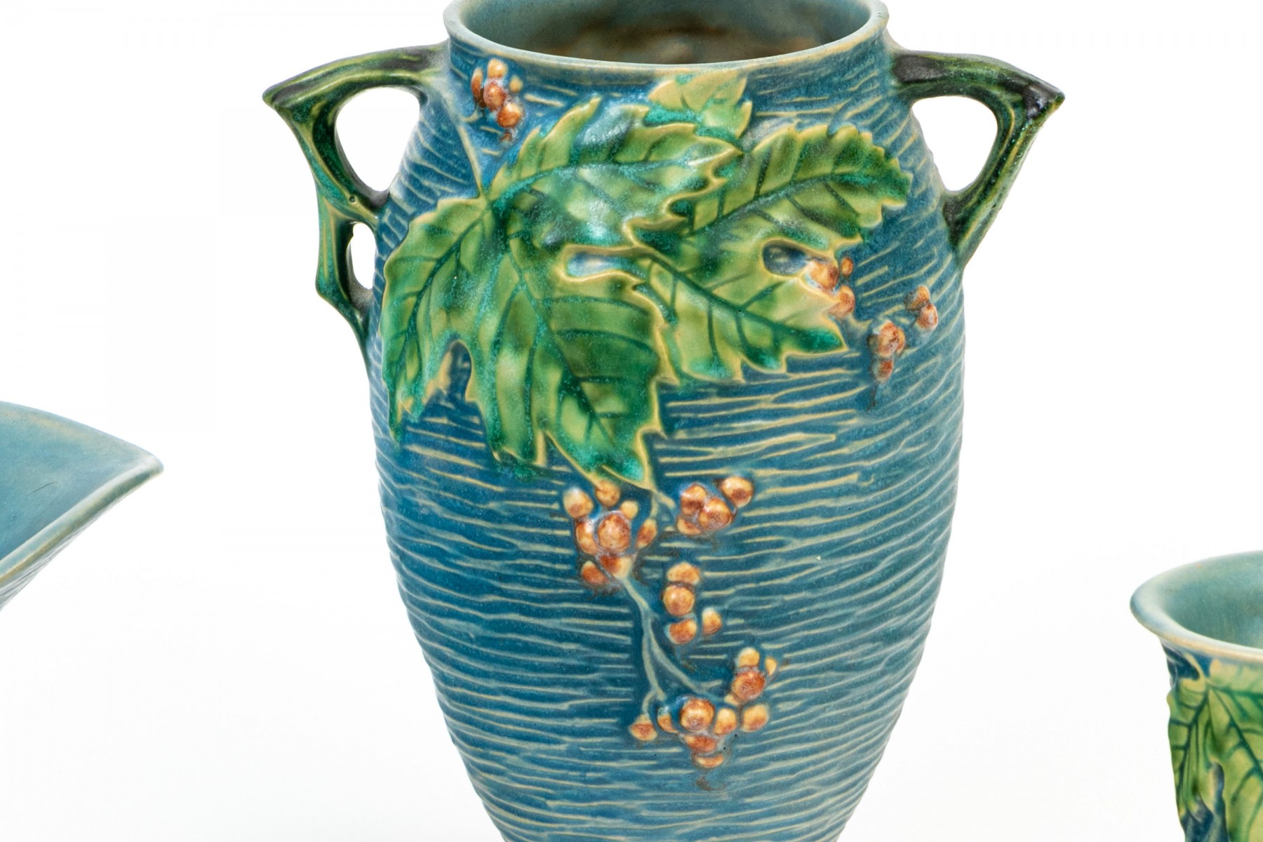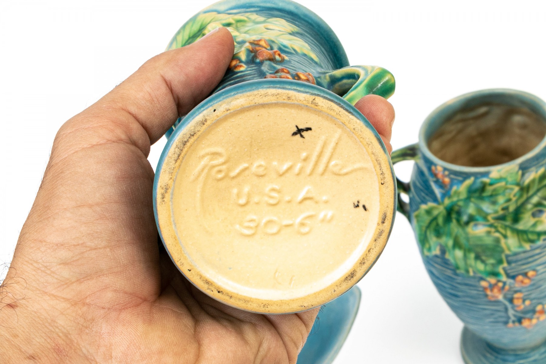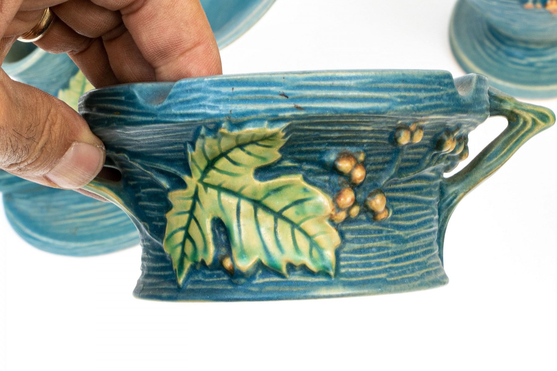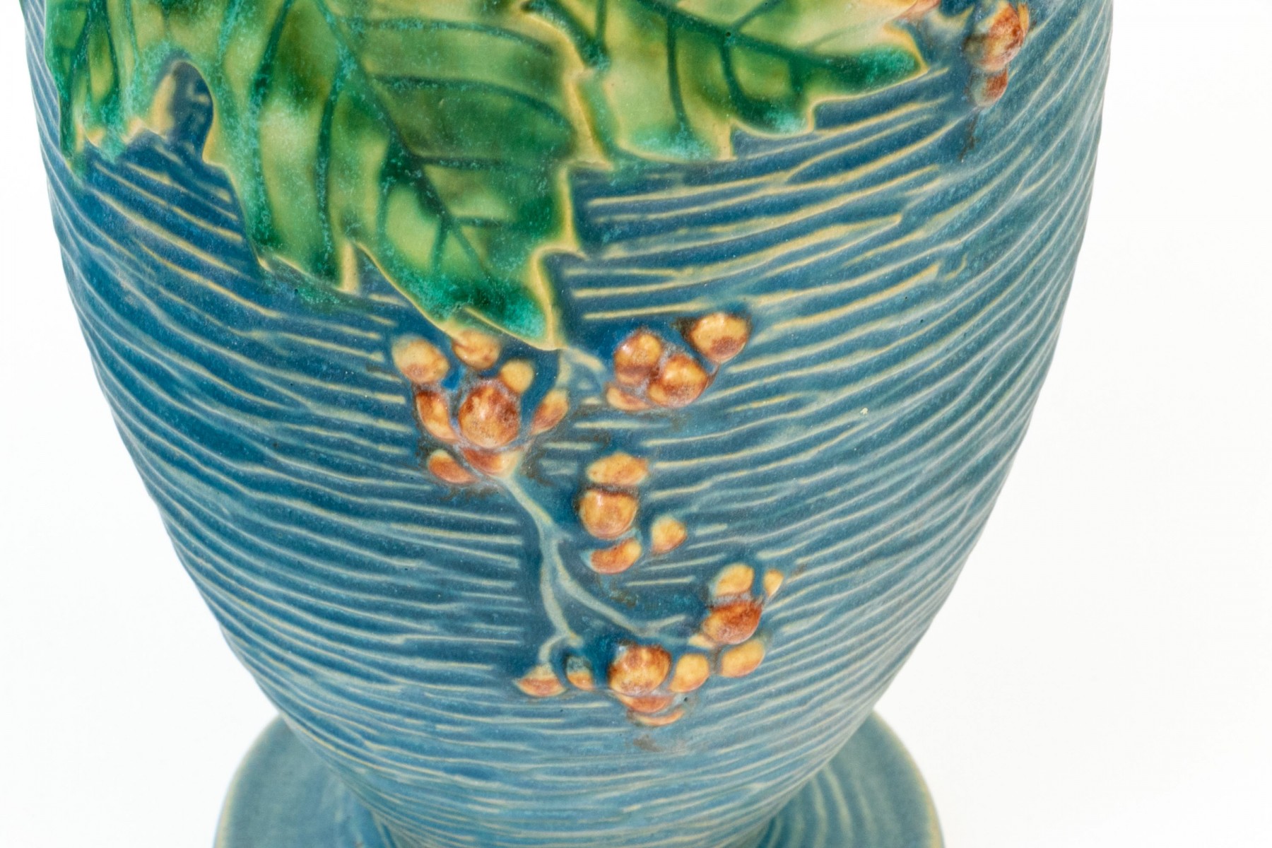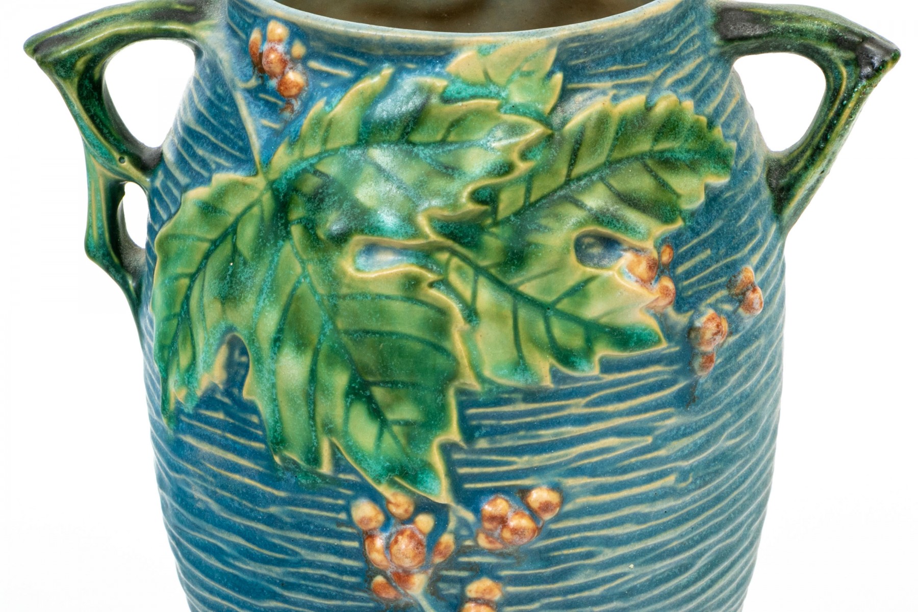Roseville Pottery Bushberry pattern designed in 1948 with leaves and berries on bark-like background of blue/green.