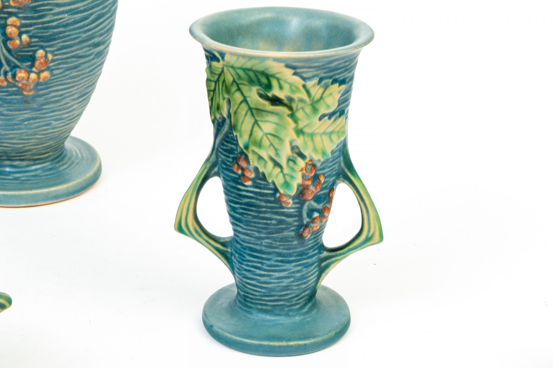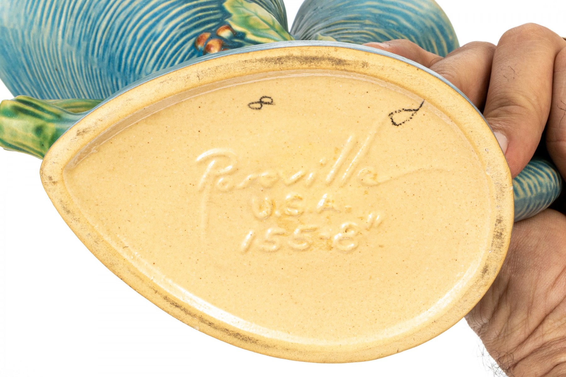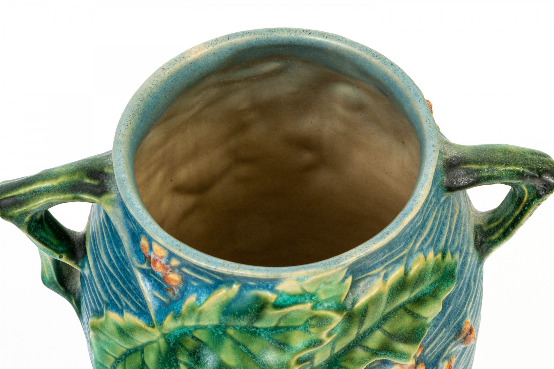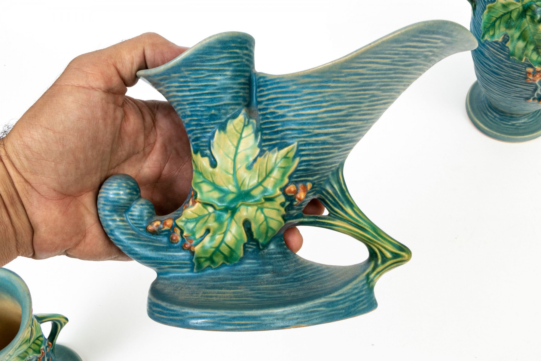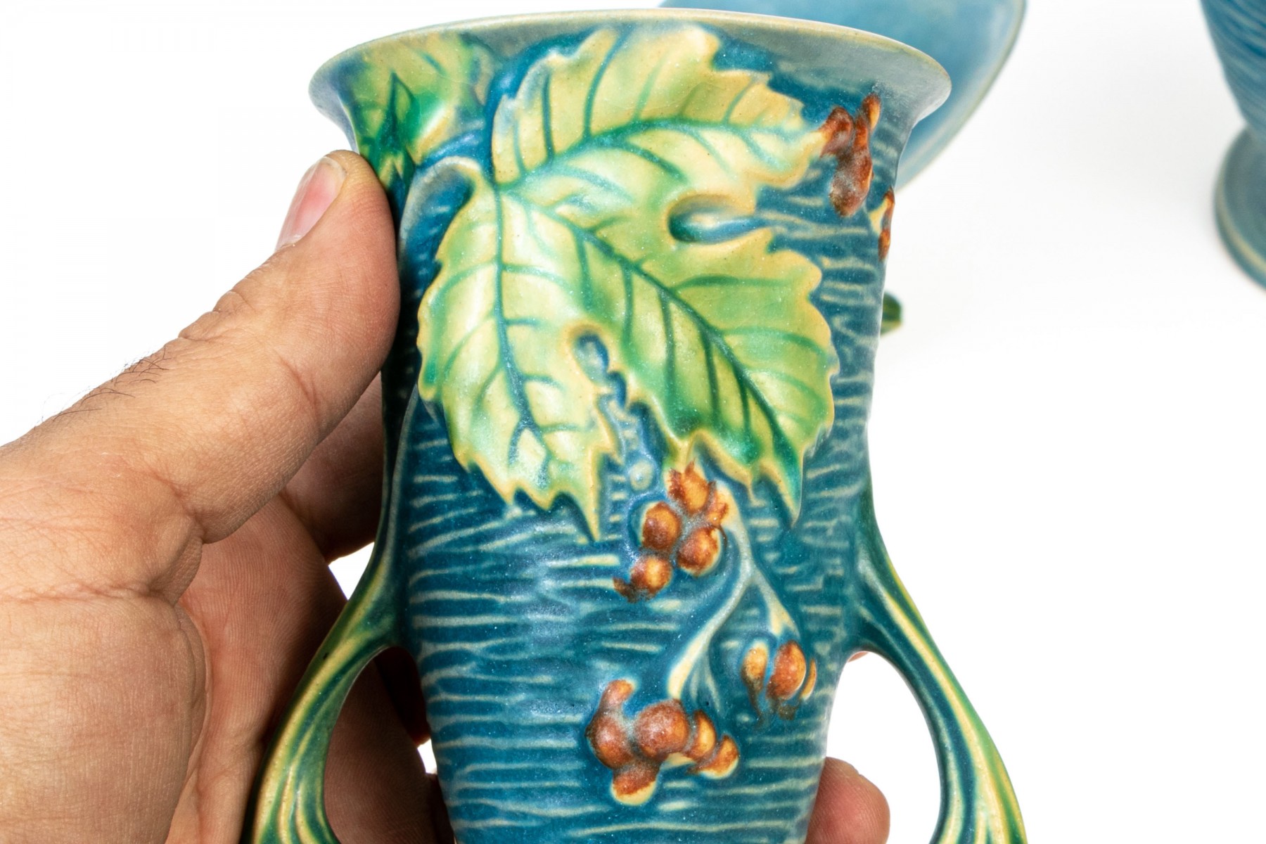 Roseville Pottery Bushberry pattern designed in 1948 with leaves and berries on bark-like background of blue/green.