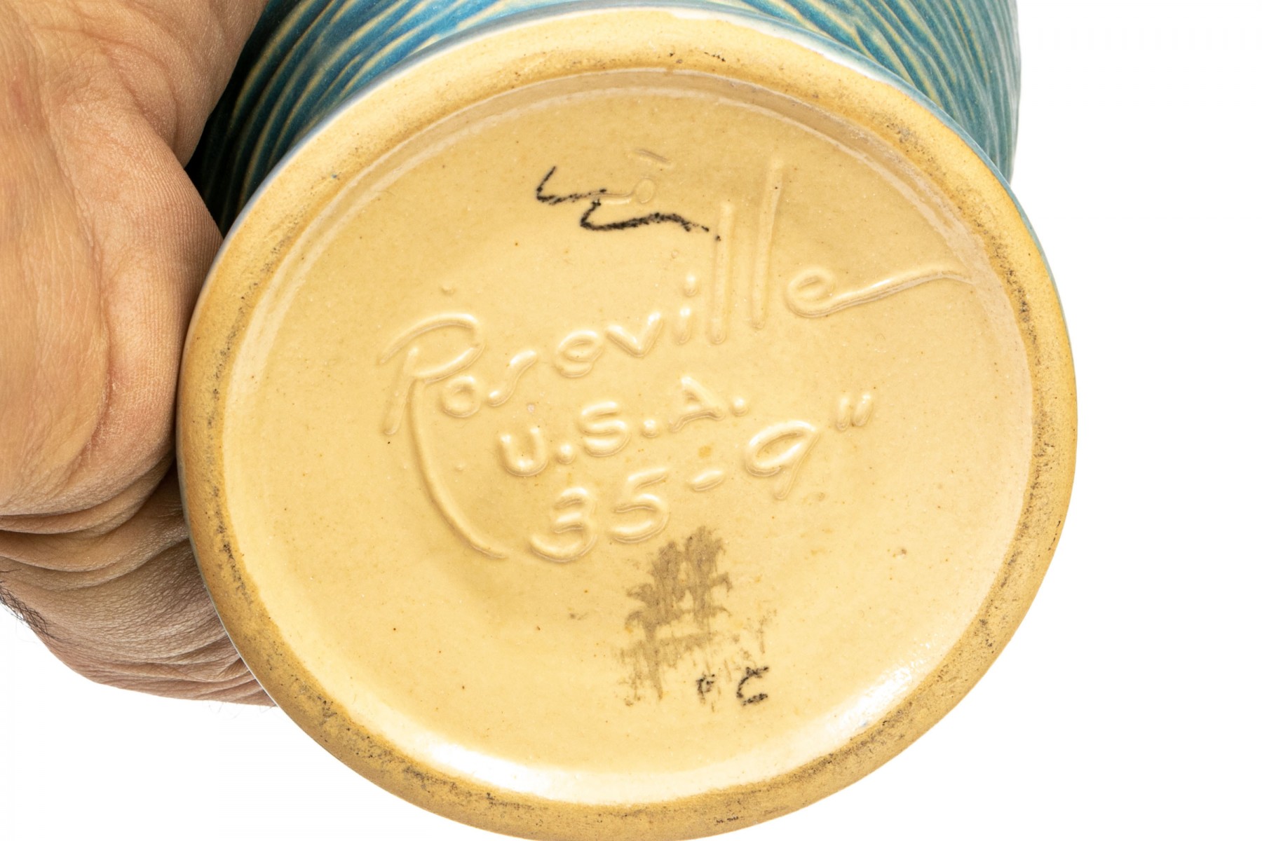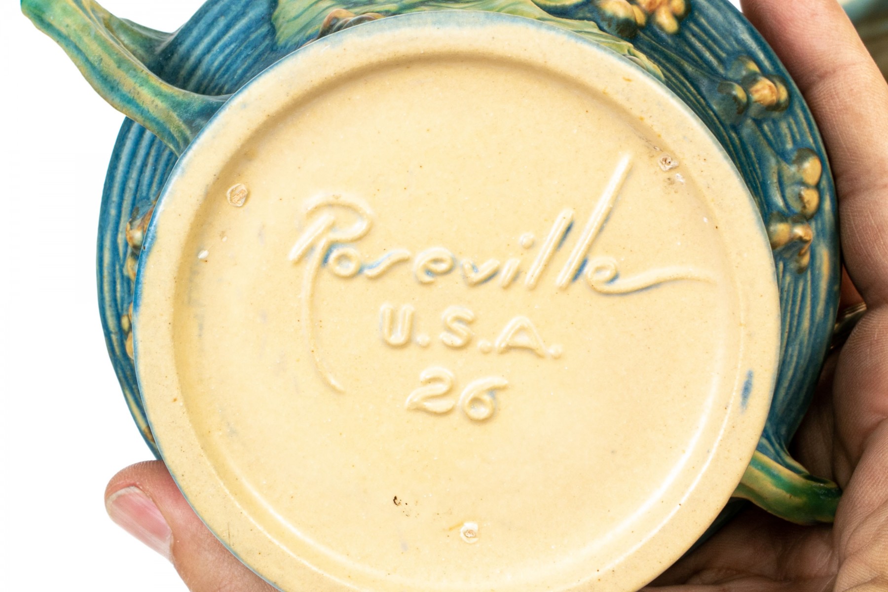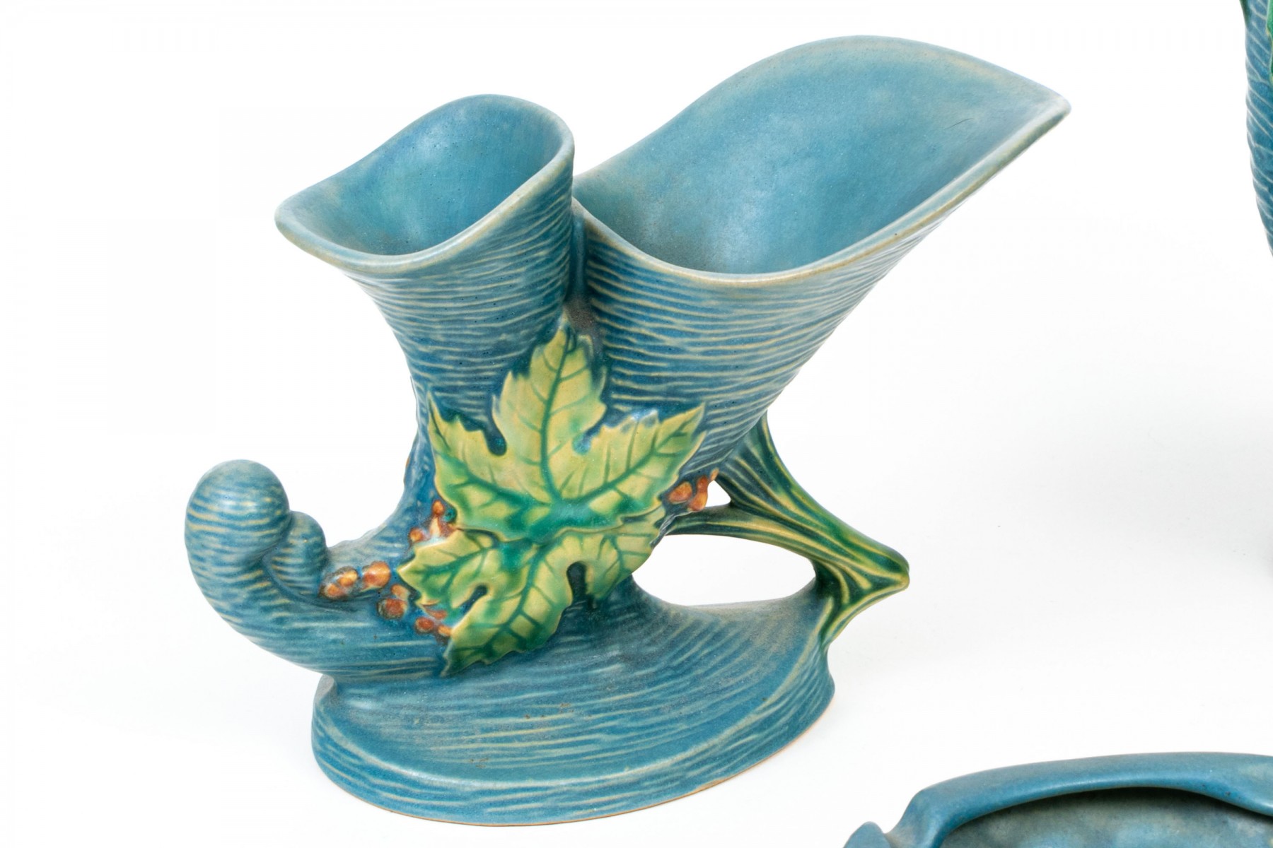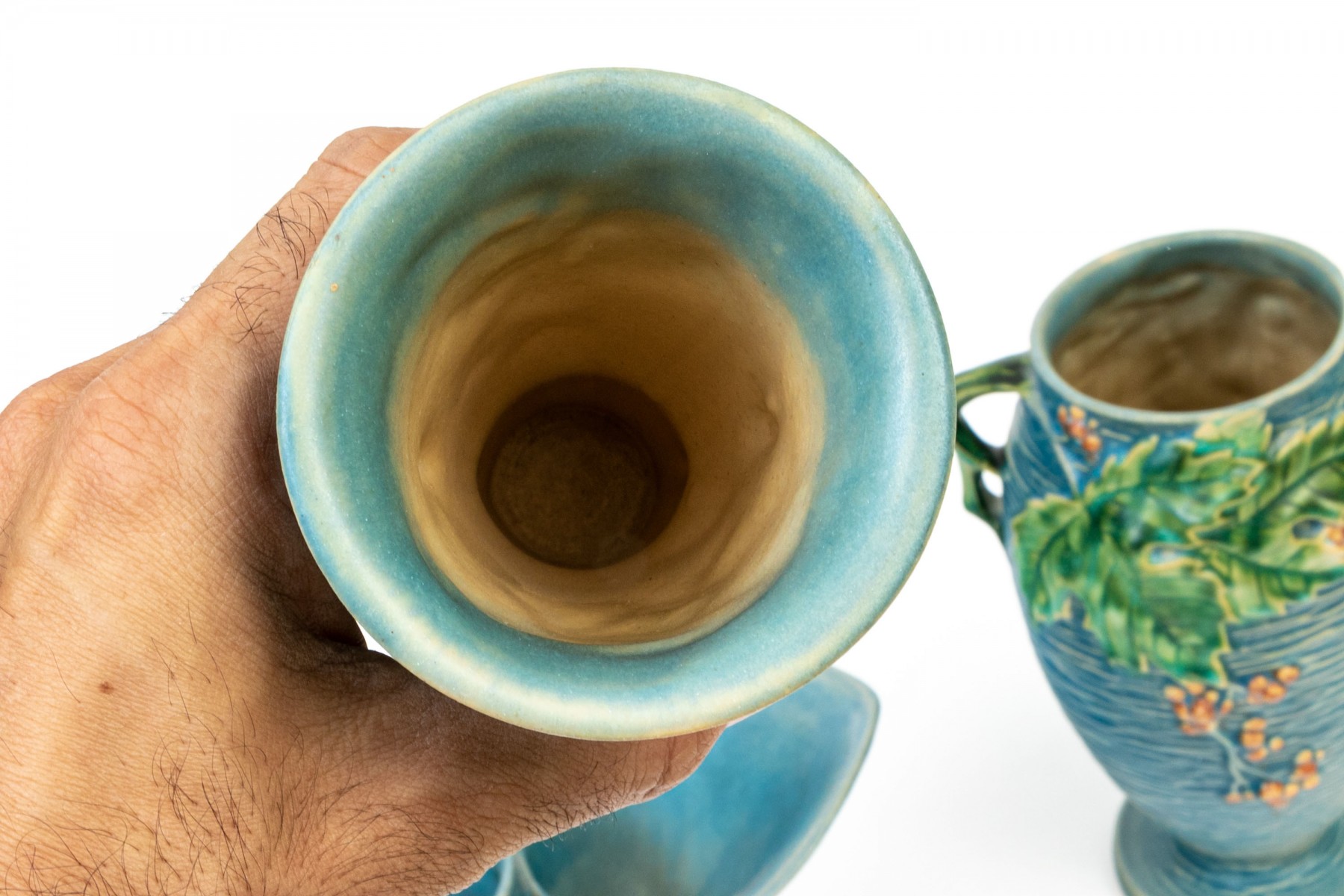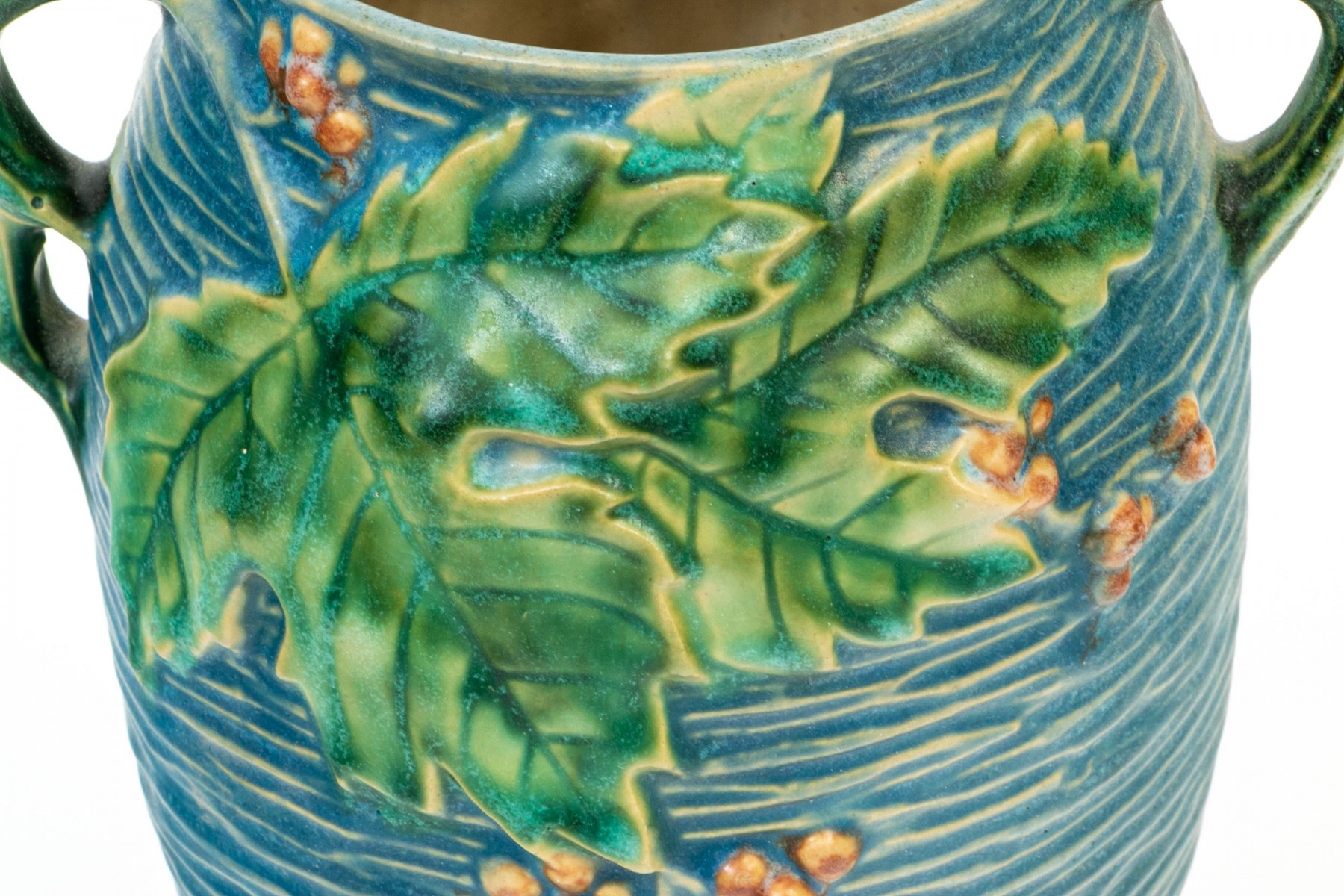 Roseville Pottery Bushberry pattern designed in 1948 with leaves and berries on bark-like background of blue/green.