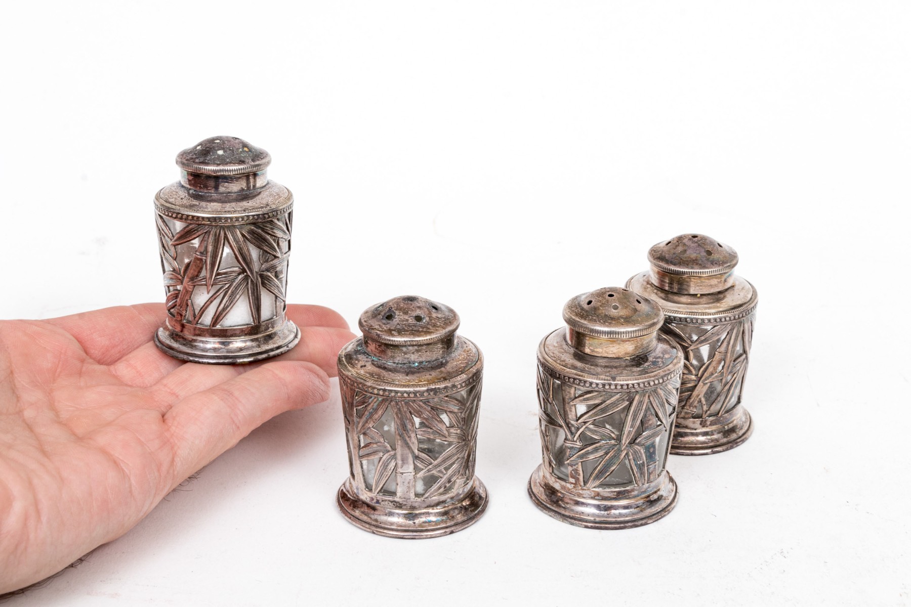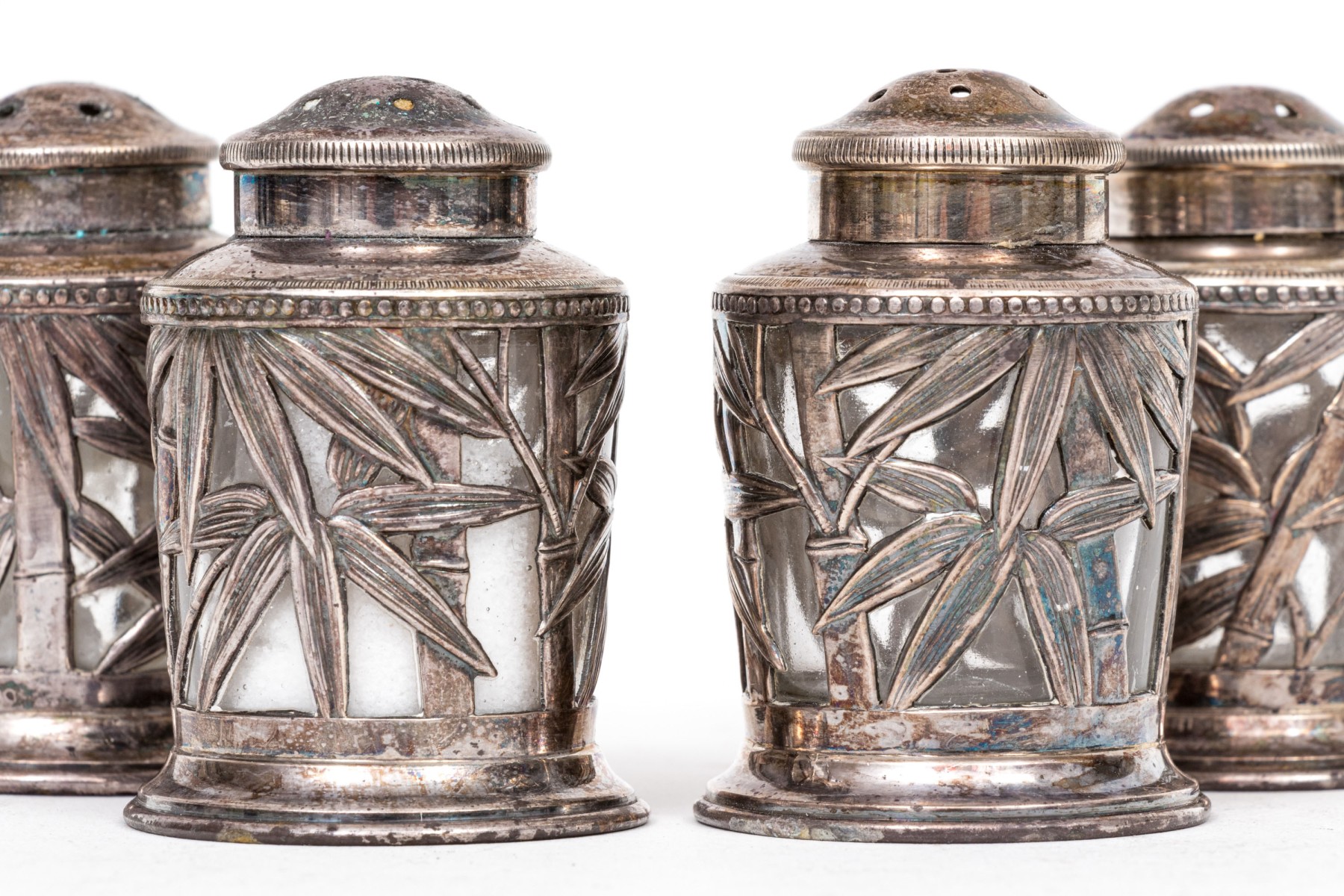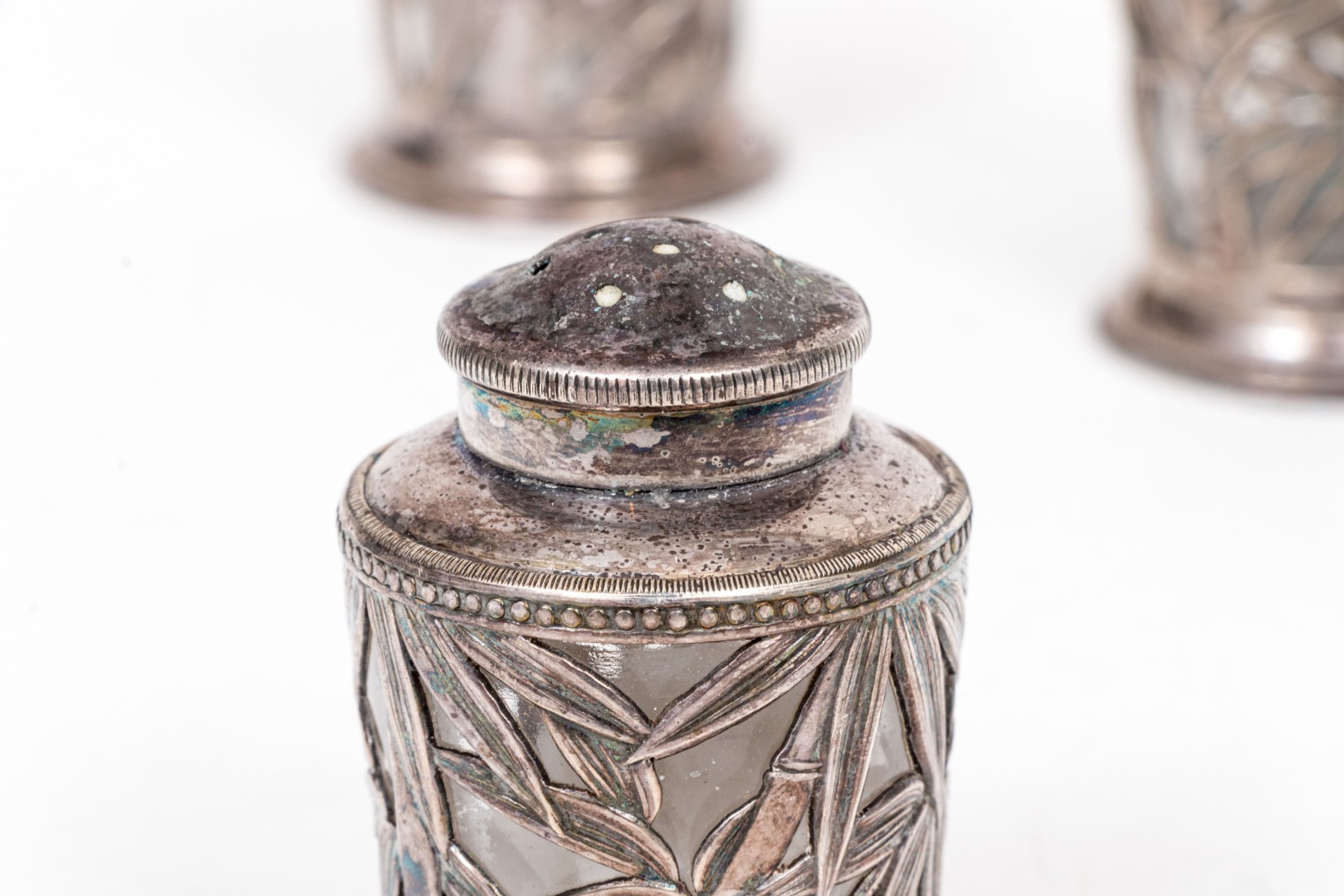 Collection of sterling silver spice shaker with glass inserts. Display a leaf and bamboo design.