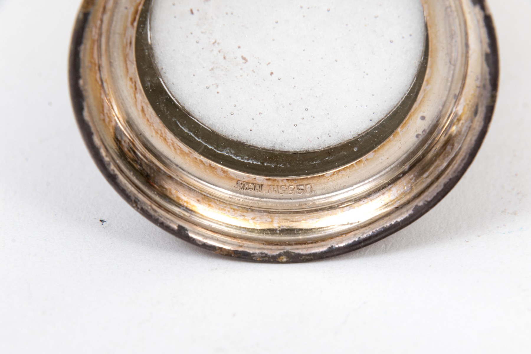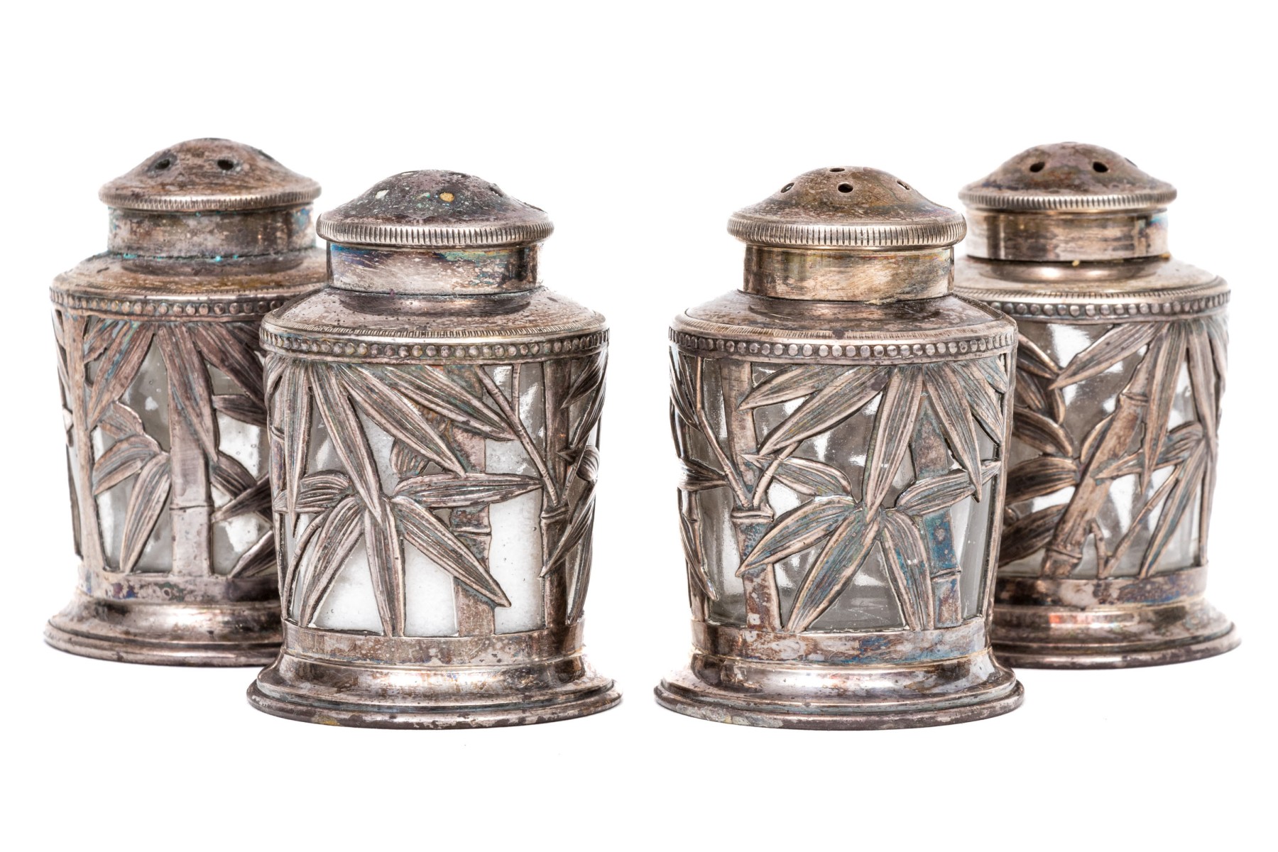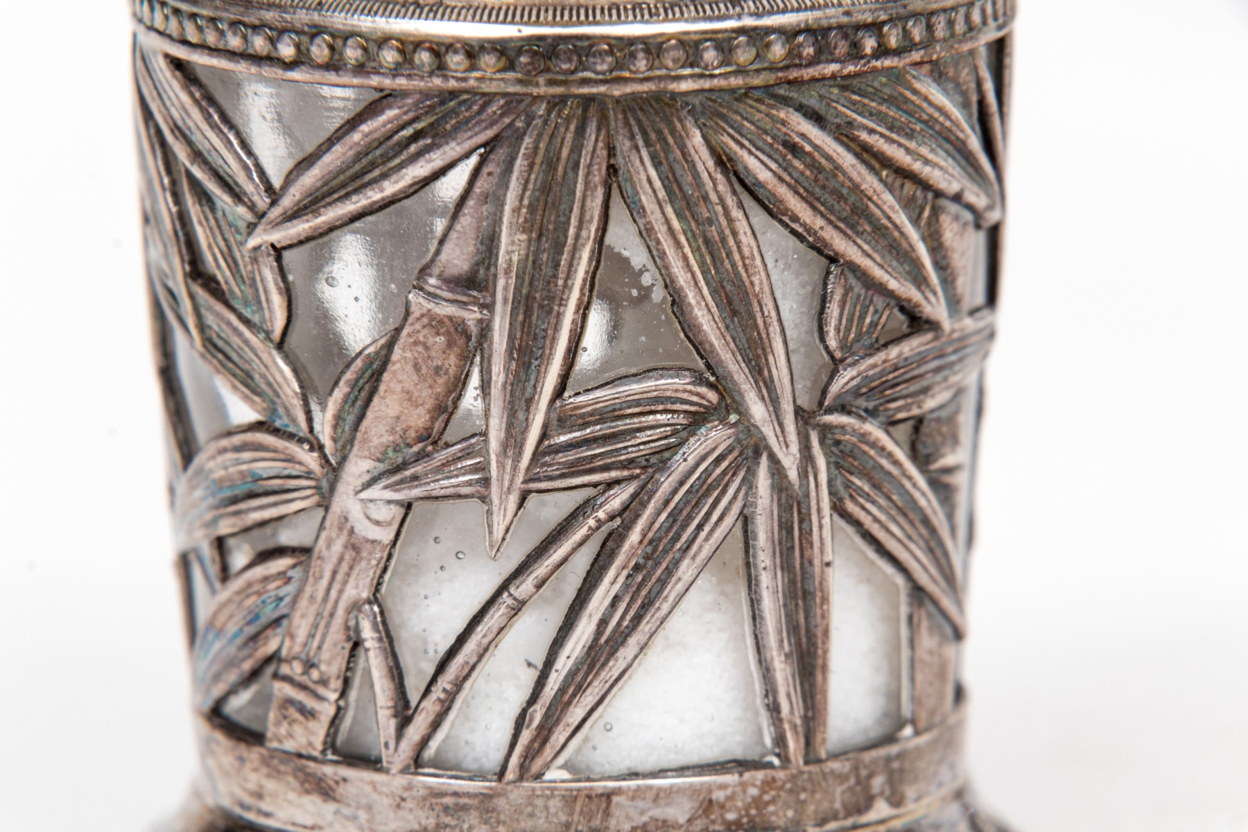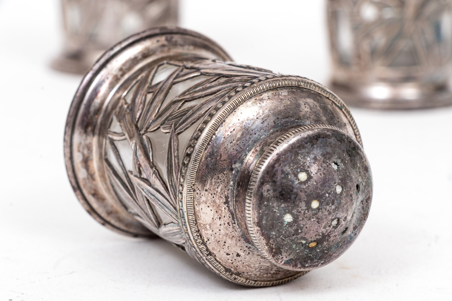 Collection of sterling silver spice shaker with glass inserts. Display a leaf and bamboo design.