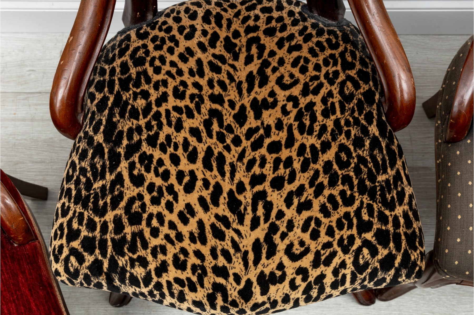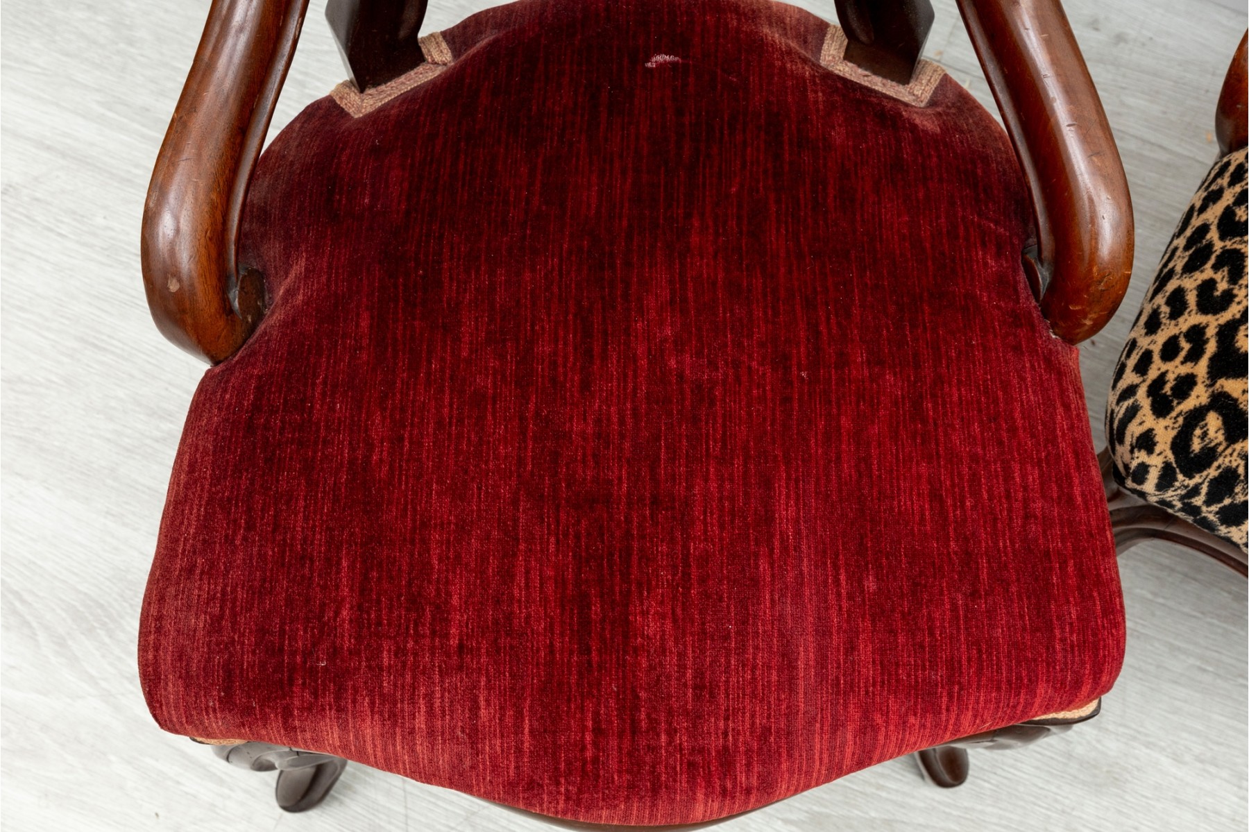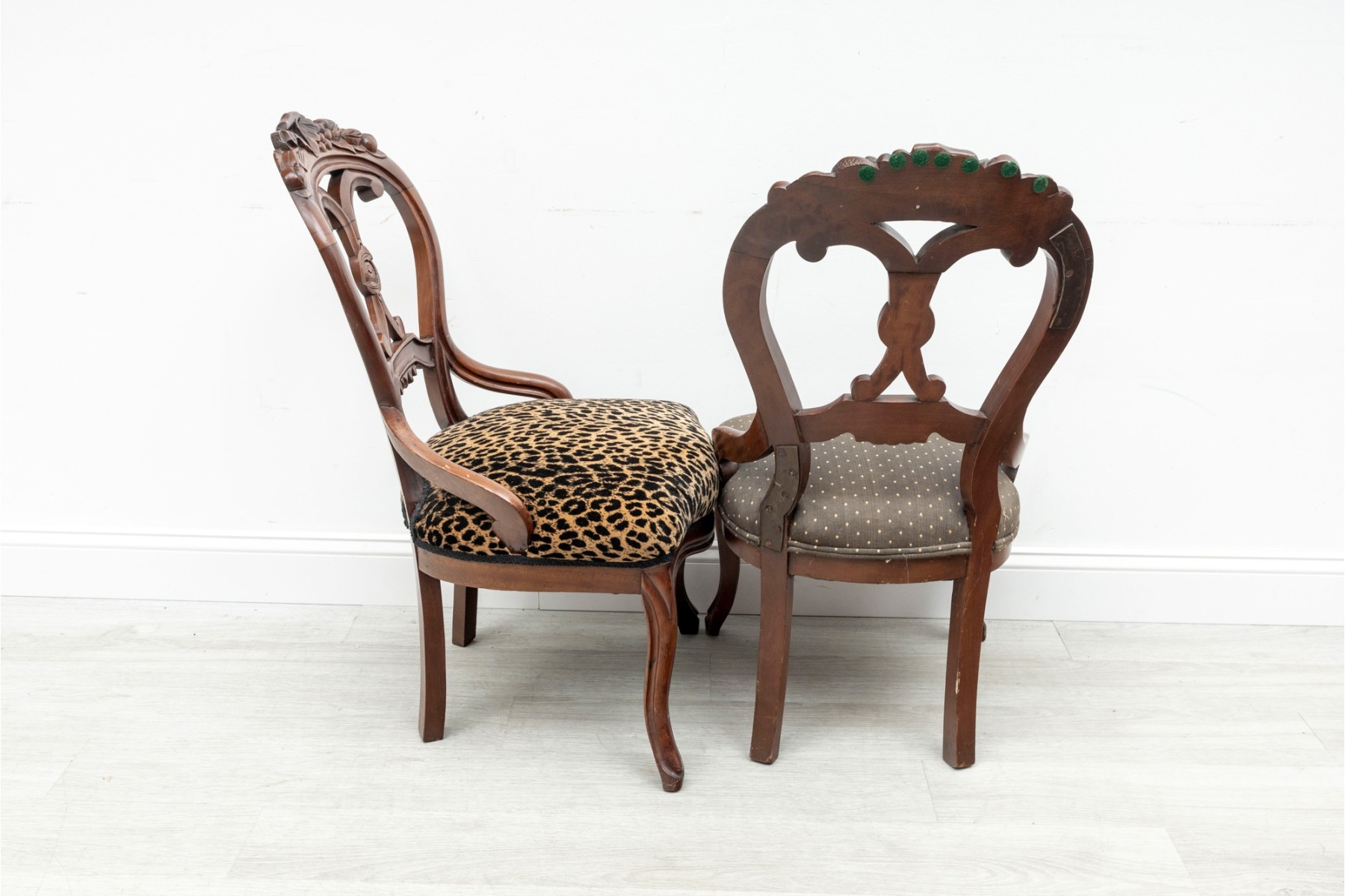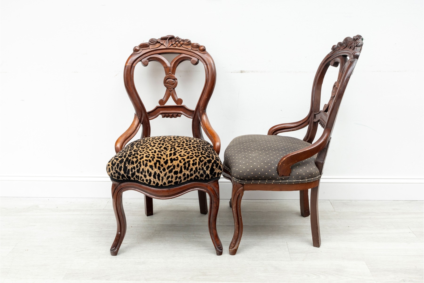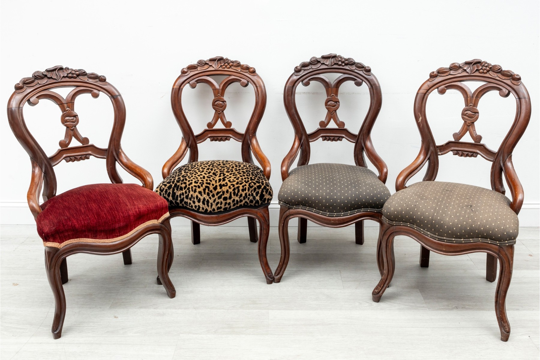 This set of four Victorian wood carved chairs showcase the elegance and craftsmanship of the 19th century. Each chair features a gracefully curved balloon-shaped backrest, complemented by intricate carvings along the frame. Each chair claims unique upholstery, see photos for details.