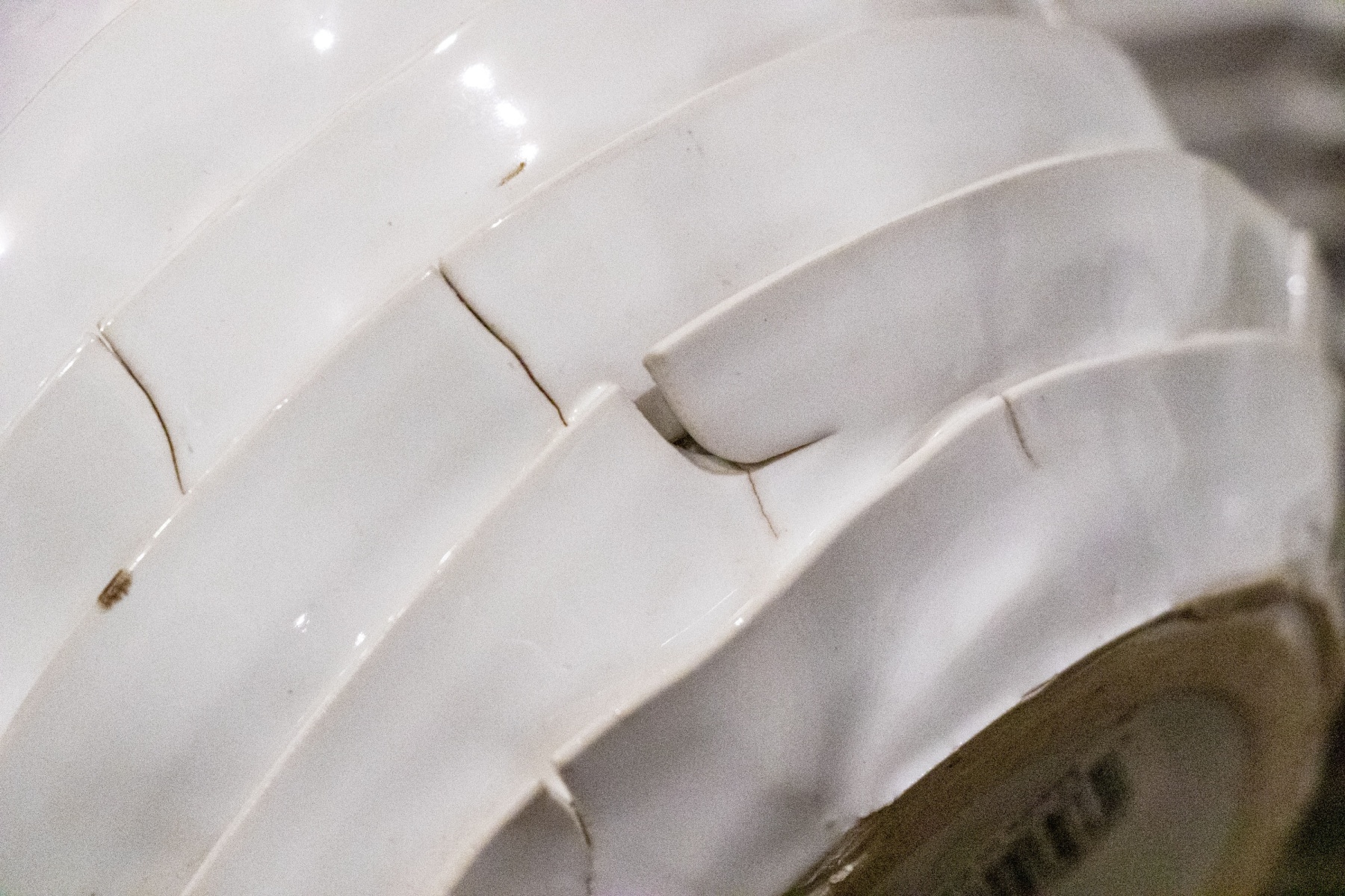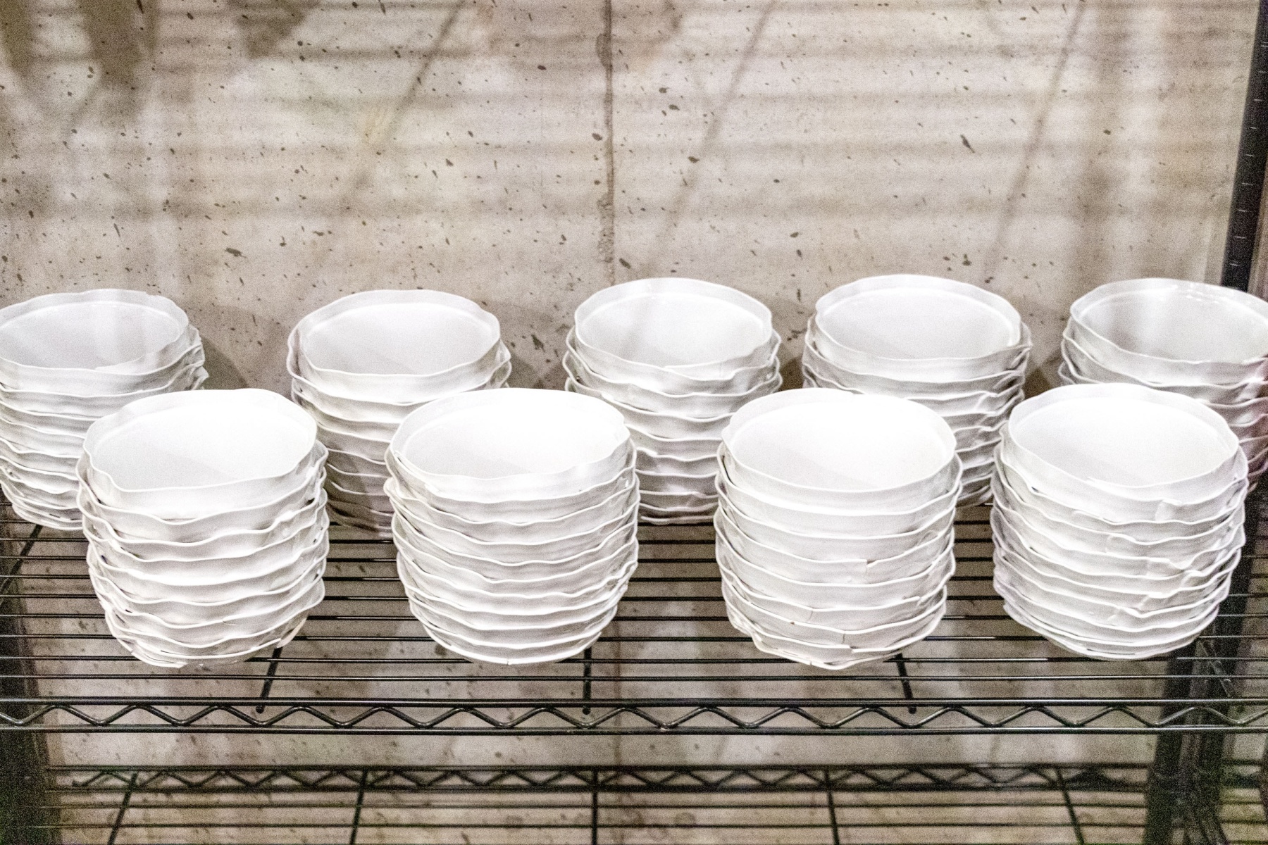 A fabulous collection of ceramic planters including thirteen of shorter height and one slightly taller. All are beautifully designed with the appearance of stacked and rippling fabric across the exteriors, making for a chic, eye-catching and textural display.