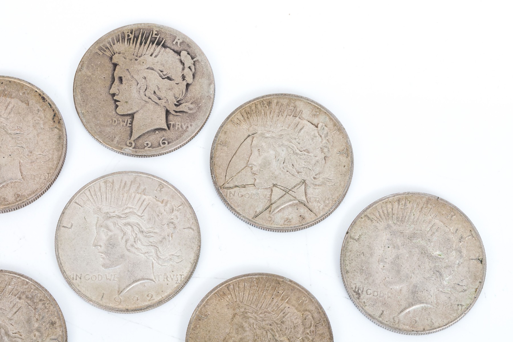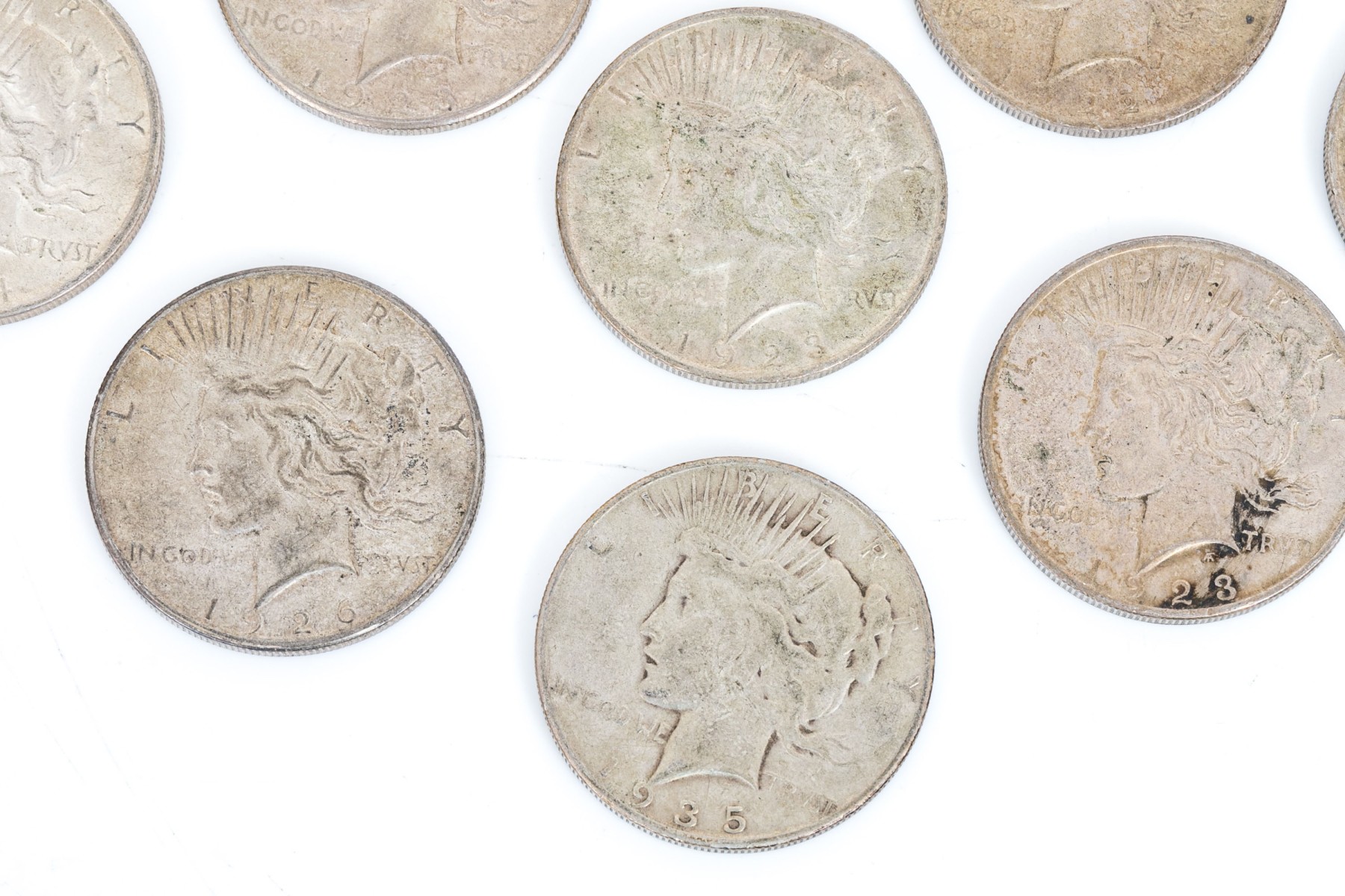 Four 1922 and one 1922-D. Four 1923 and one 1923-S. 1924. 1926-S. 1935-S. 1926-mint mark not visible due to wear.