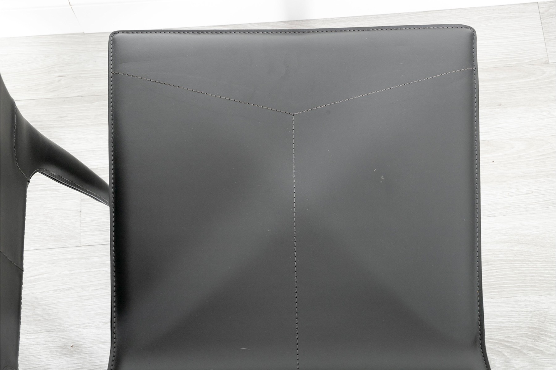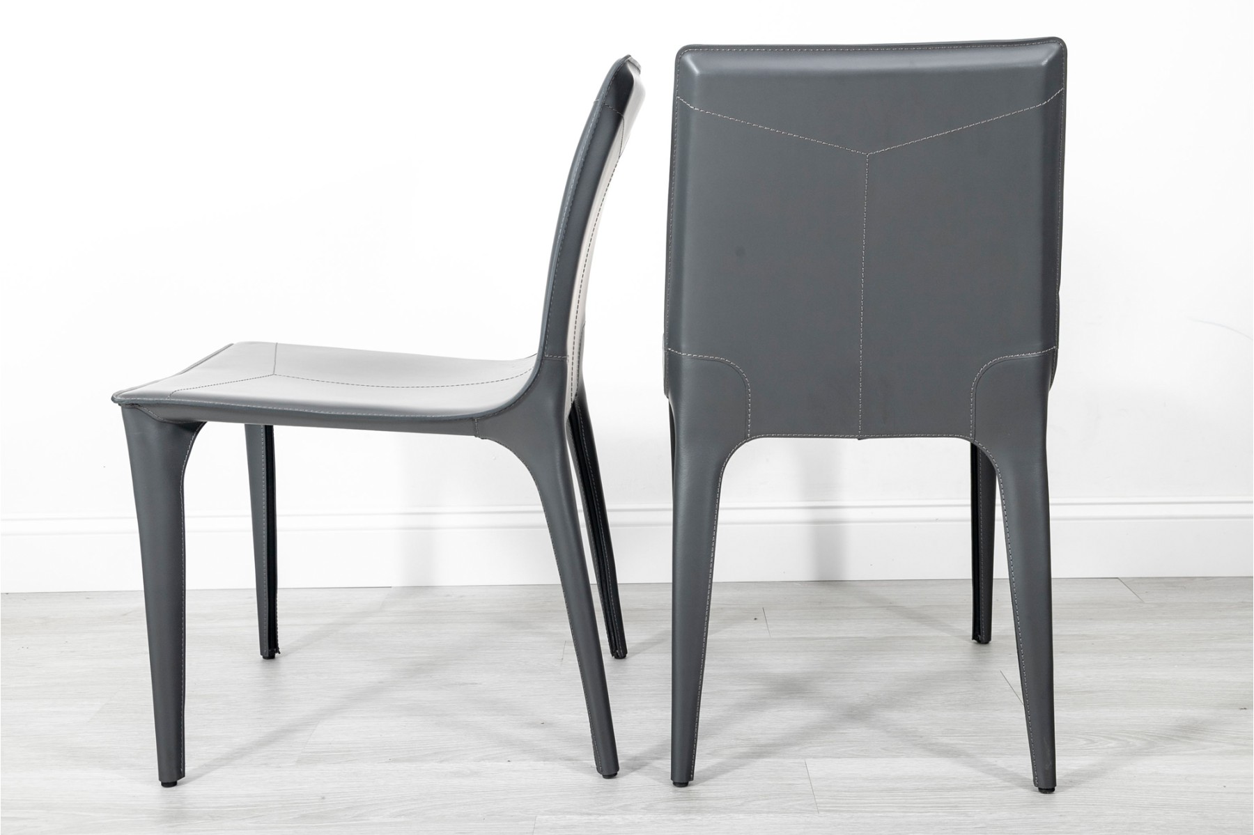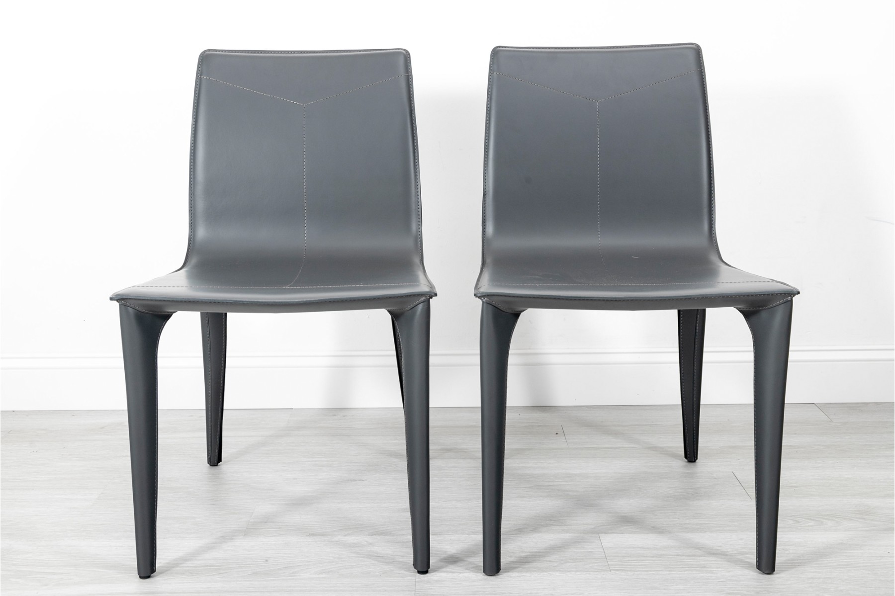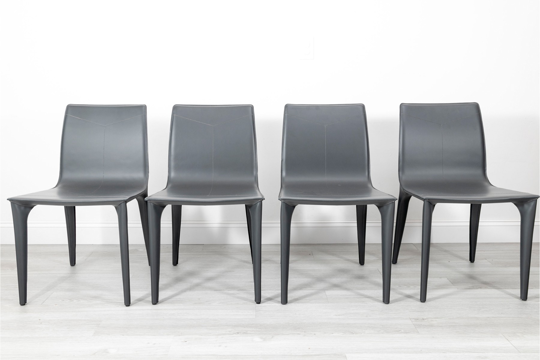 A collection of six Frag sleek dining chairs in gray, displaying great attention to detail throughout stitched seams and gently curving corners. The legs are wrapped with zippered accents for a stylish finish.