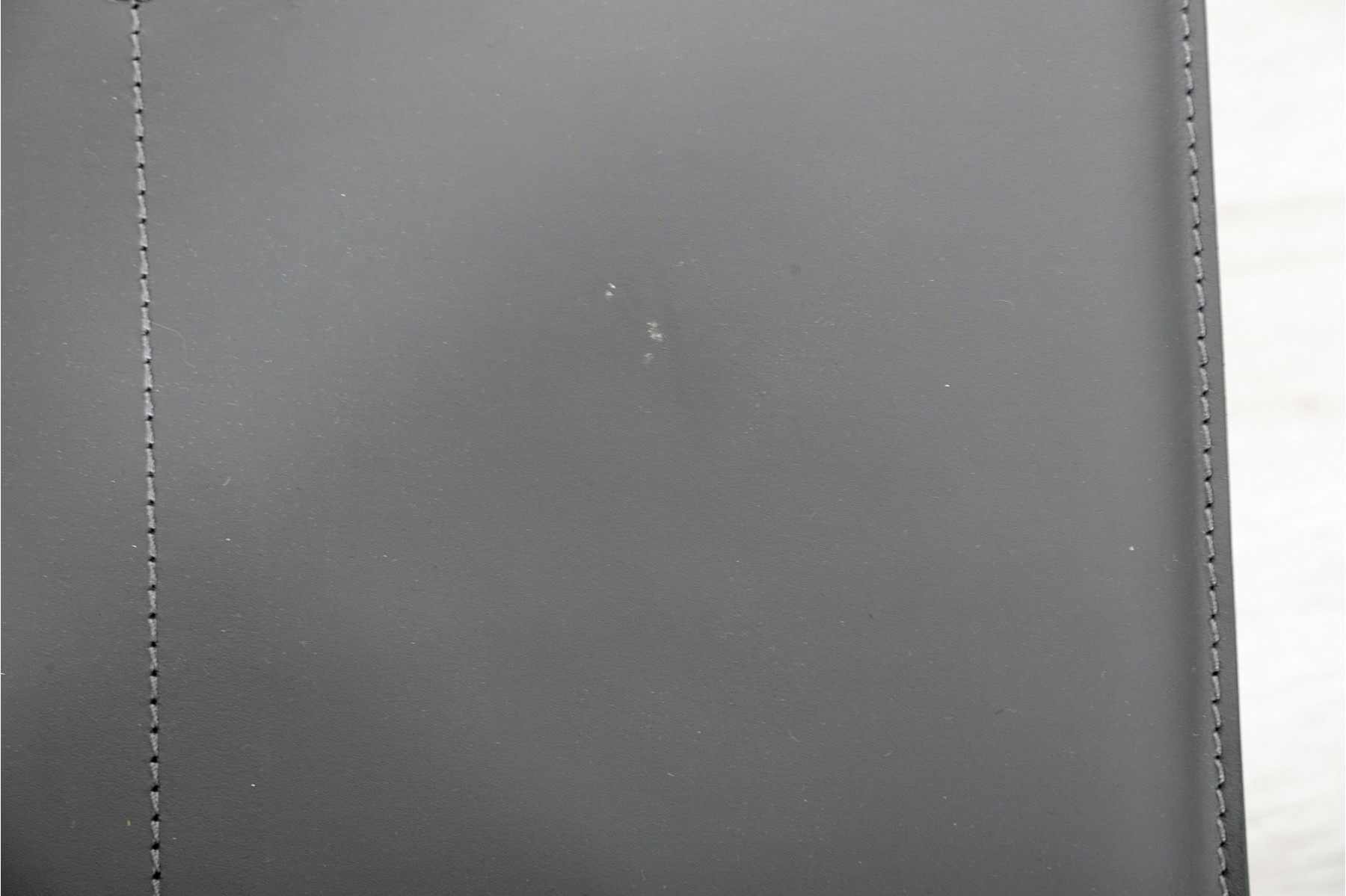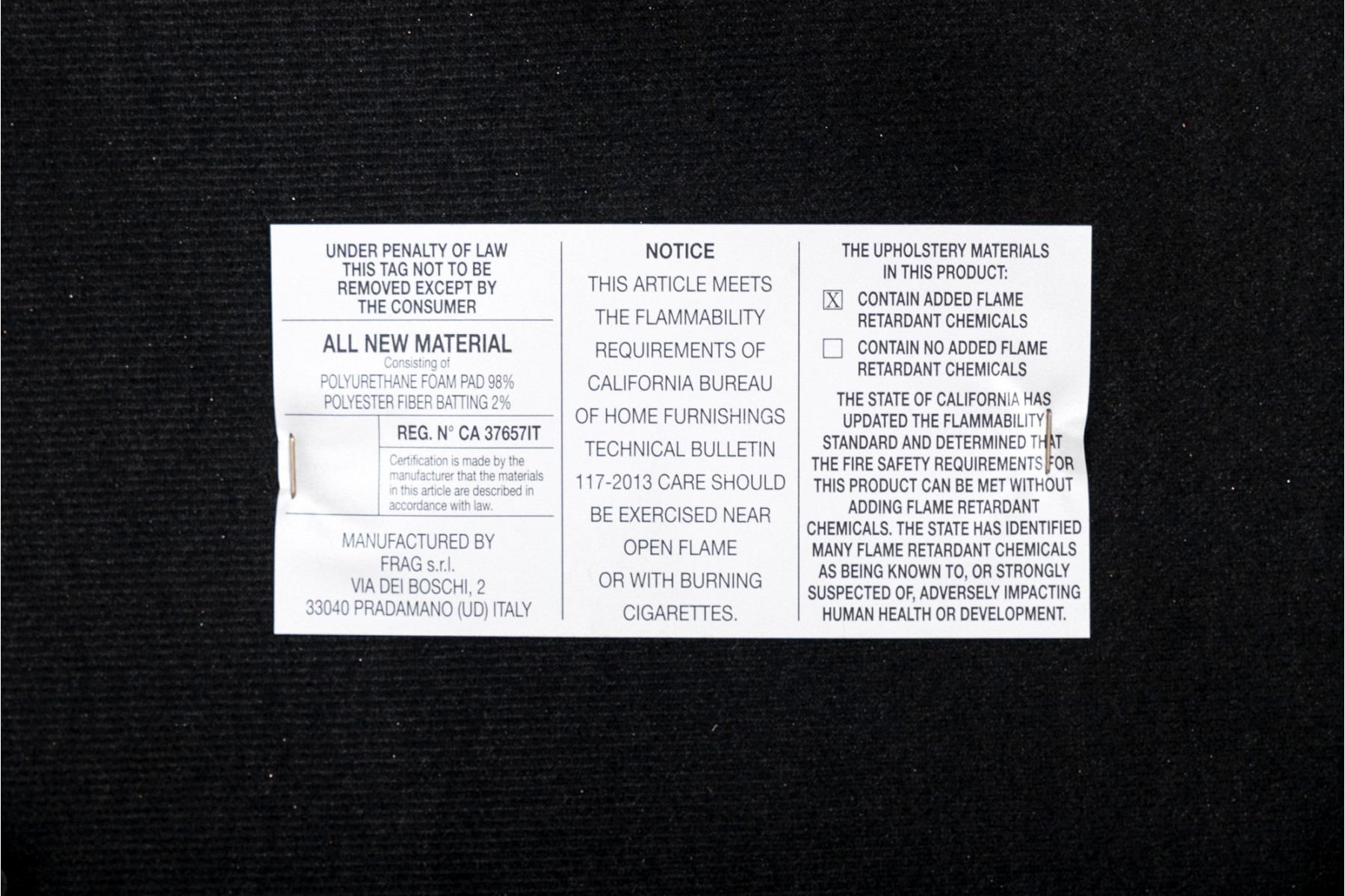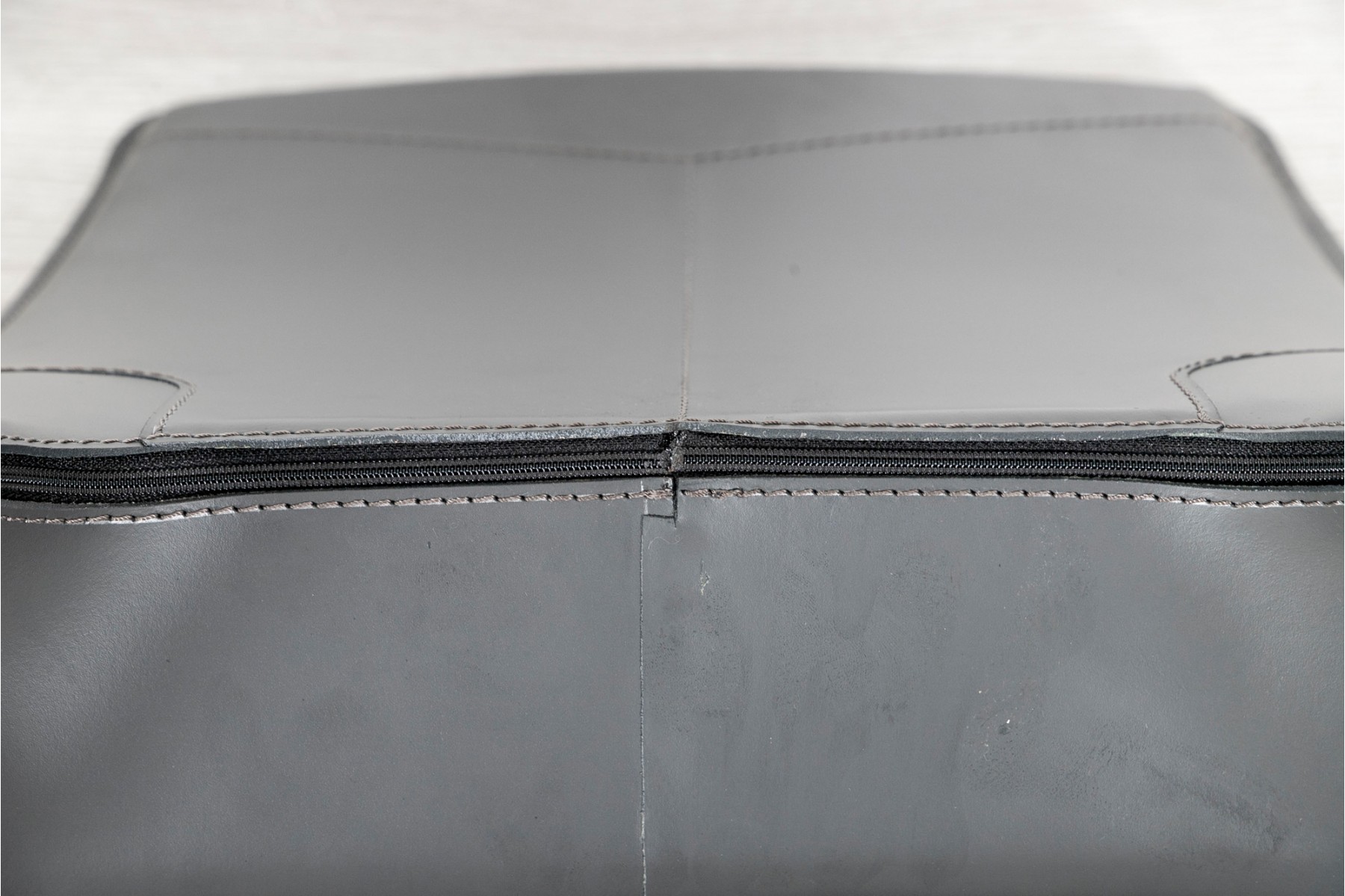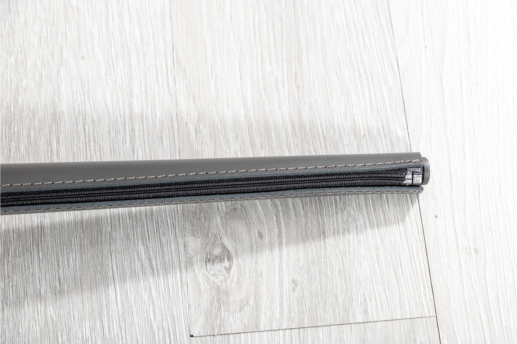 A collection of six Frag sleek dining chairs in gray, displaying great attention to detail throughout stitched seams and gently curving corners. The legs are wrapped with zippered accents for a stylish finish.