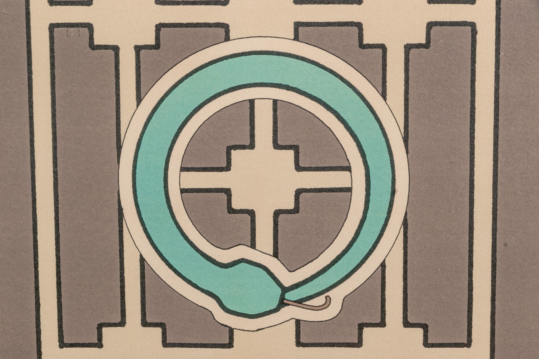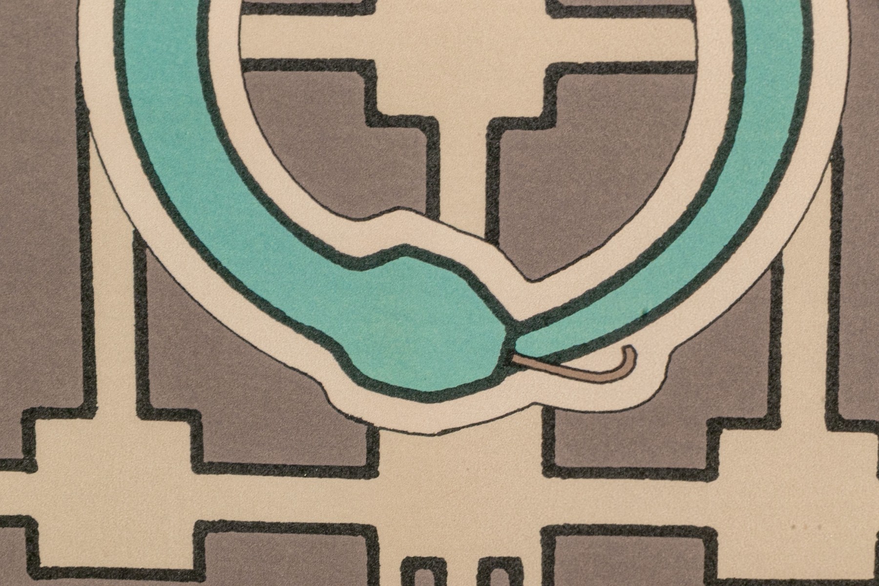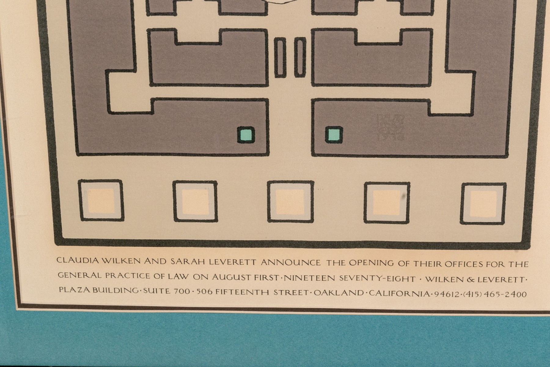 A decorative poster with a modernist block like architectural pattern in brown, tan with a turquoise center detail. Text below. Nicely matted in a wood frame with glass.