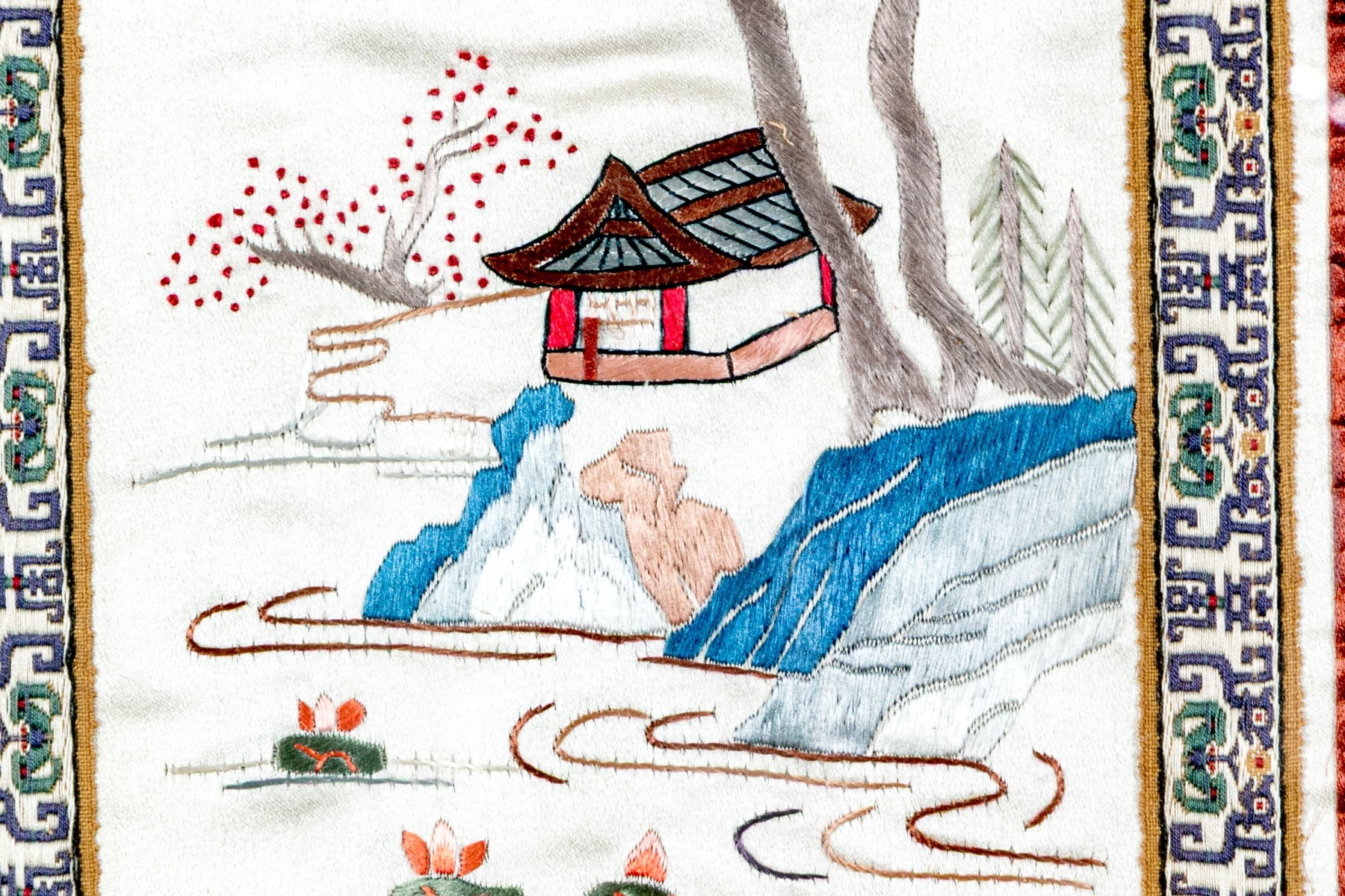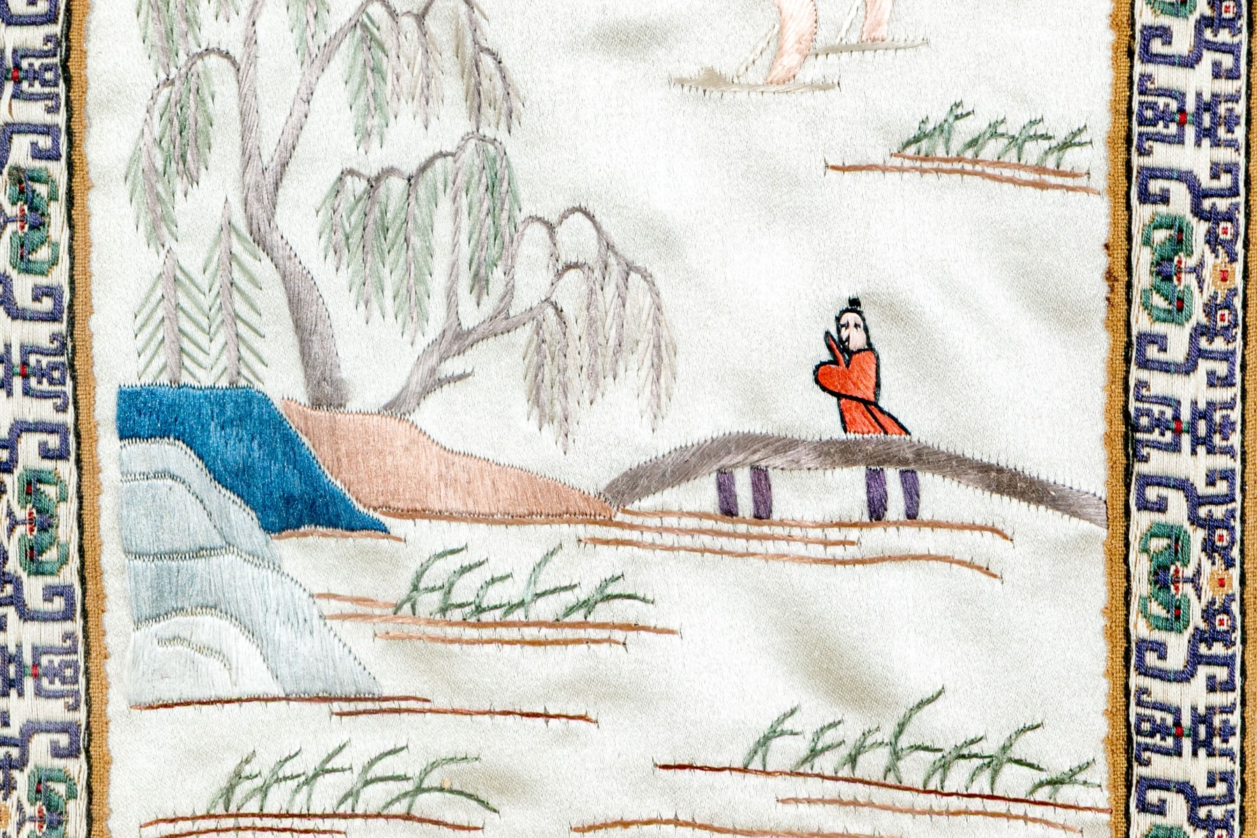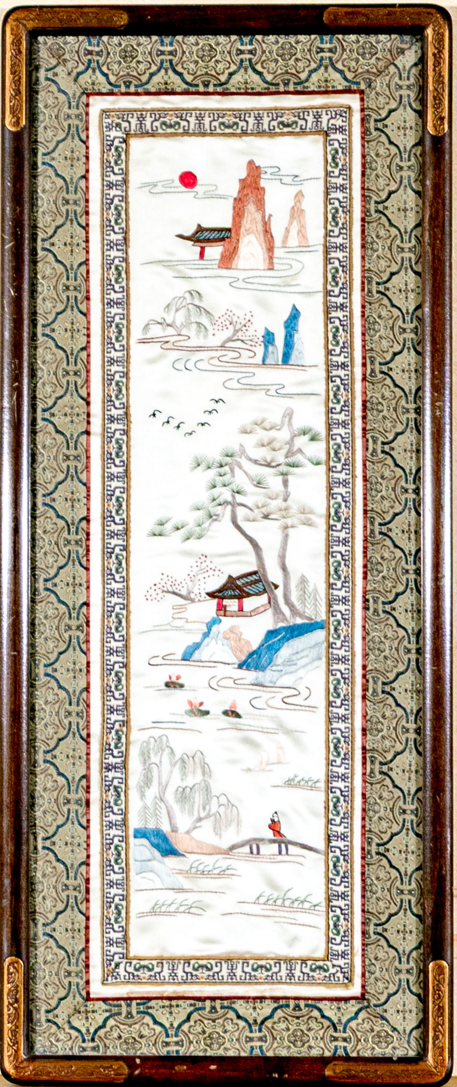 A fine 20th century Chinese silk embroidery depicting a classic scene of a figure on a bridge crossing over calm water surrounding islands of foliage, gazebos, and rockery with pops of blue, green, and orange against a white ground. The panel is bordered by beautifully patterned fabric trims and displayed in a fine brown wood frame with foliate carved corners.
