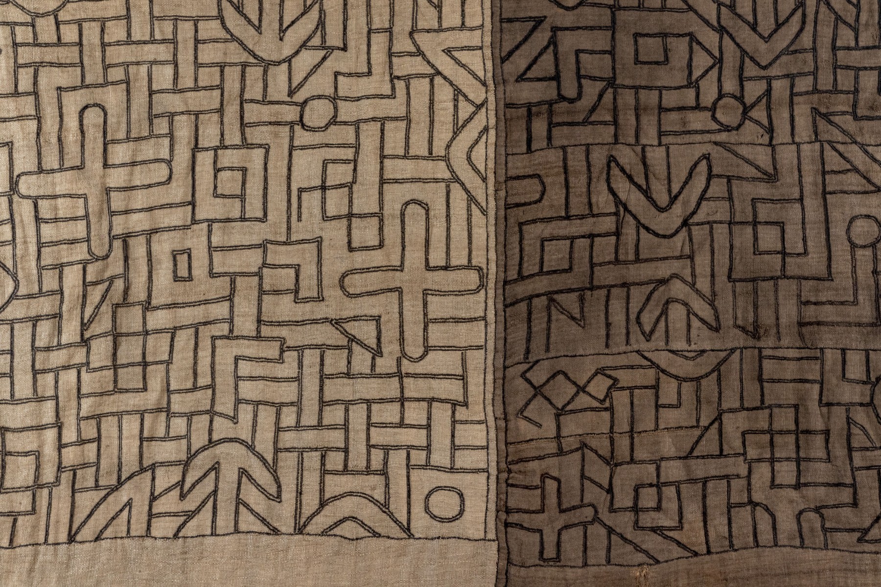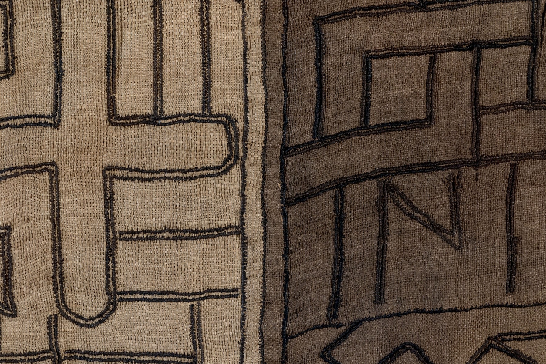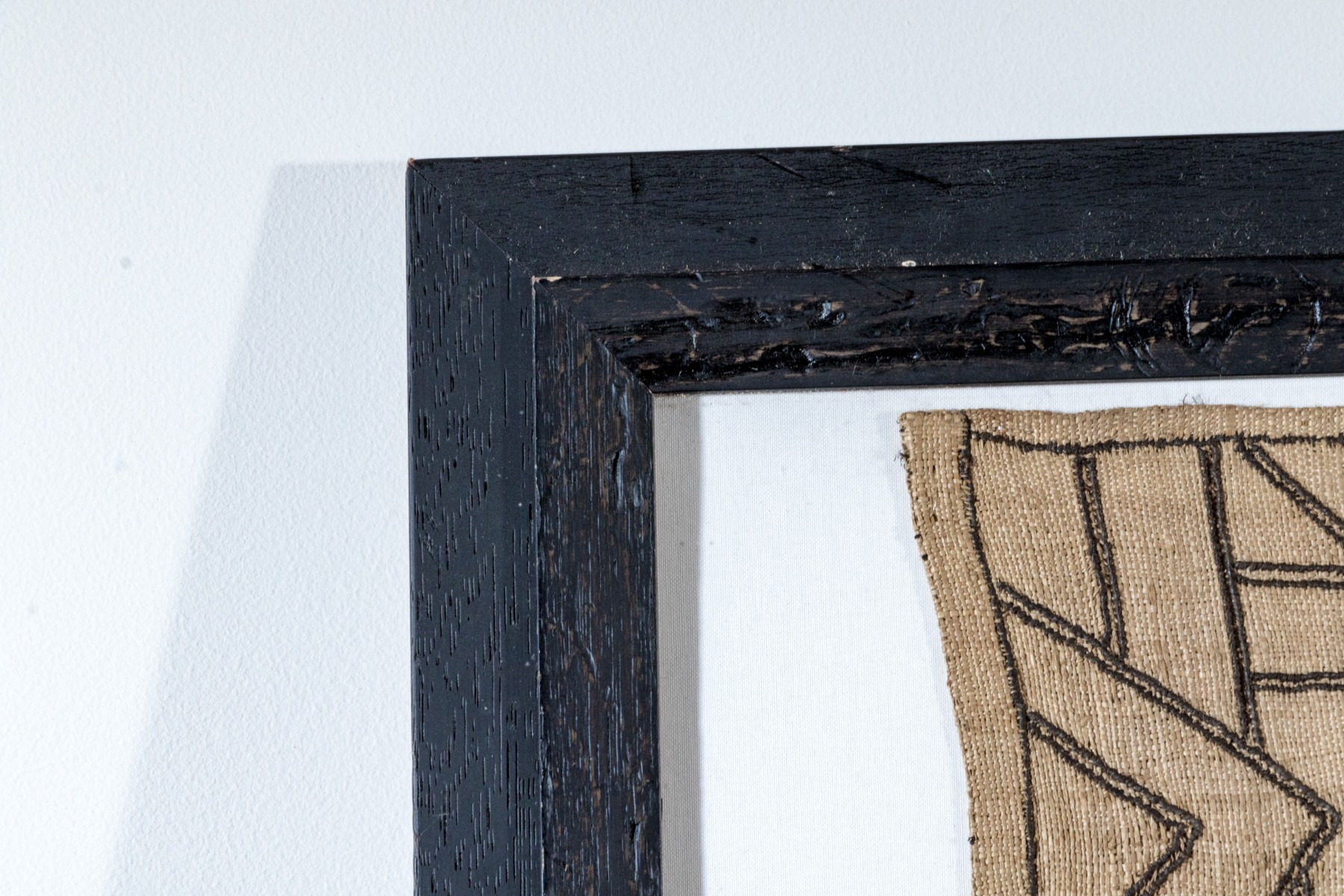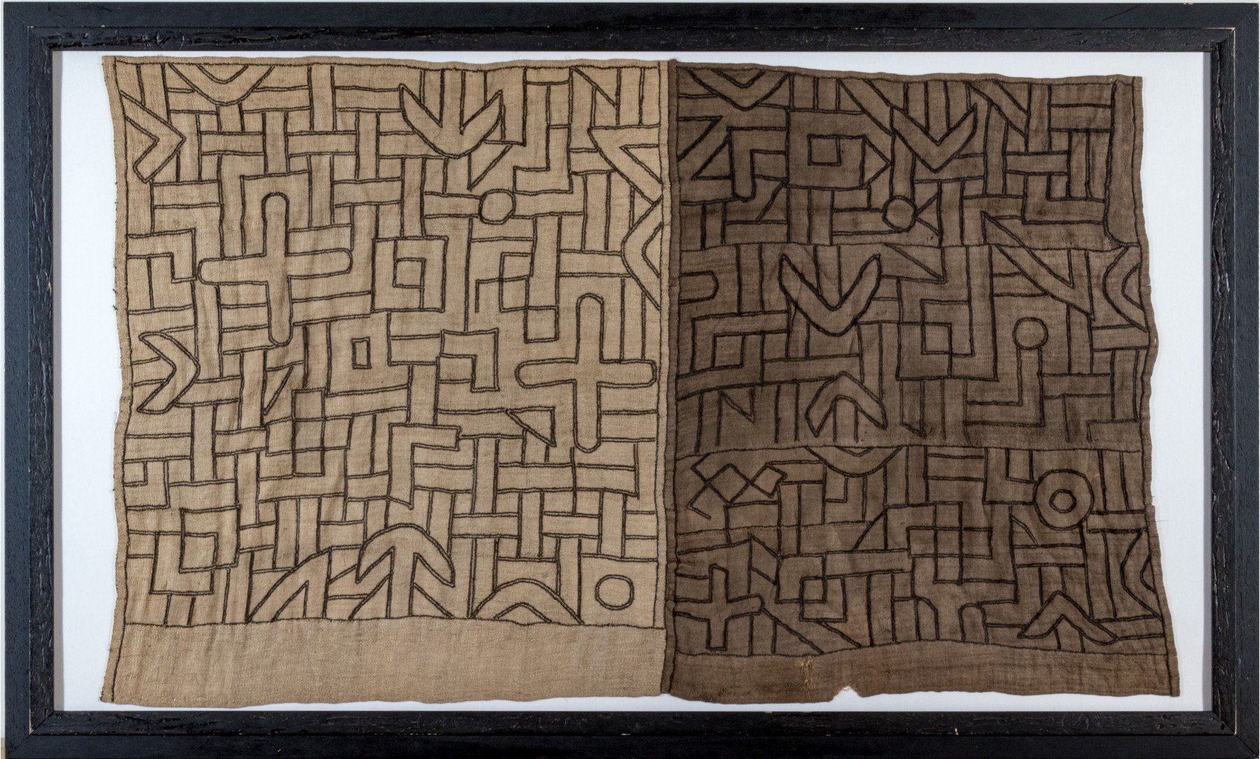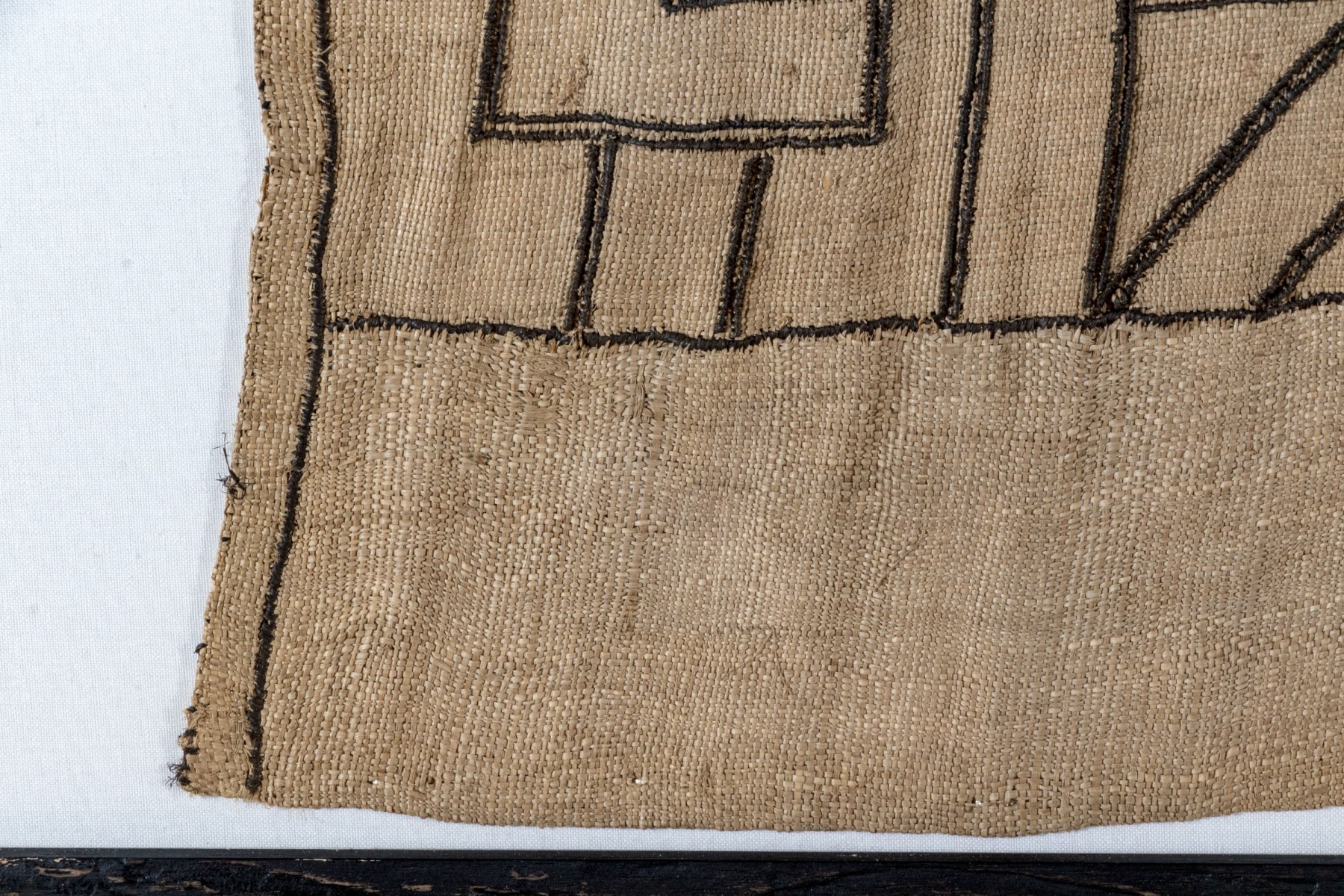 An excellent African Kuba textile in beige and brown with eye-catching geometric designs incorporating basketweave motifs, circles, and arrows. Mounted to a white backing and displayed in a black frame.