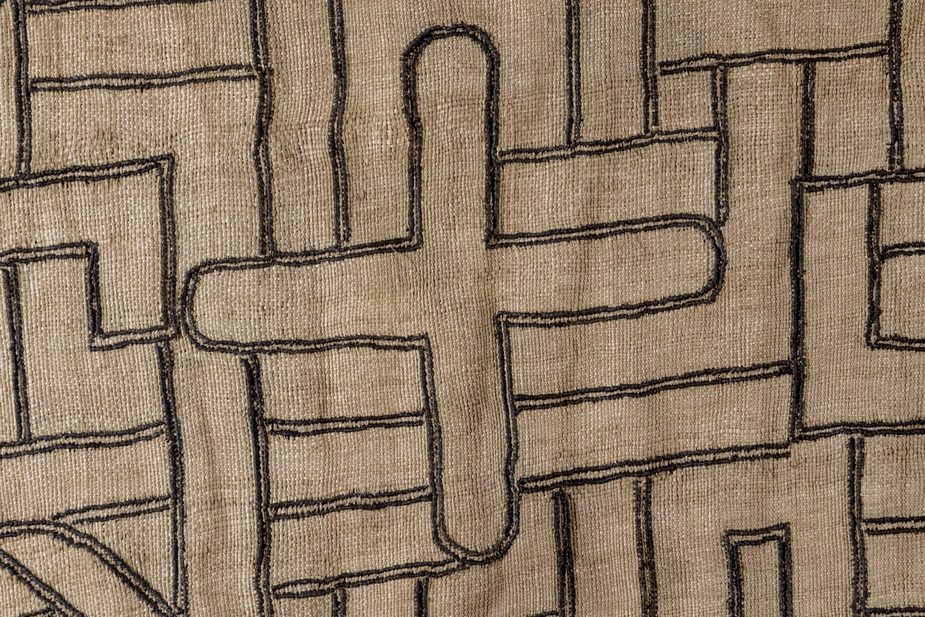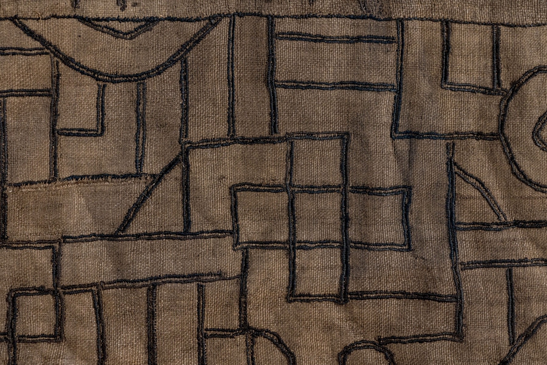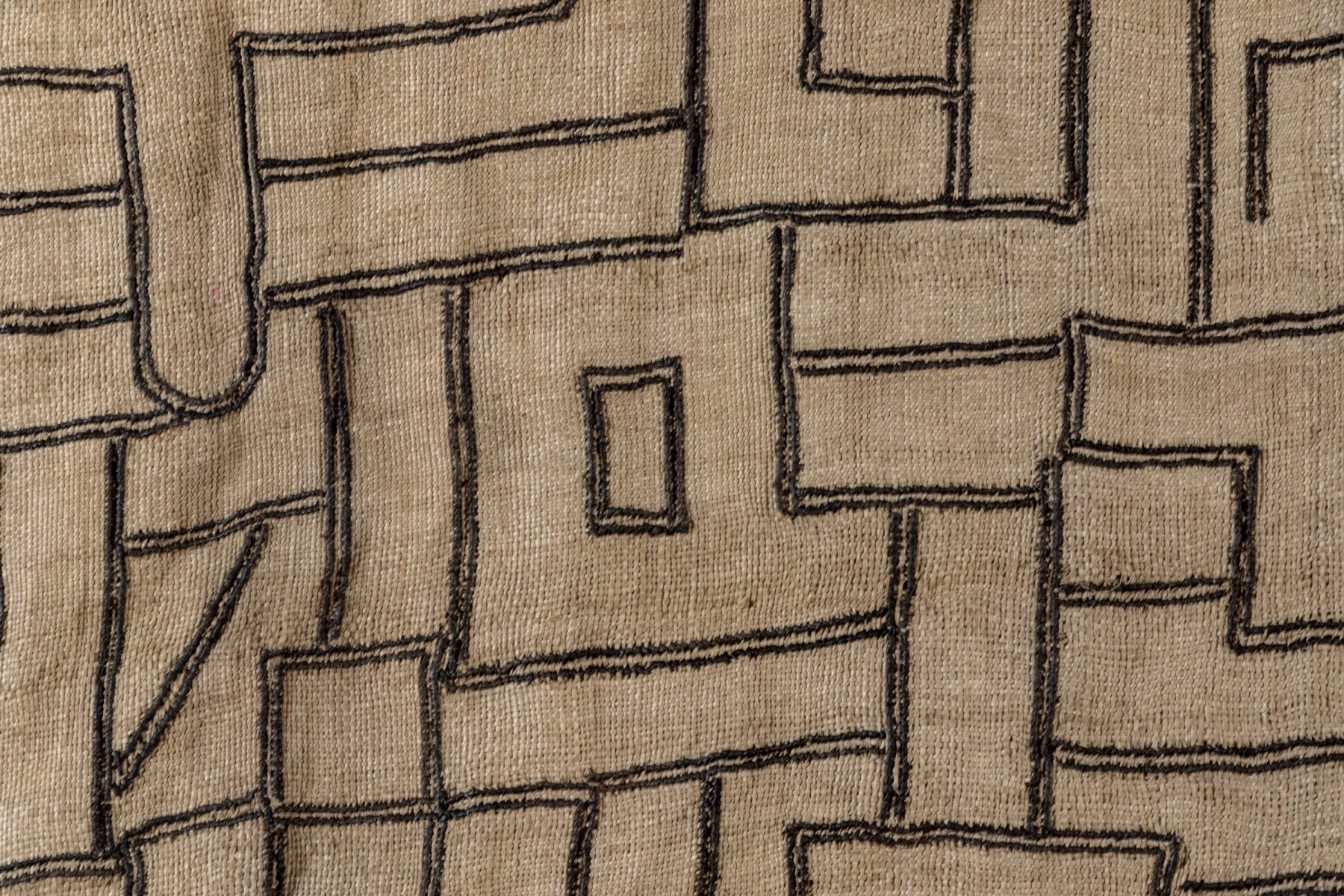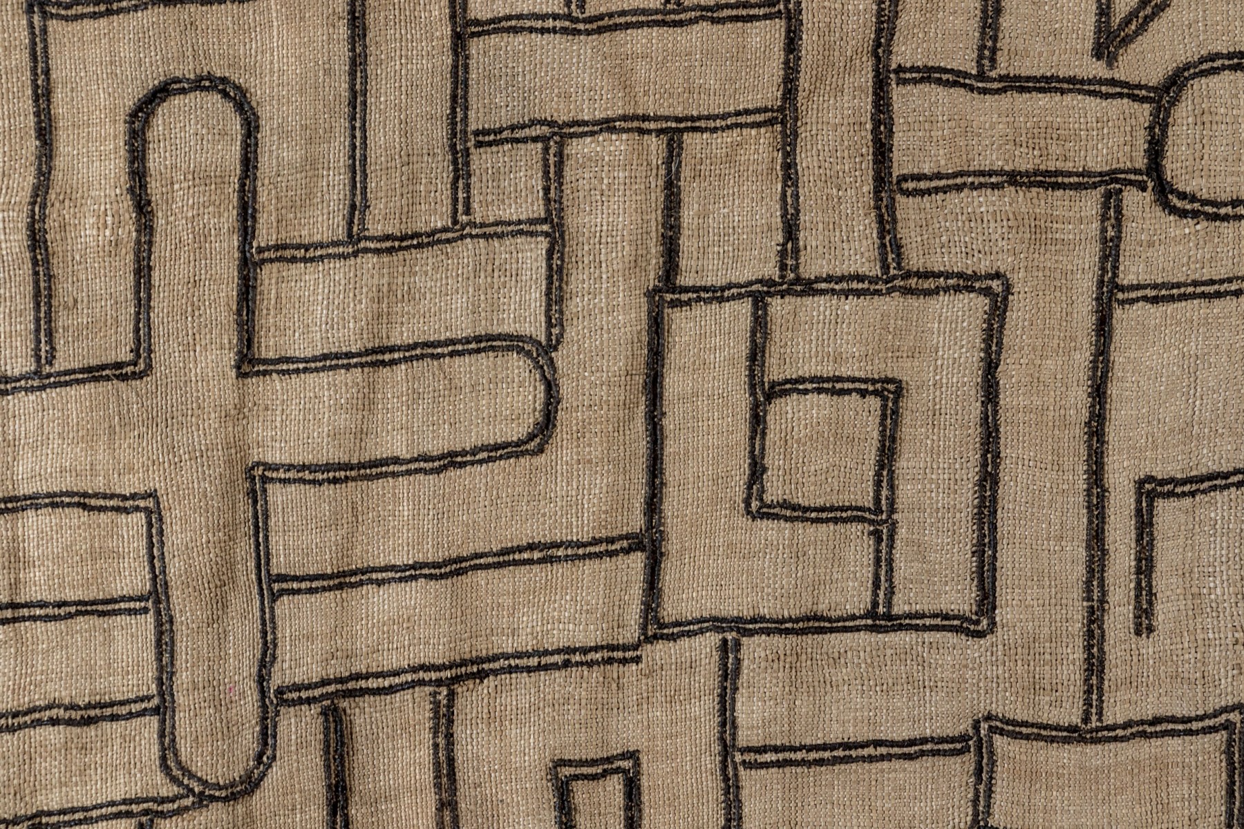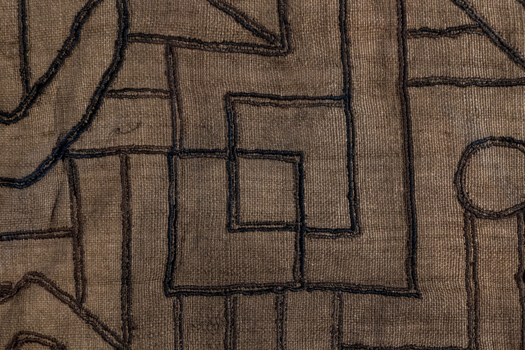 An excellent African Kuba textile in beige and brown with eye-catching geometric designs incorporating basketweave motifs, circles, and arrows. Mounted to a white backing and displayed in a black frame.