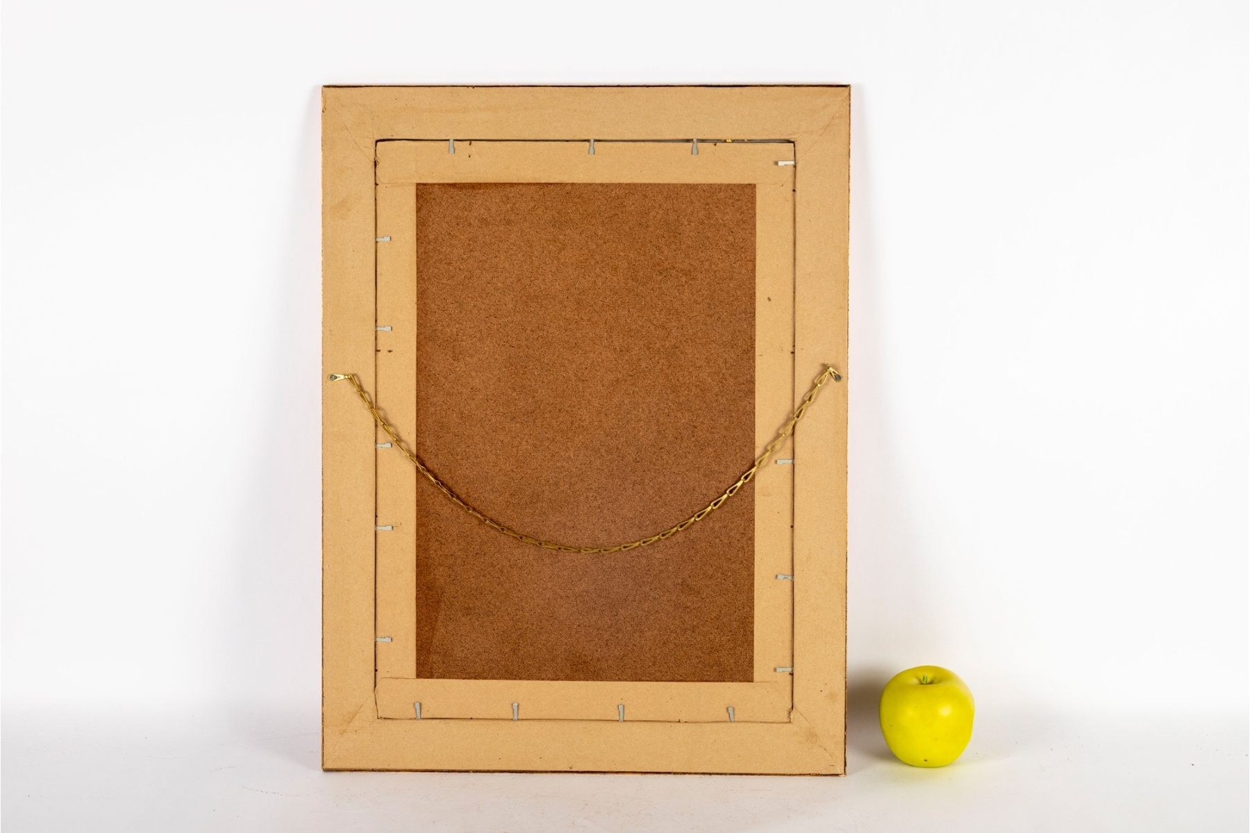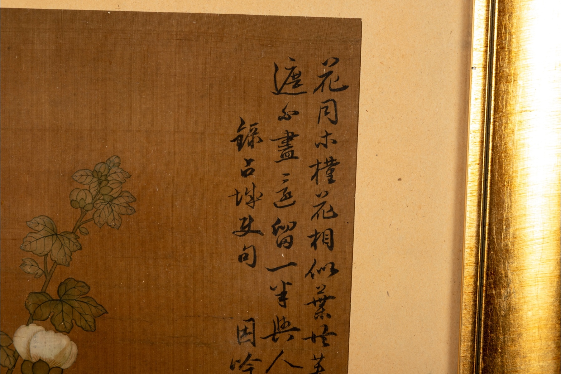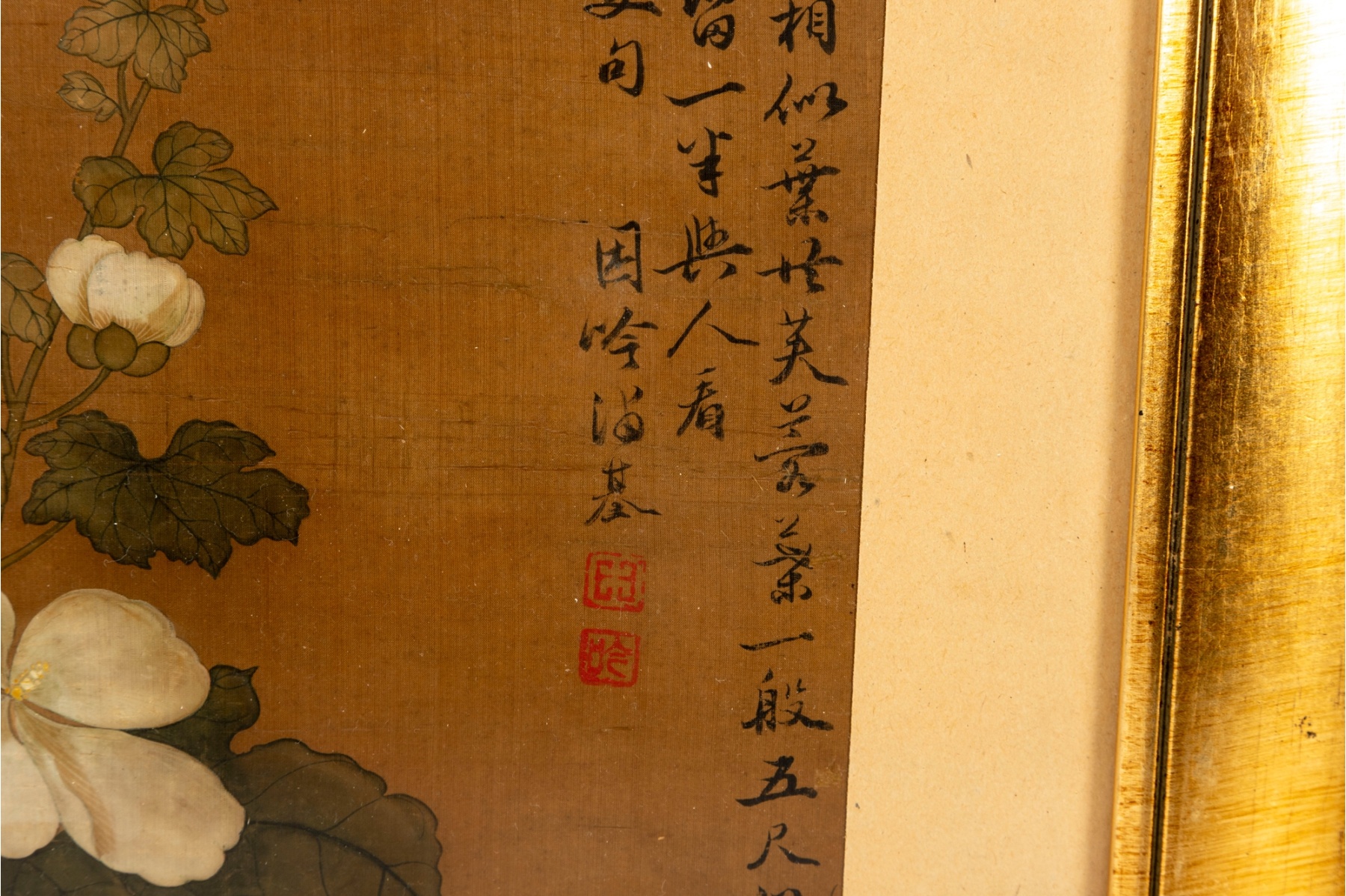 Visible light creases and scattered surface wear to the silk, mild toning to matting, and minor scuffs to frame corners.