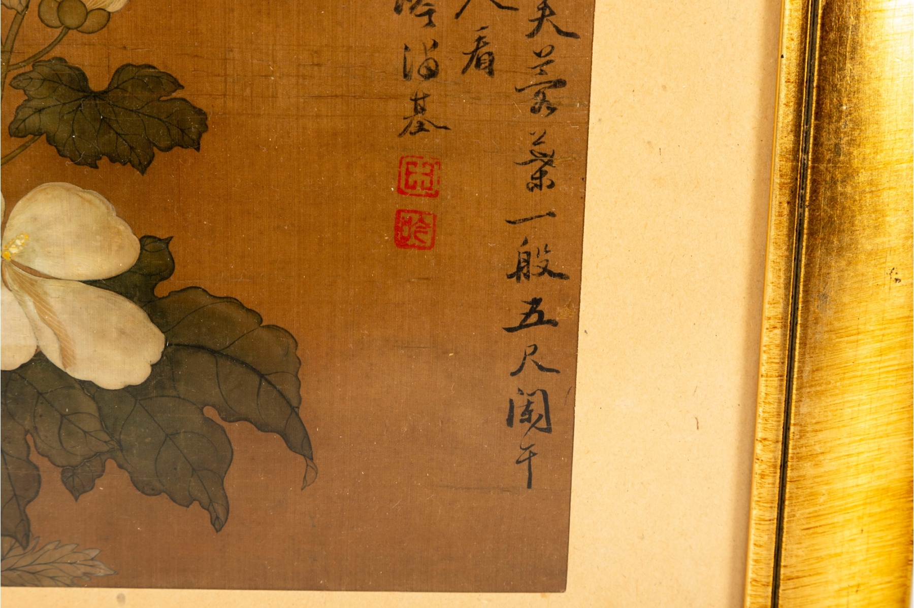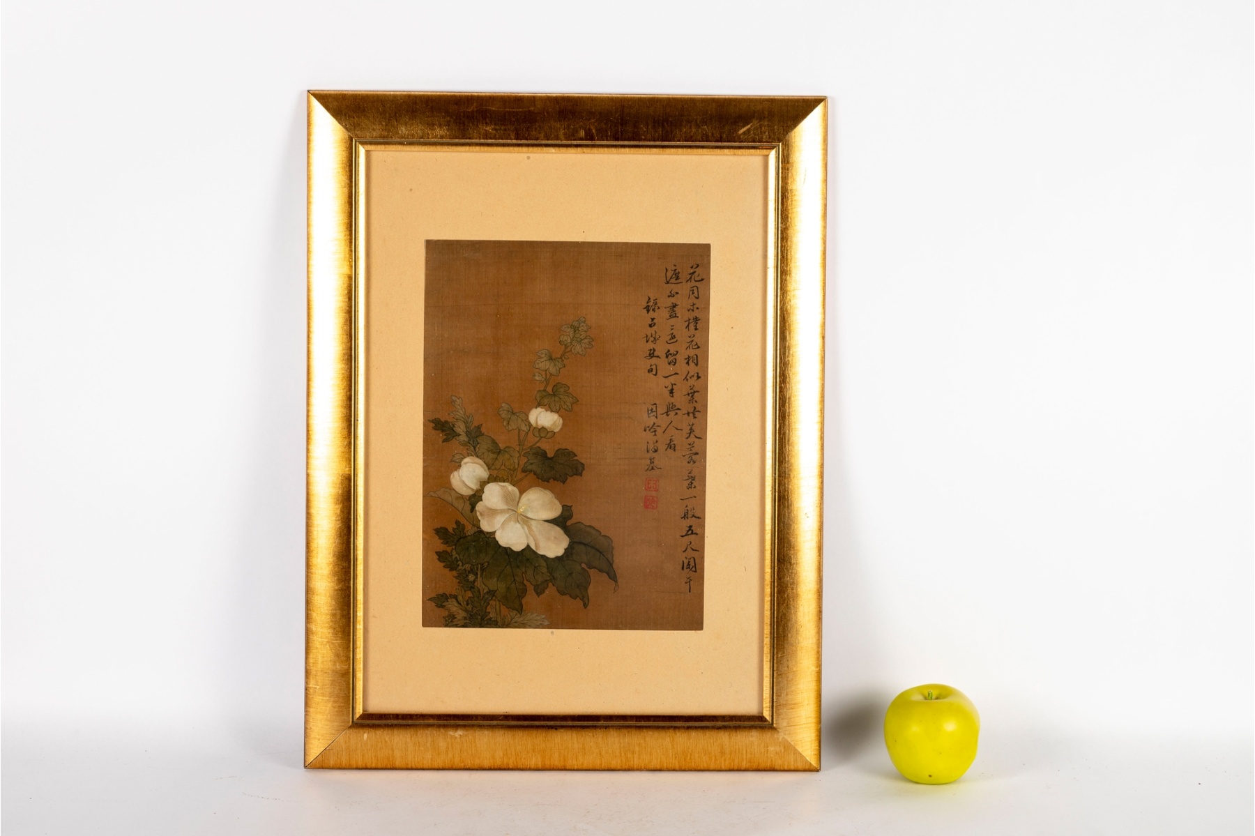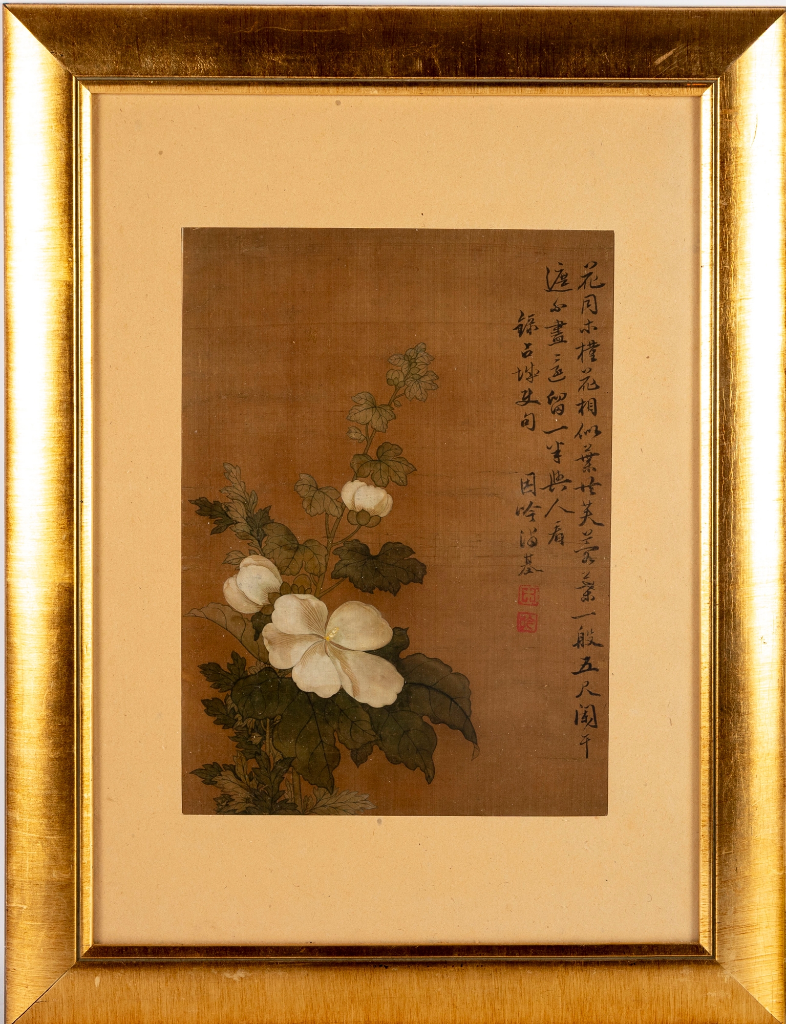 A delicate Chinese watercolor on silk depicting white blossoms with buds and leafy stems rendered in subtle natural hues. The painting features an inscription and two red artist seals along the upper right.