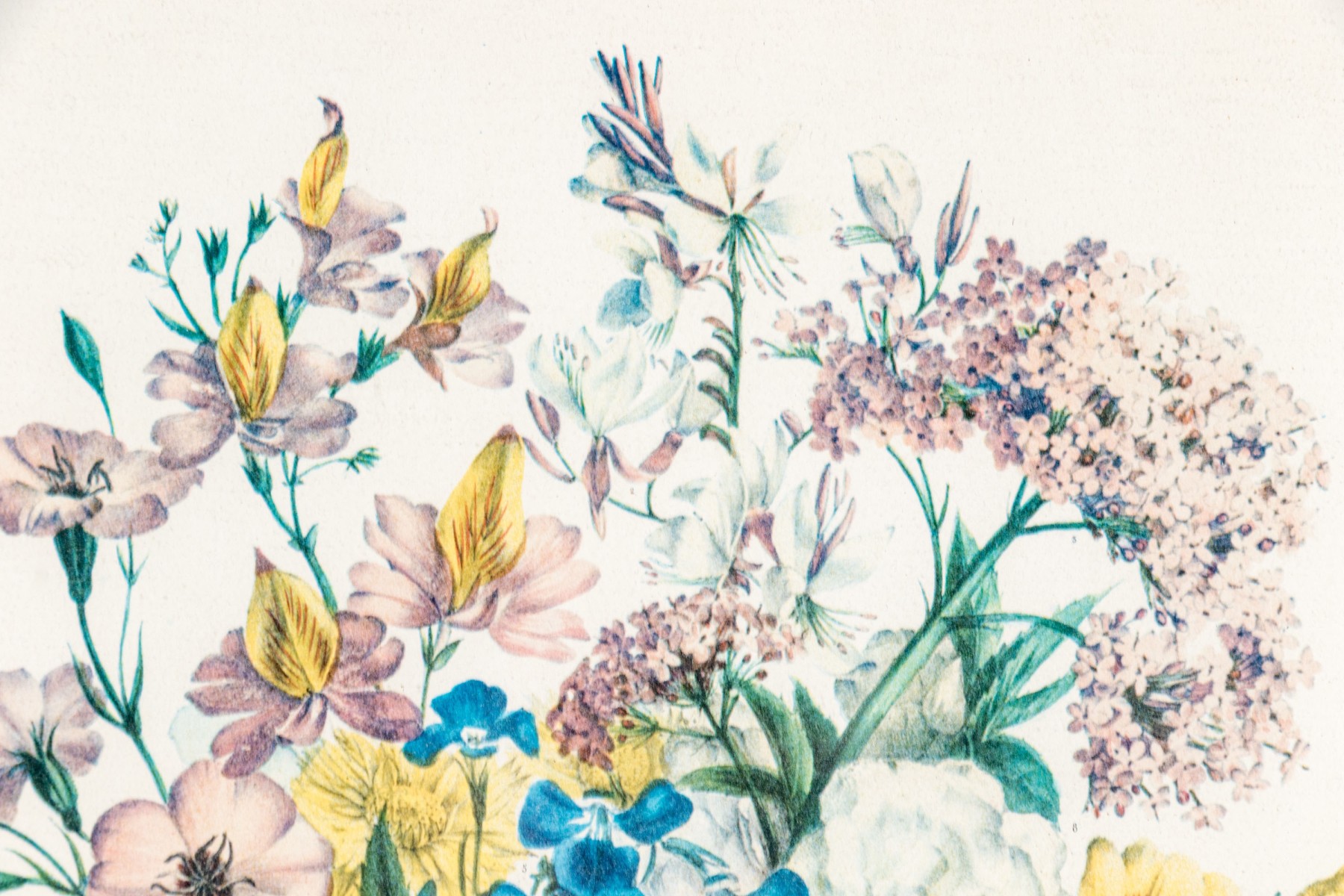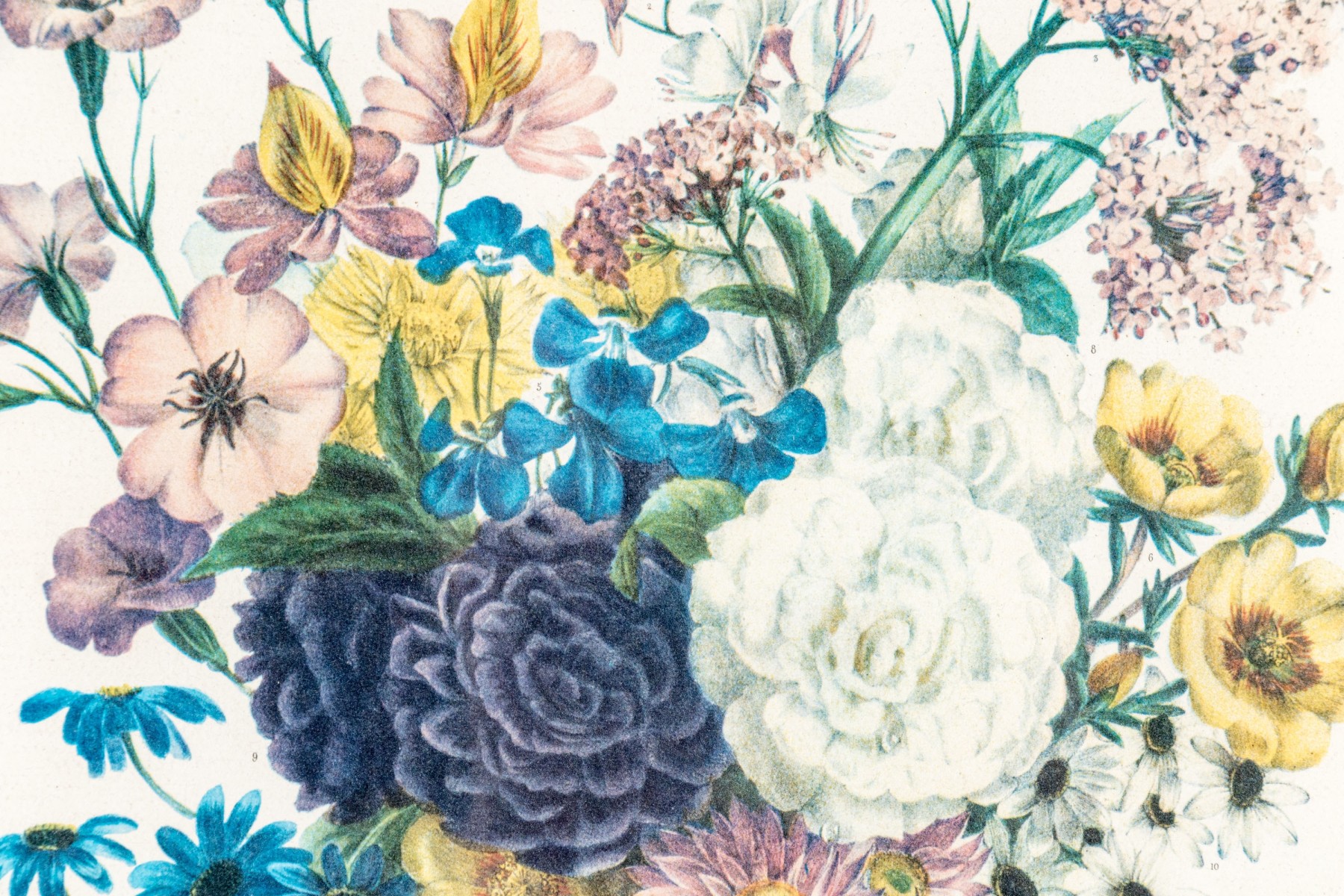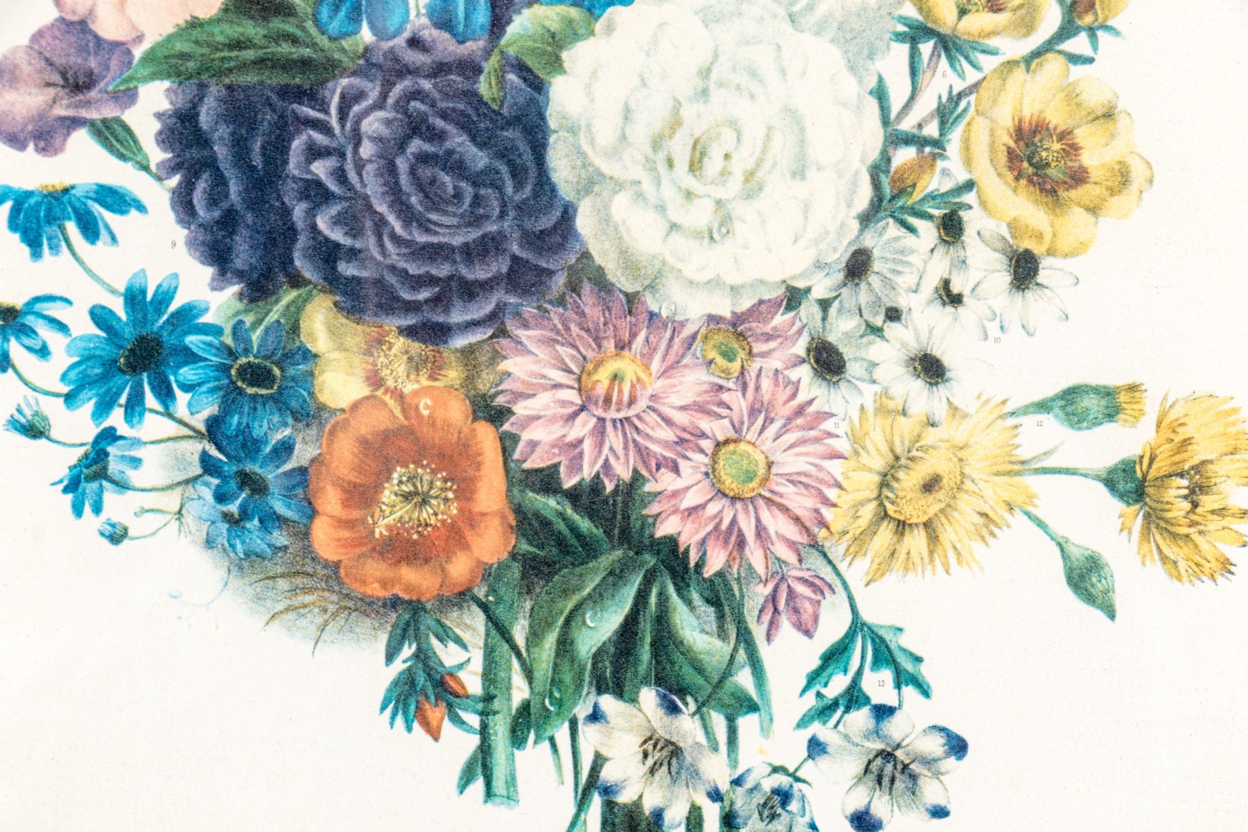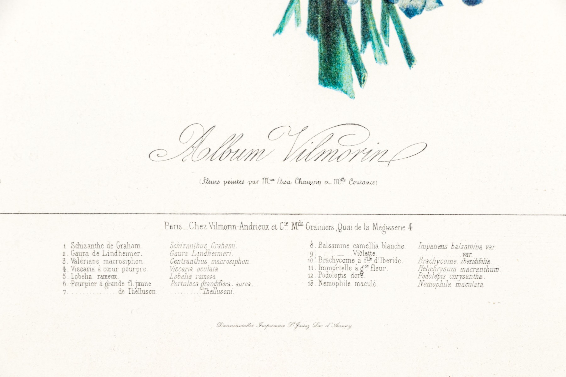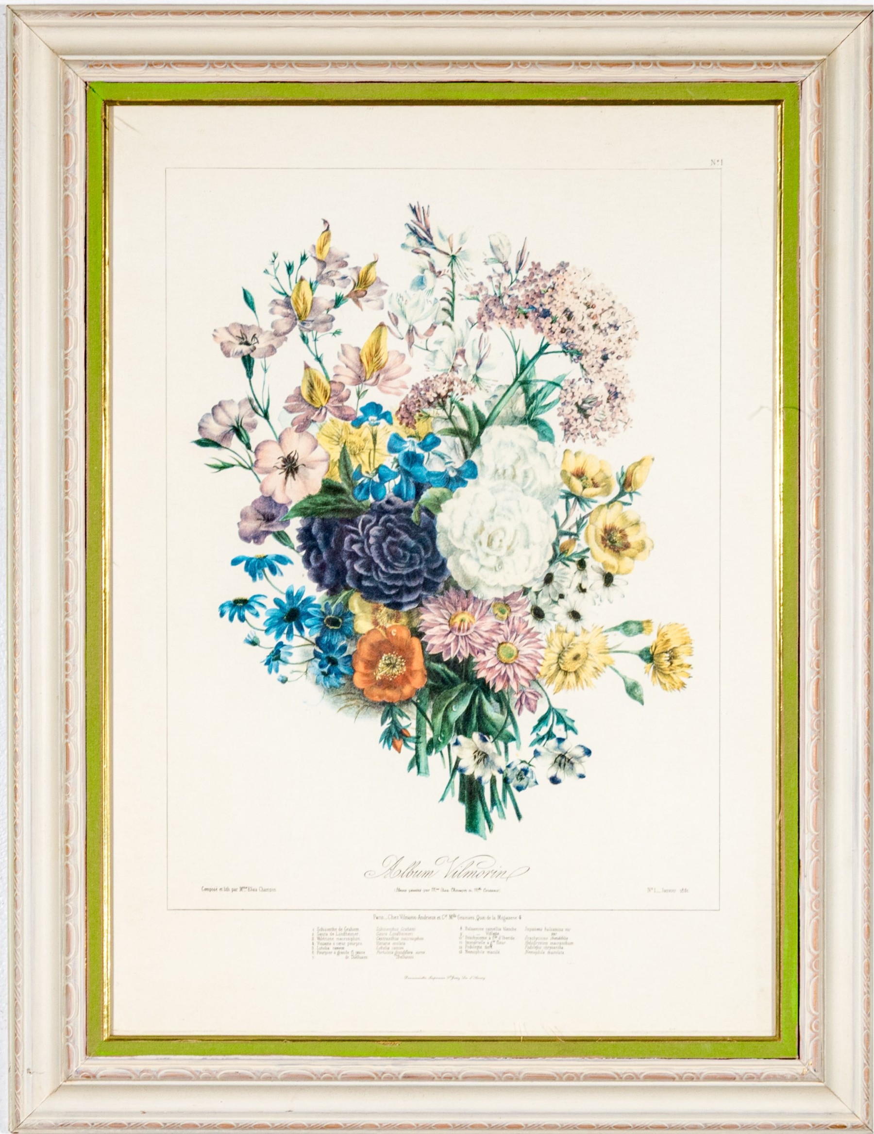 After the original Album Vilmorin. A bouquet of various colorful flowers all labeled below. Presented in a white and gilt frame with glass.