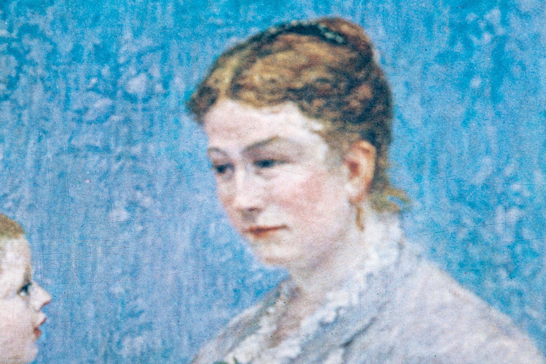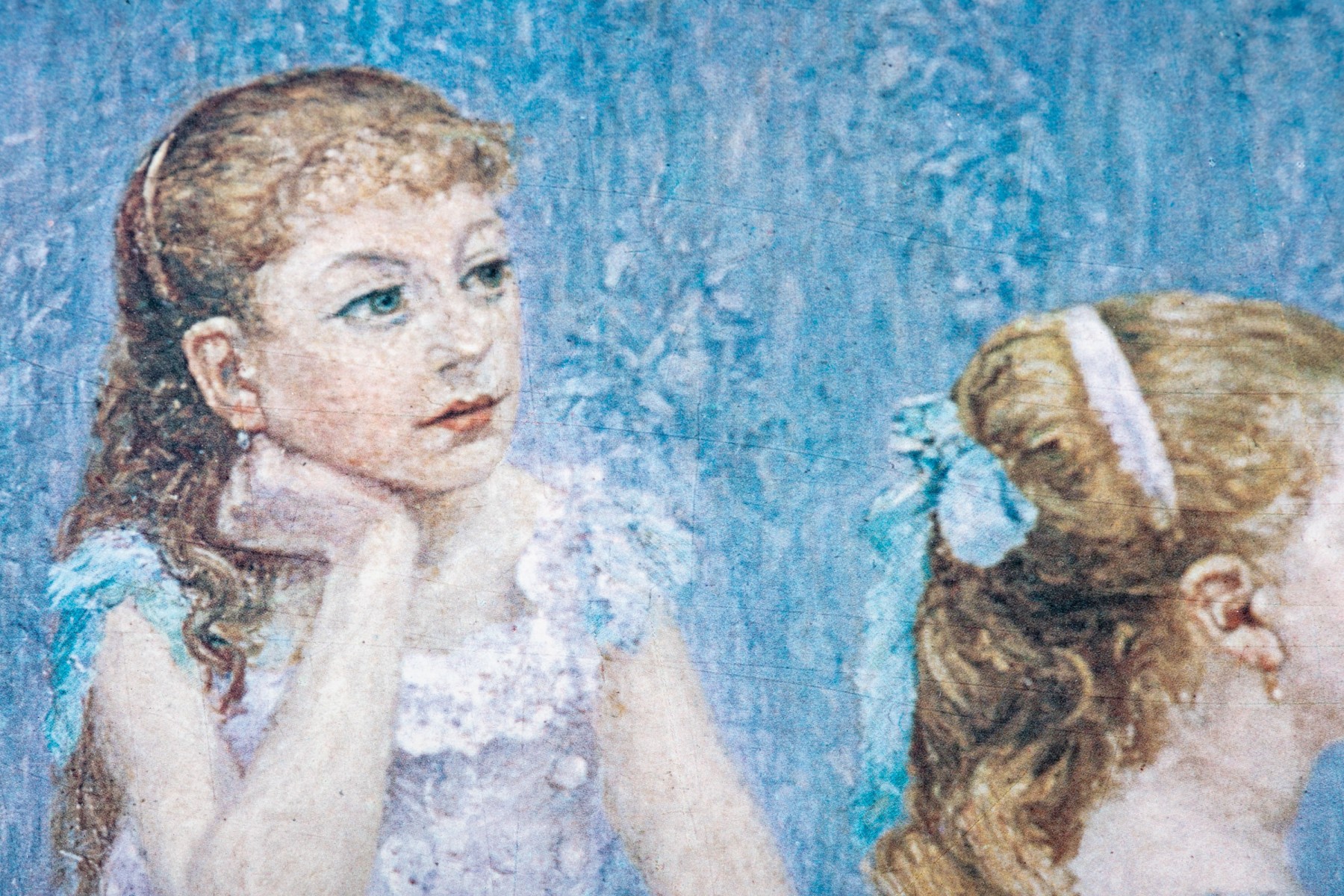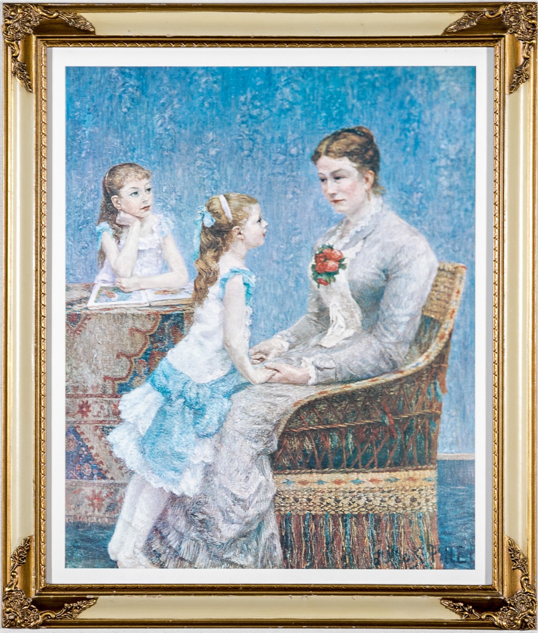 After an original artwork, here signed lower right in plate. A charming late 19th c. composition with a seated lady with her two sweet daughters in an interior. Presented in a vintage ecru painted frame with gilt details.