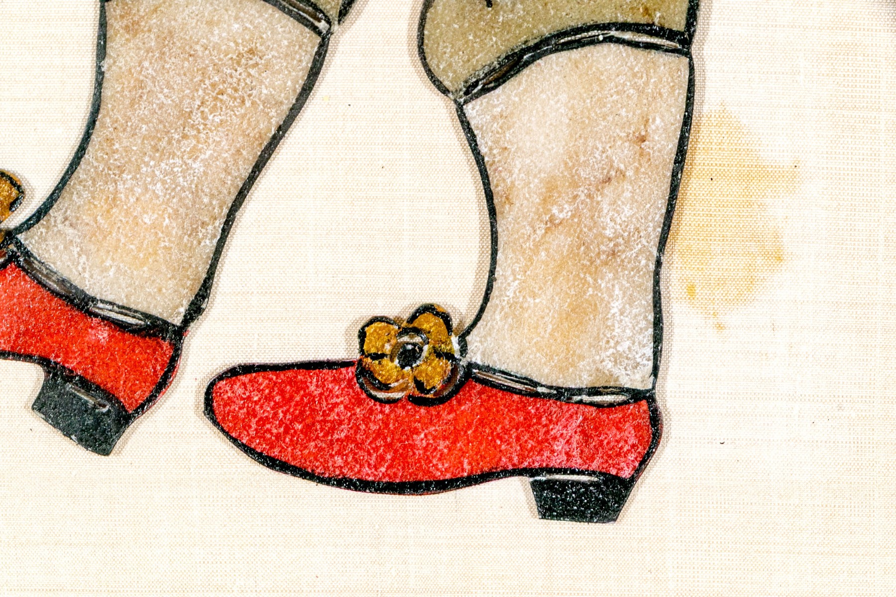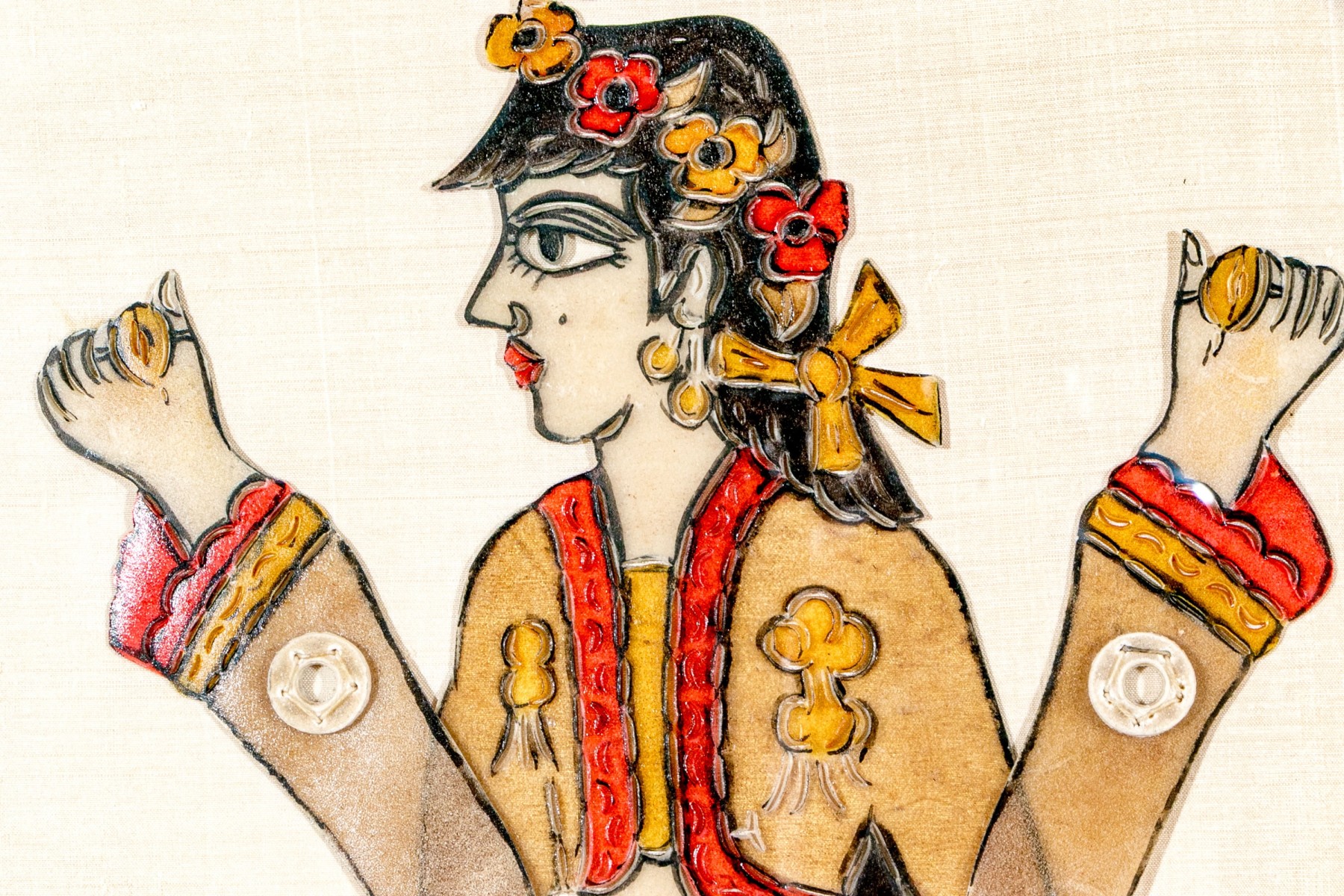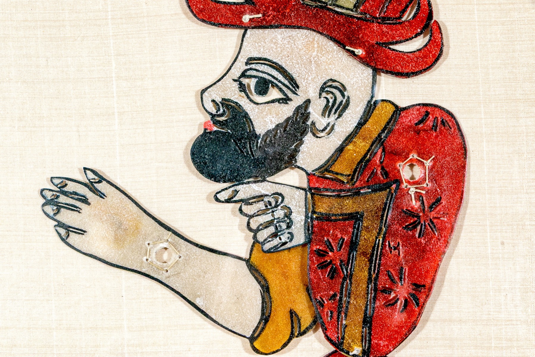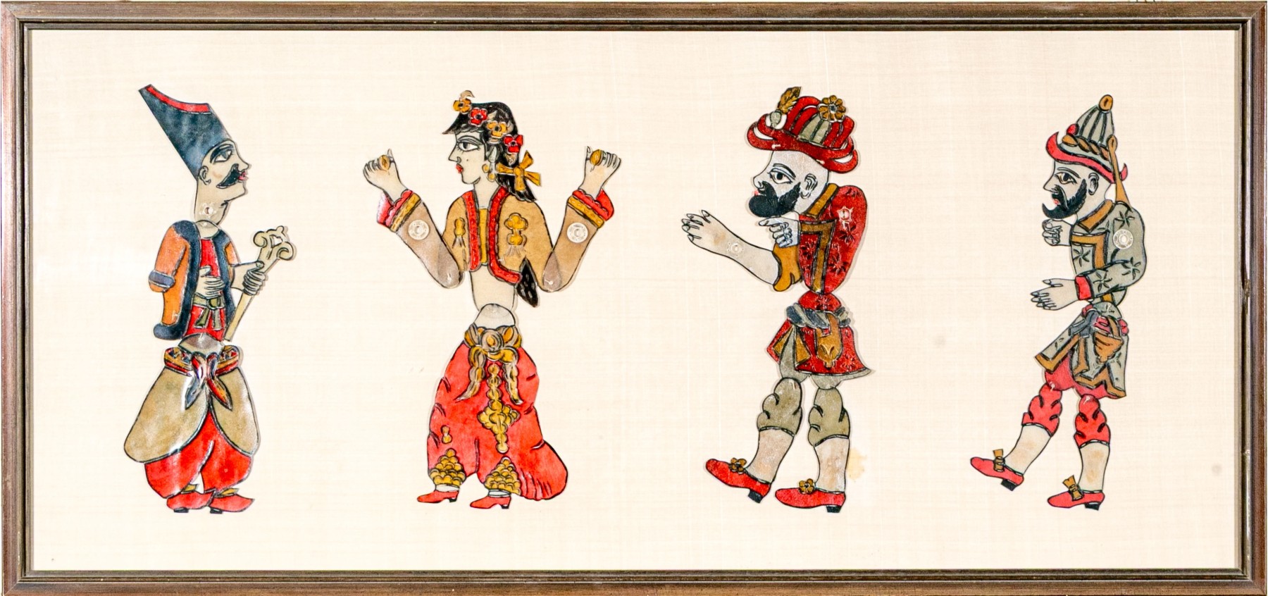A delightful display of mixed media Turkish shadow puppets including Karagöz and Hacivat. Four figures are seen in profile, wearing vibrant red, orange, brown, and gray attire against a cream-white ground.