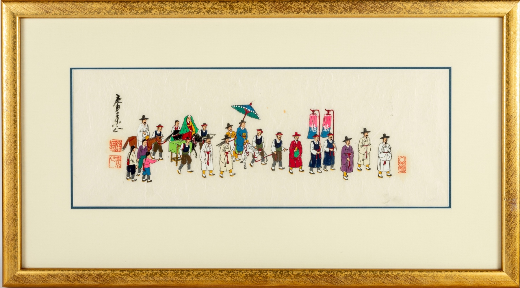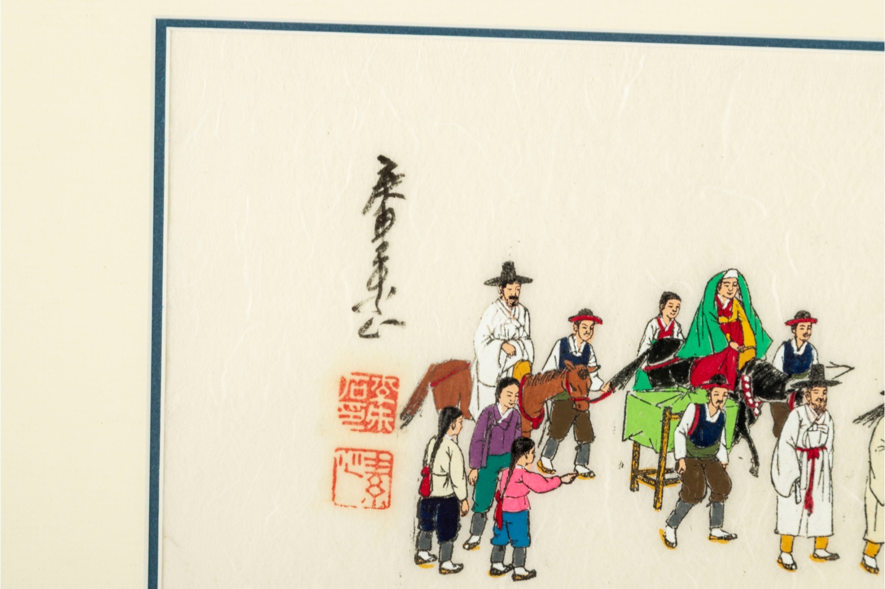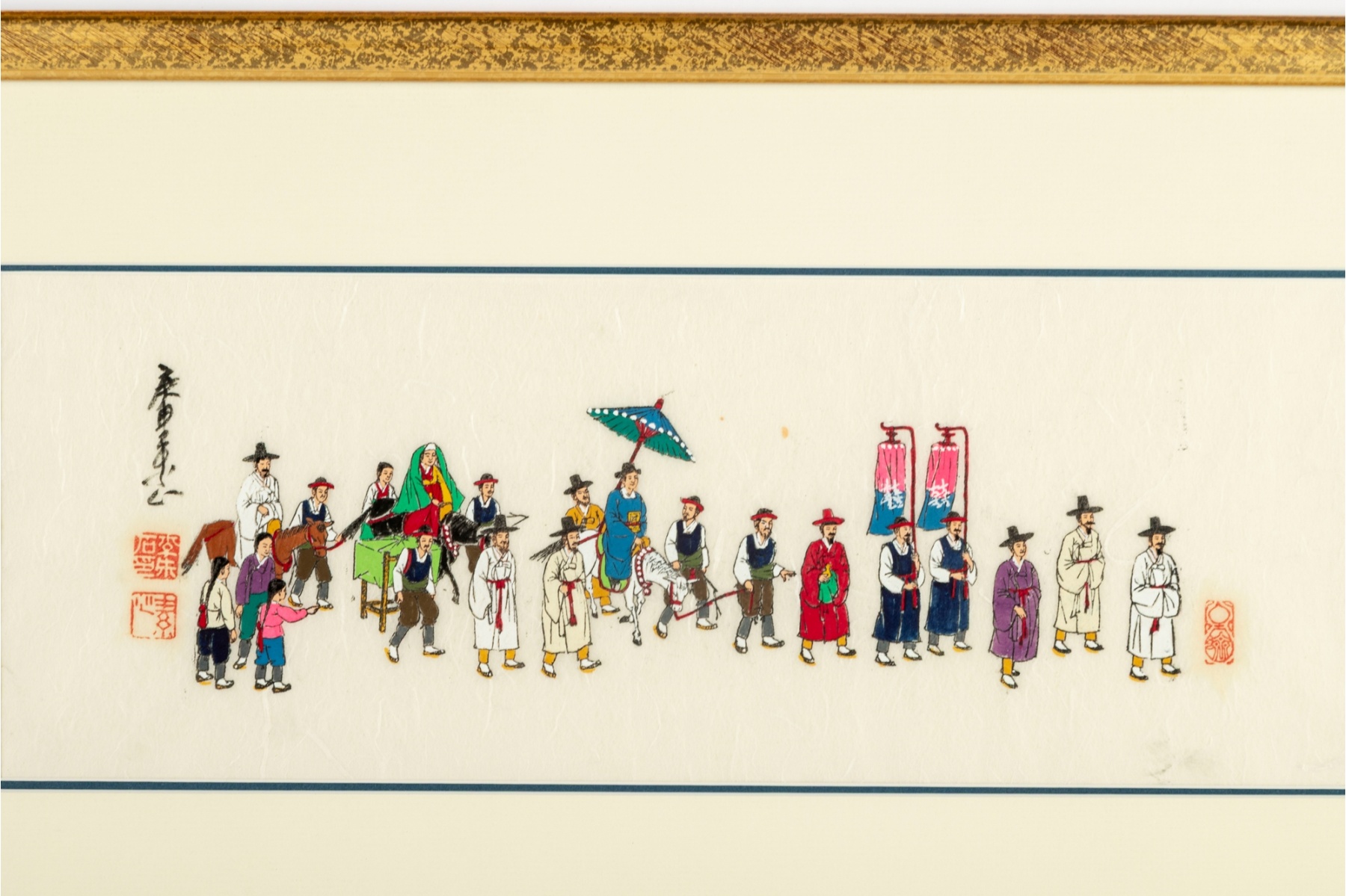 Colorful Korean folk art painting on rice paper depicting a lively ceremonial procession. The scene features finely detailed figures in traditional Joseon-era attire, including men carrying banners, musicians, and individuals on horseback and palanquin, possibly representing a wedding or royal procession. The work includes artist calligraphy and red seal stamps to the left and right margins.