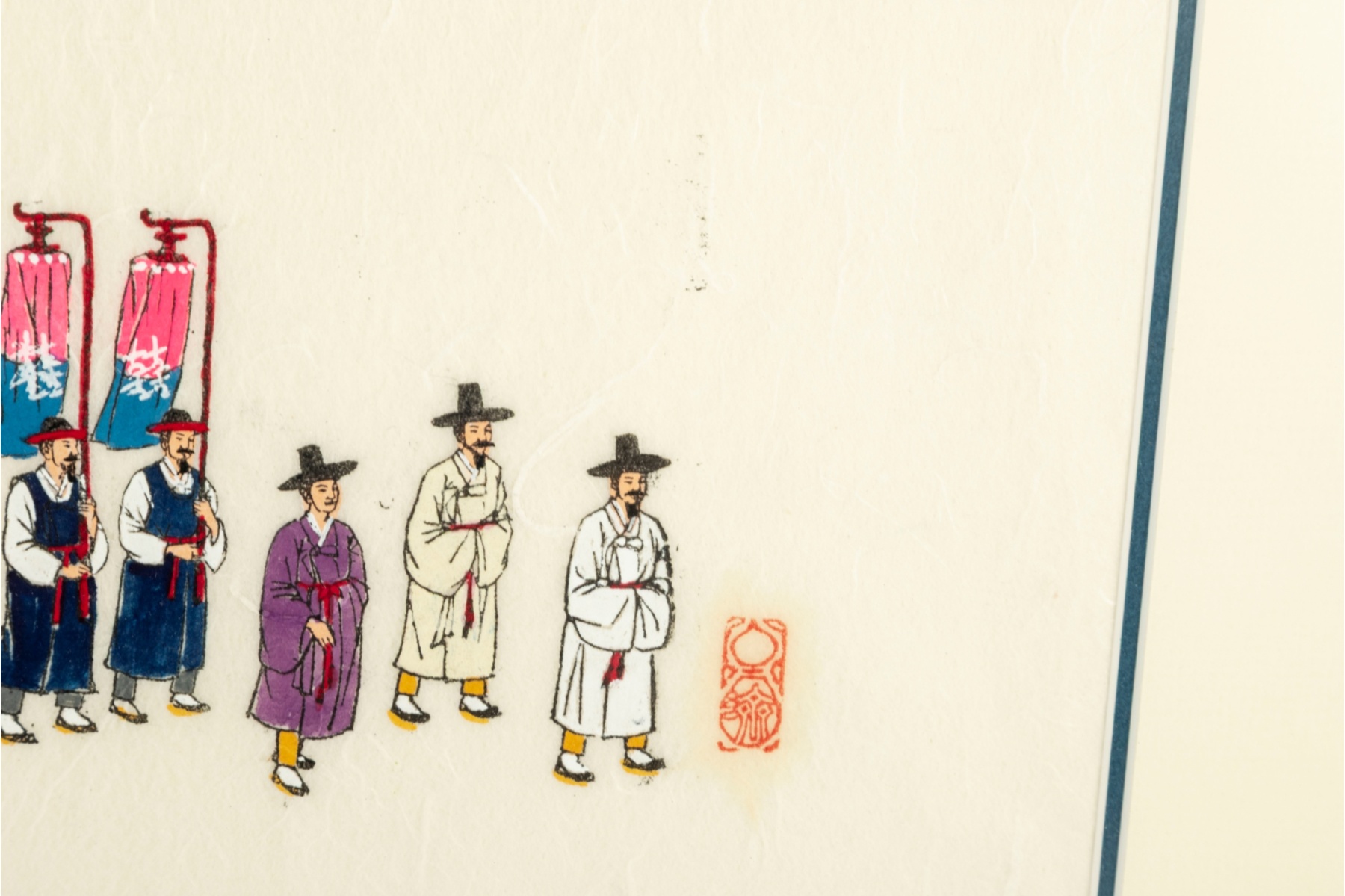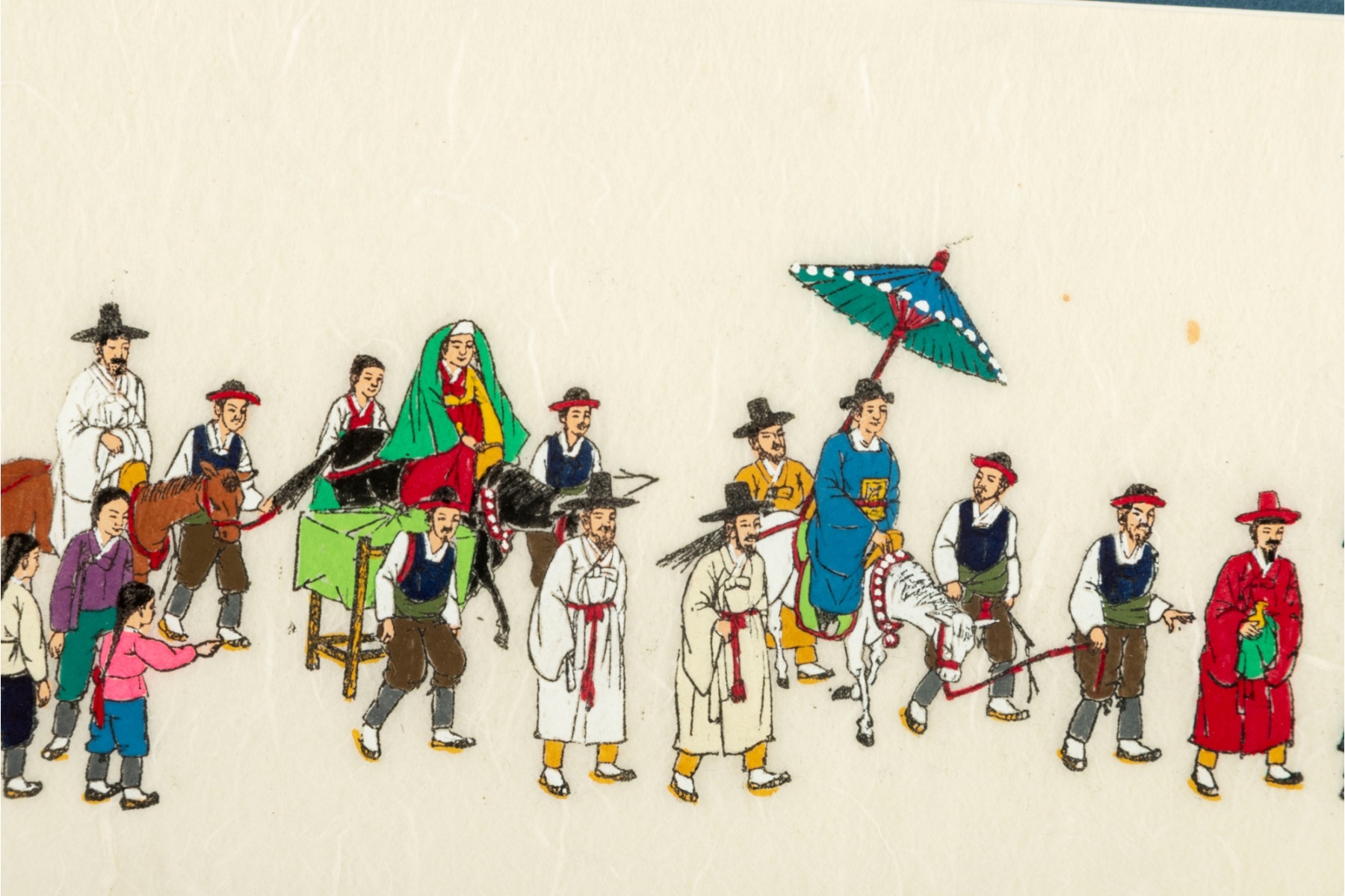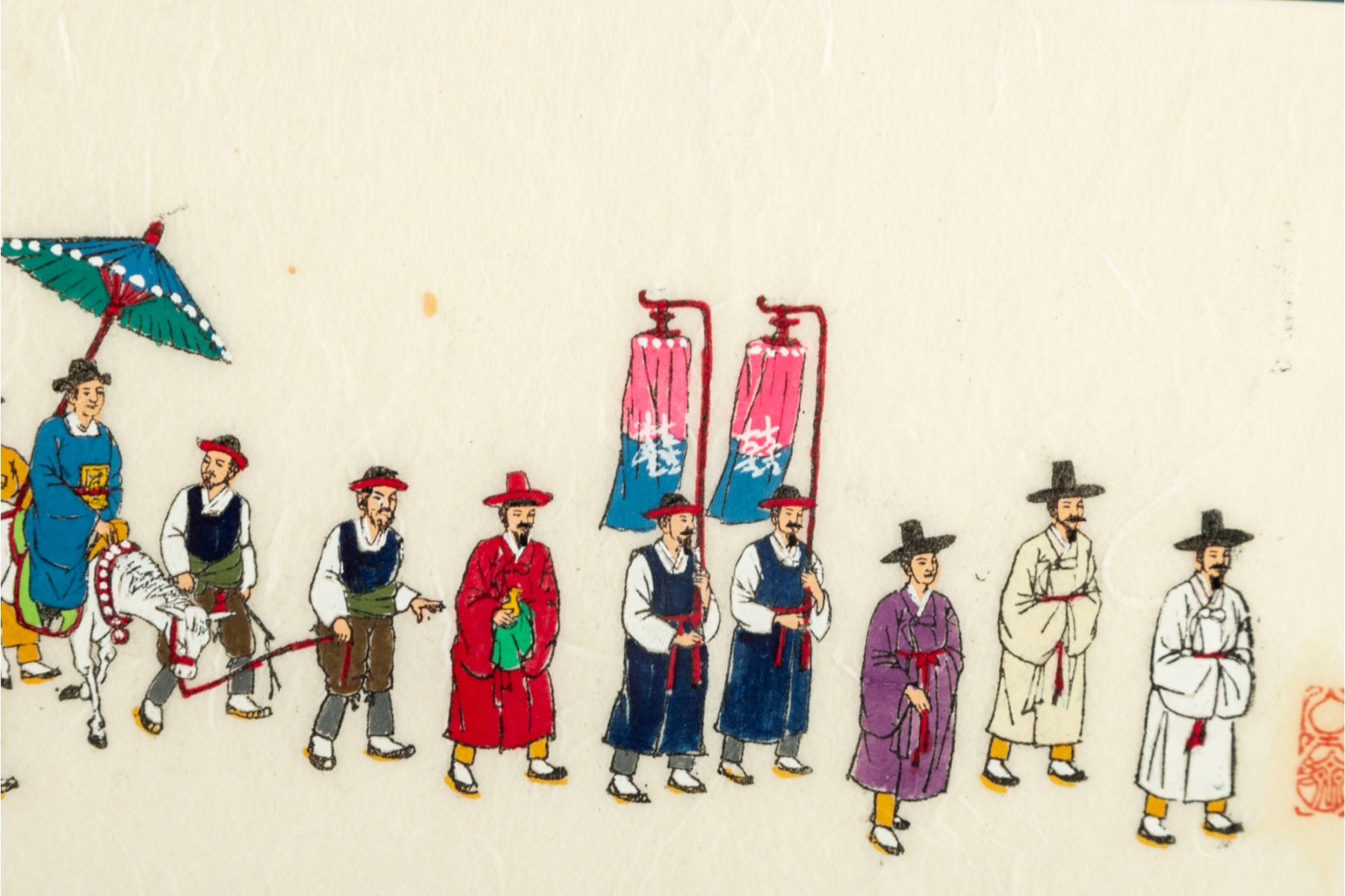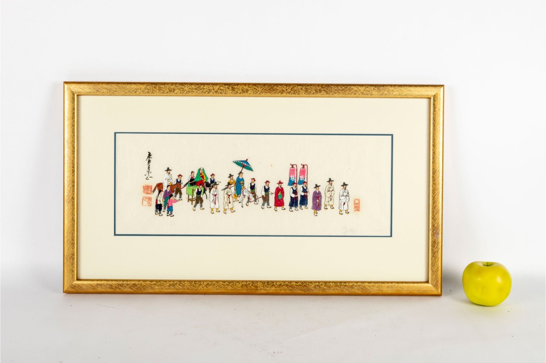 Colorful Korean folk art painting on rice paper depicting a lively ceremonial procession. The scene features finely detailed figures in traditional Joseon-era attire, including men carrying banners, musicians, and individuals on horseback and palanquin, possibly representing a wedding or royal procession. The work includes artist calligraphy and red seal stamps to the left and right margins.