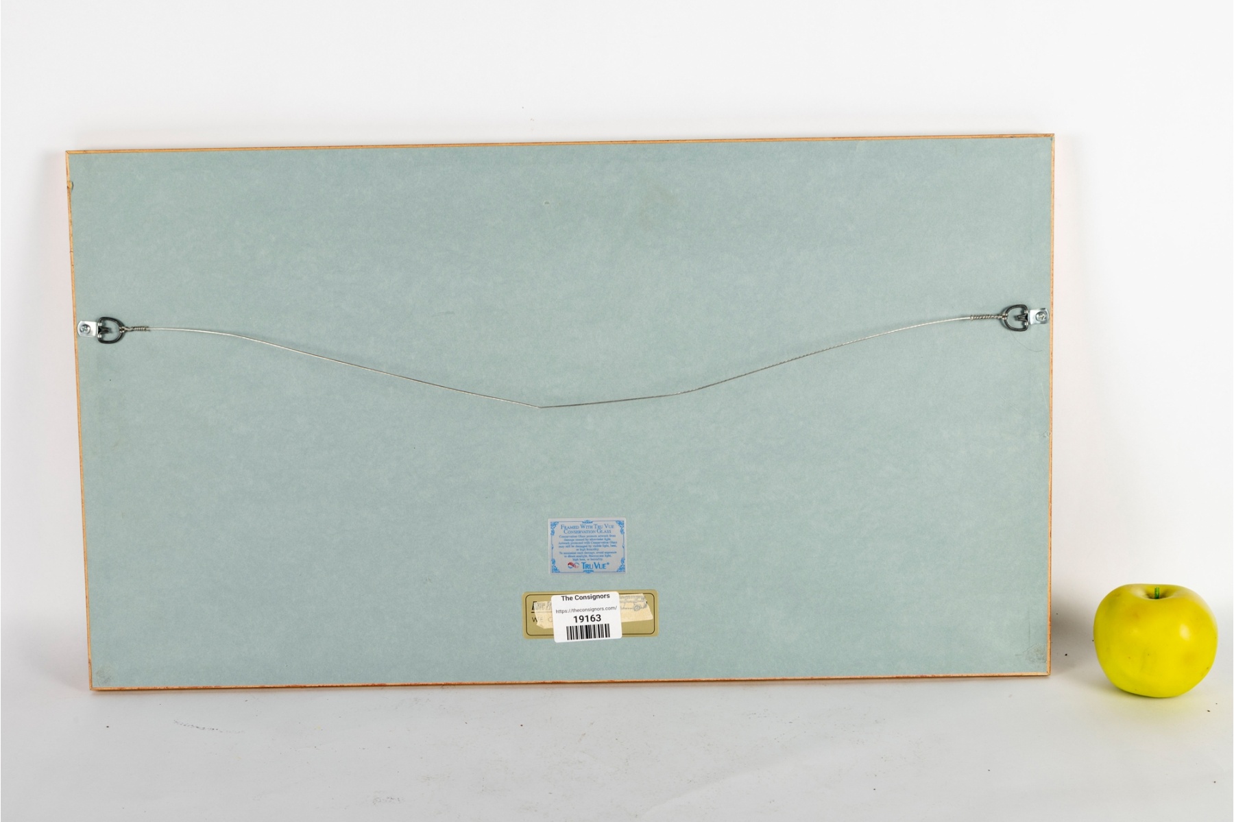 Presented under glass in a gold-tone frame with double matting in cream and blue accents.