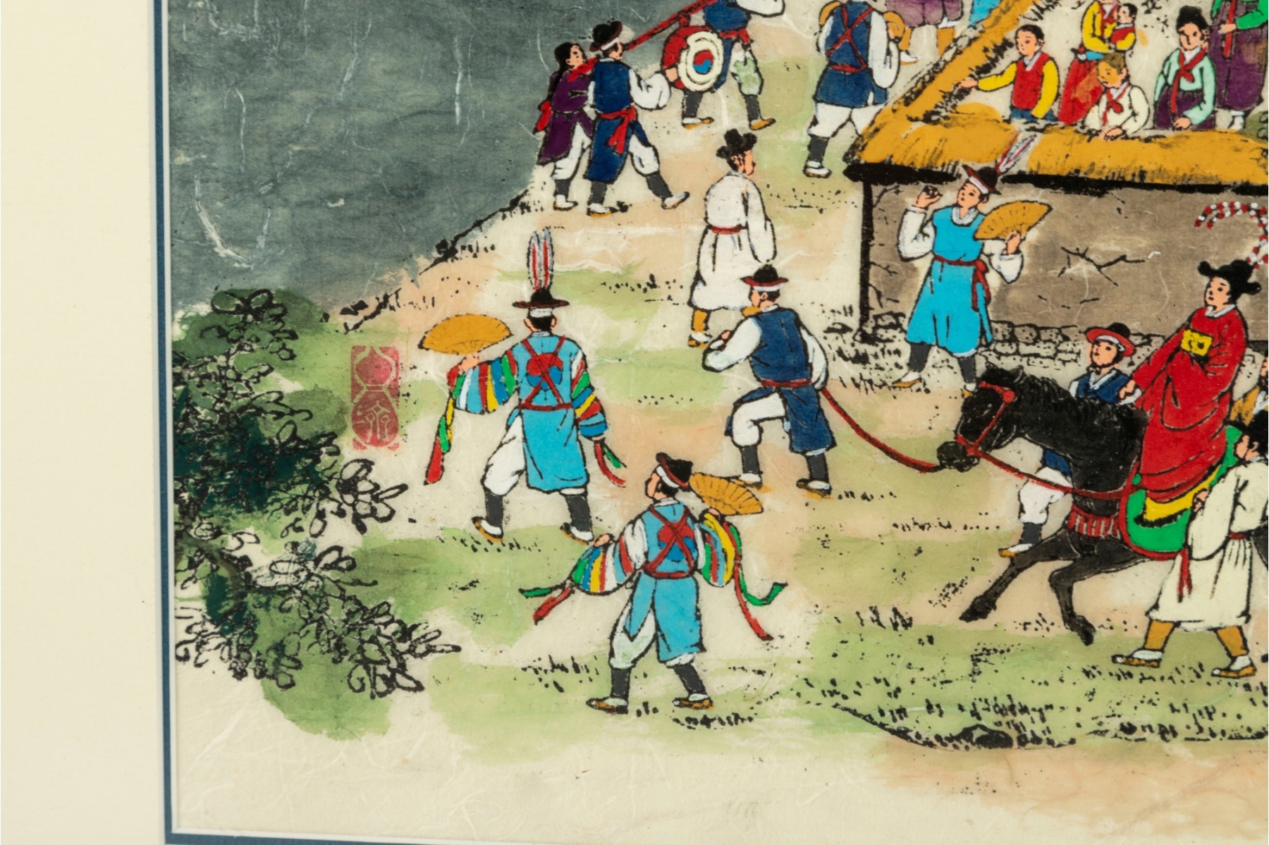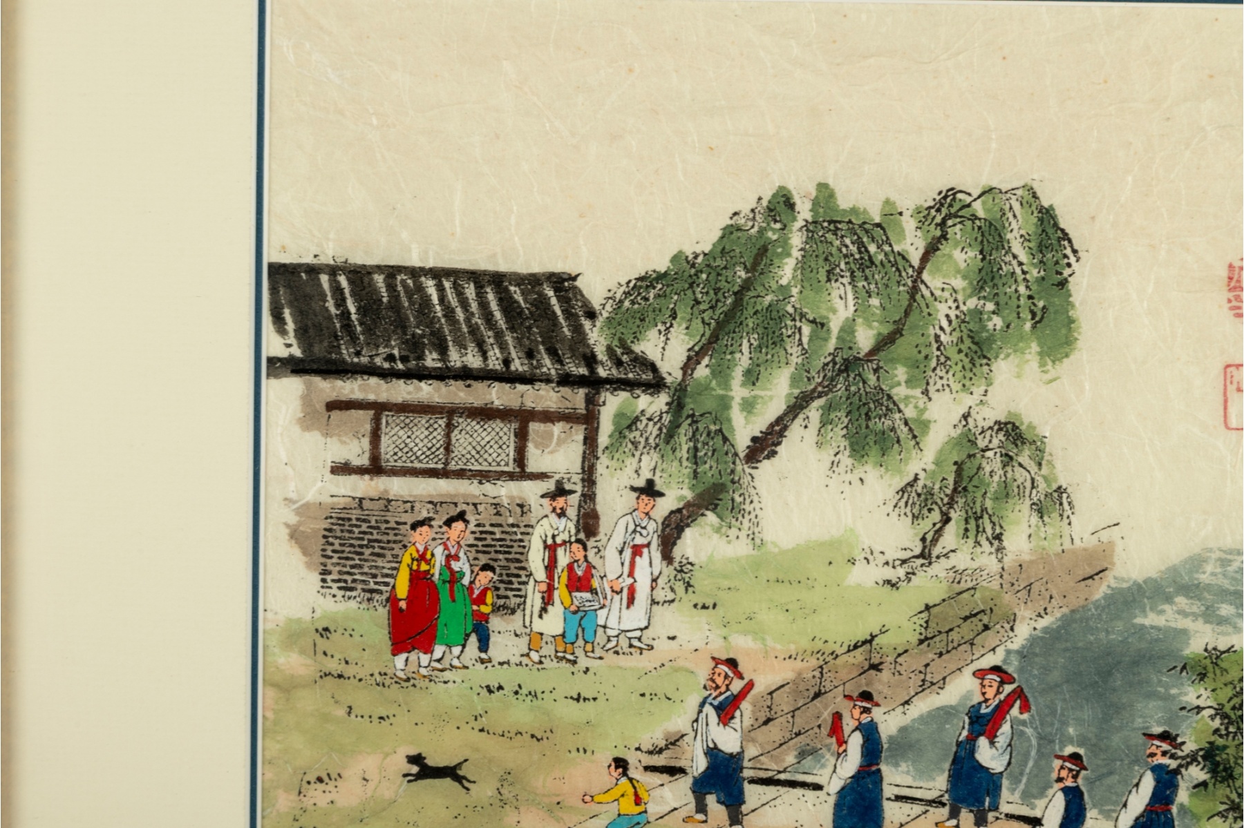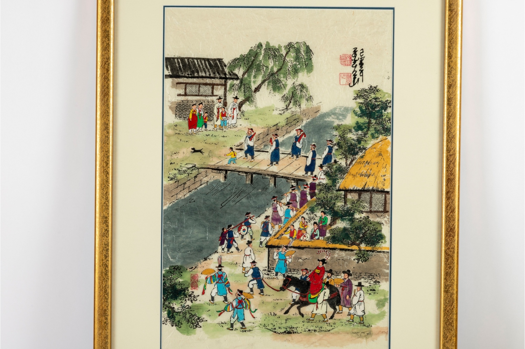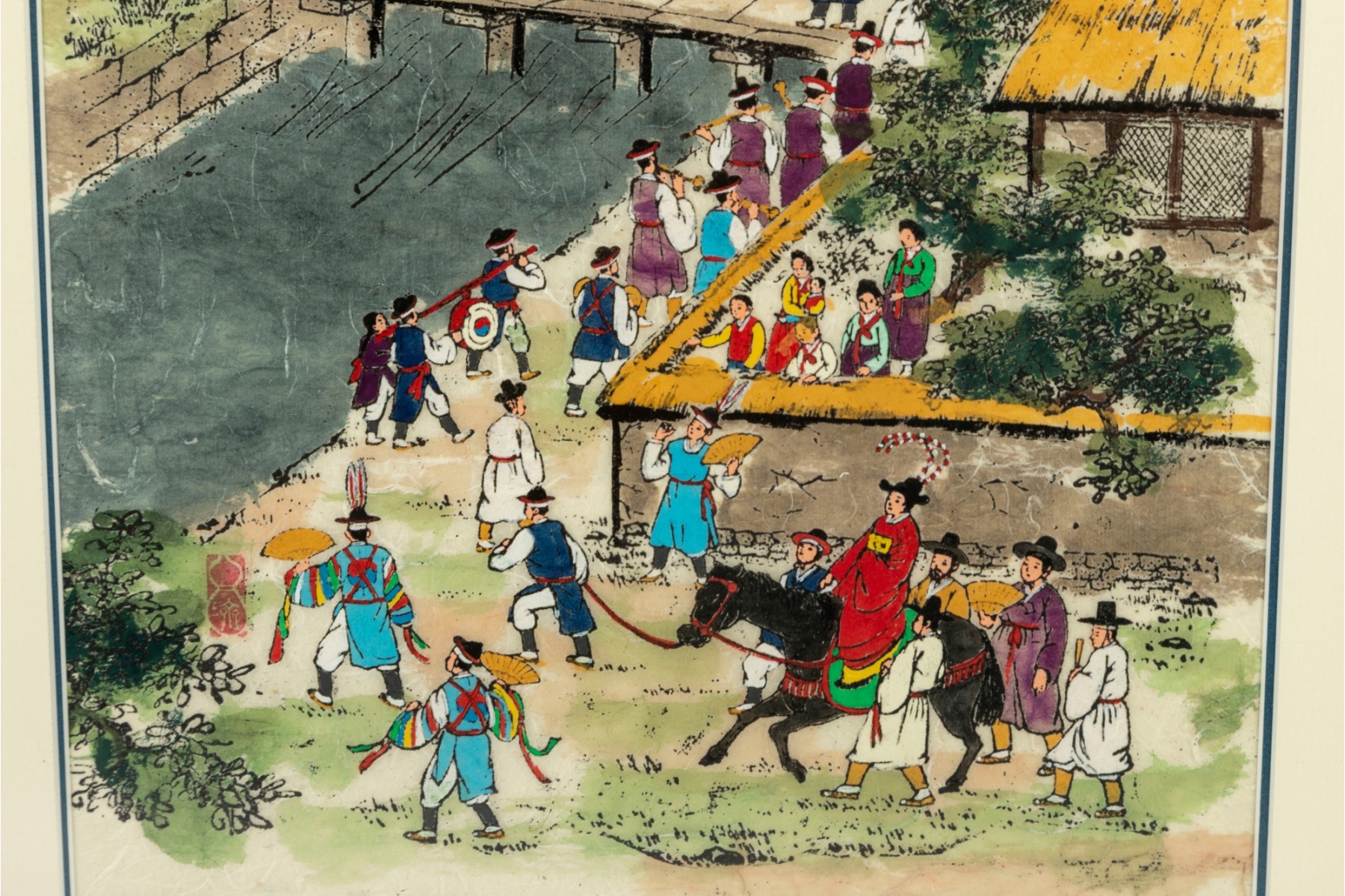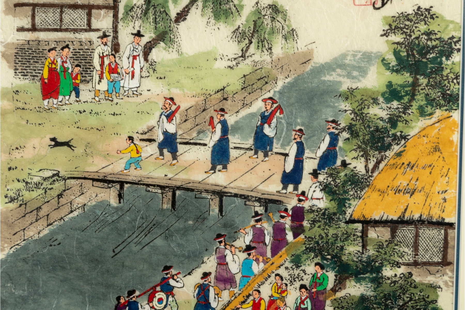Colorful Korean folk art painting depicting a lively village procession along a riverside path. Figures in traditional hanbok are shown crossing a wooden bridge, playing instruments, and escorting a noblewoman on horseback beneath a bright sky and lush greenery. The scene captures a joyful and bustling moment of daily life or ceremonial festivity, rendered with vivid pigments and fine black outlining typical of minhwa (folk painting) traditions.
