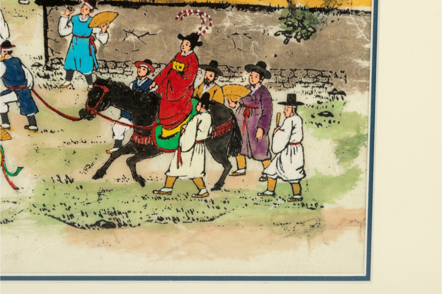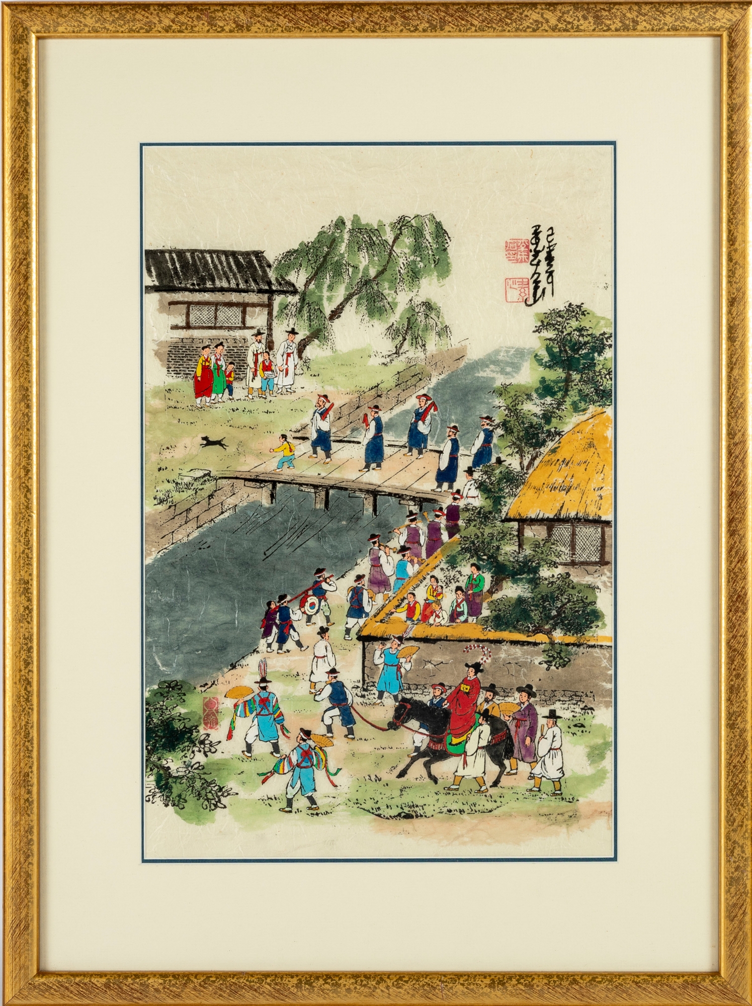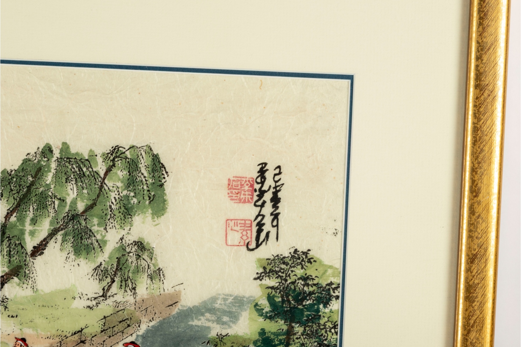 Hand-painted on textured mulberry paper with visible fibers, bearing artist’s signature and red seals to the upper right. Nicely matted and framed under glass in a gilt frame.