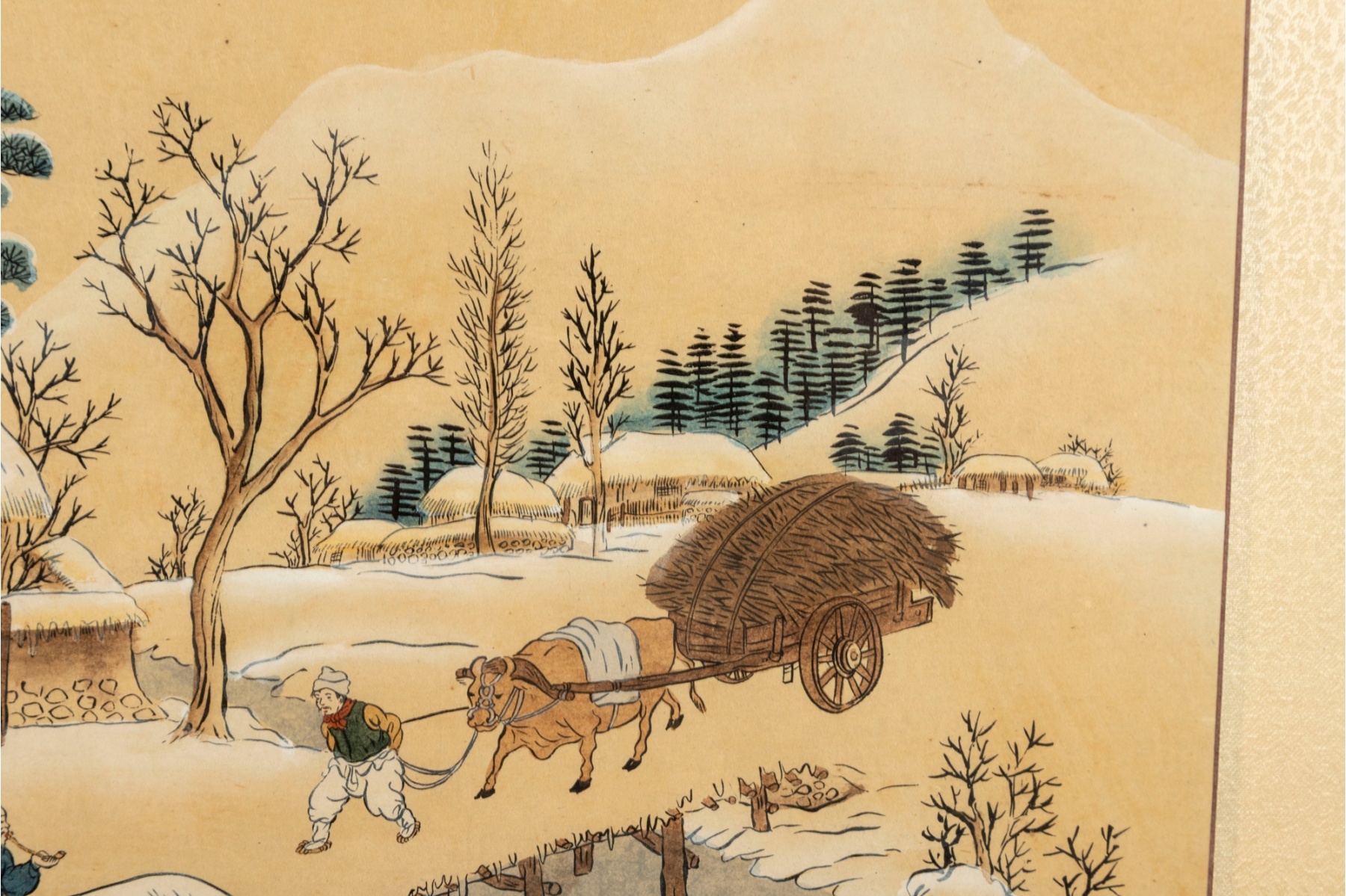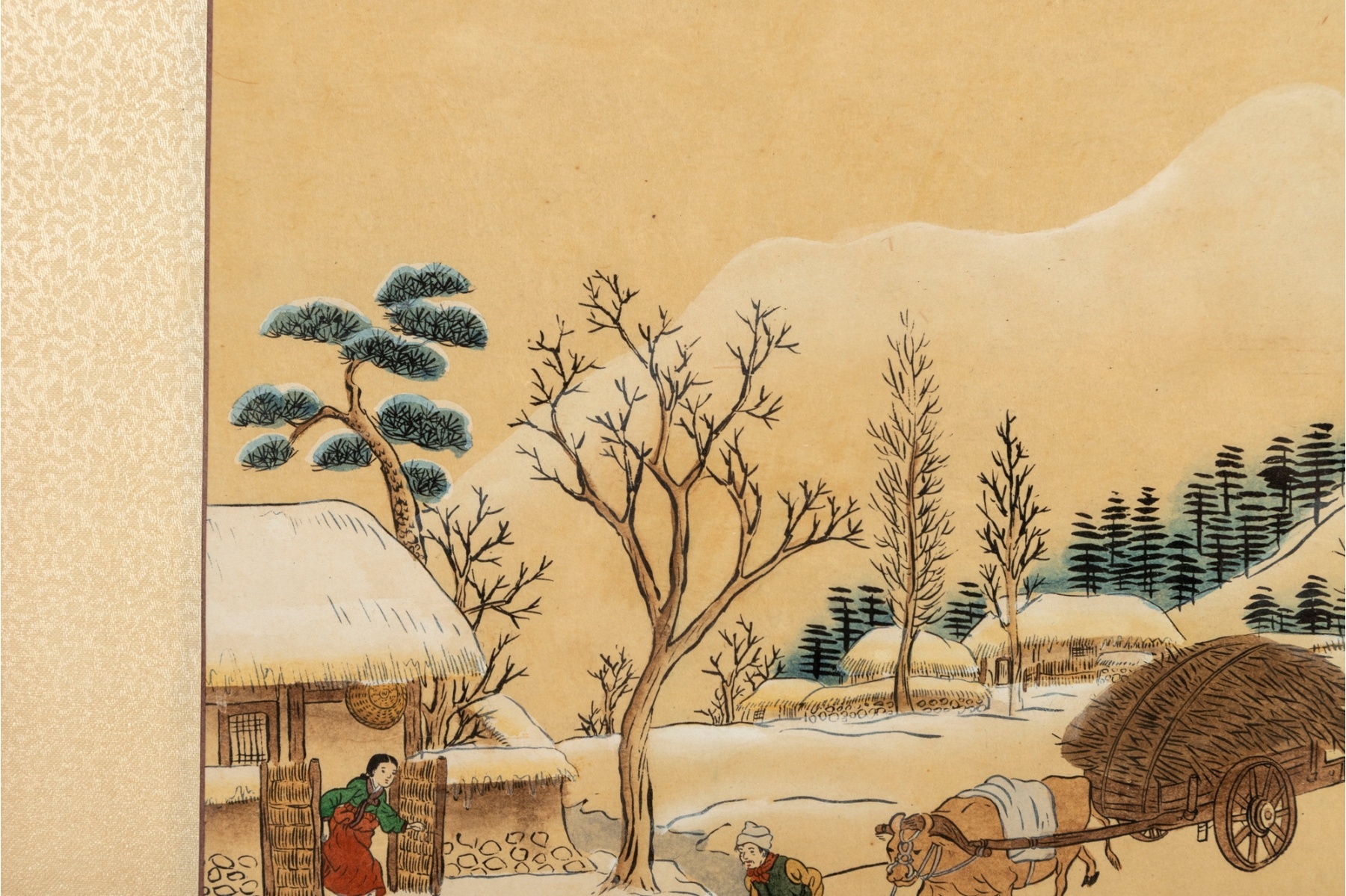 Rendered in soft tones of ivory, tan, and muted greens, the piece captures the peaceful rhythm of rural life in the winter season. Artist’s signature and red seal are visible to the lower right.