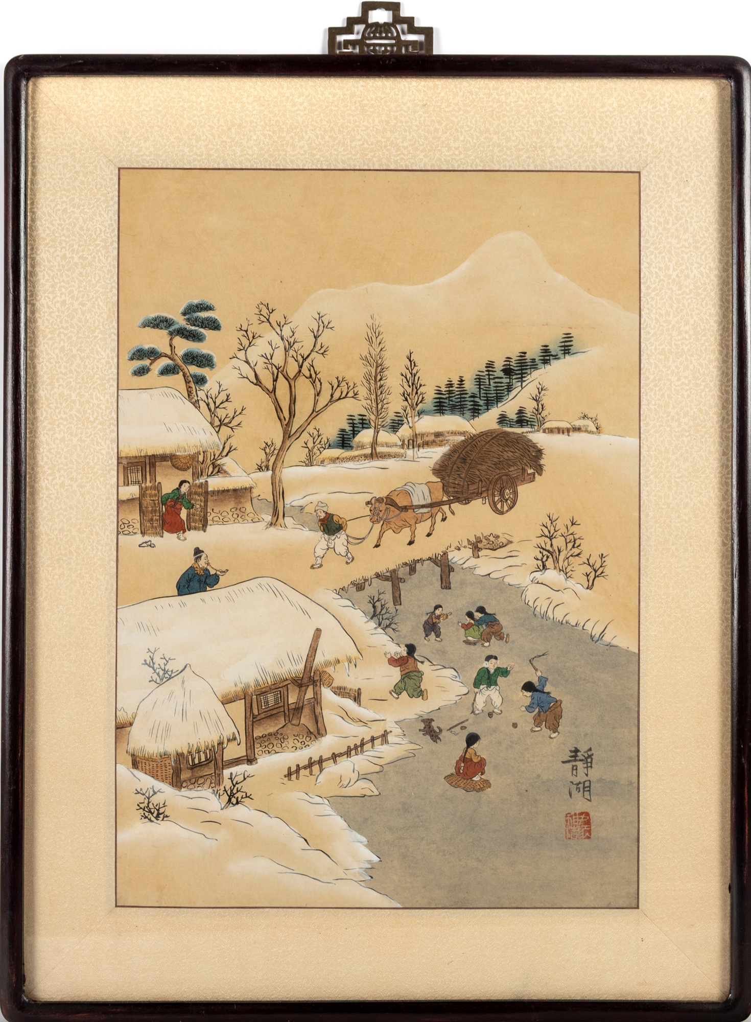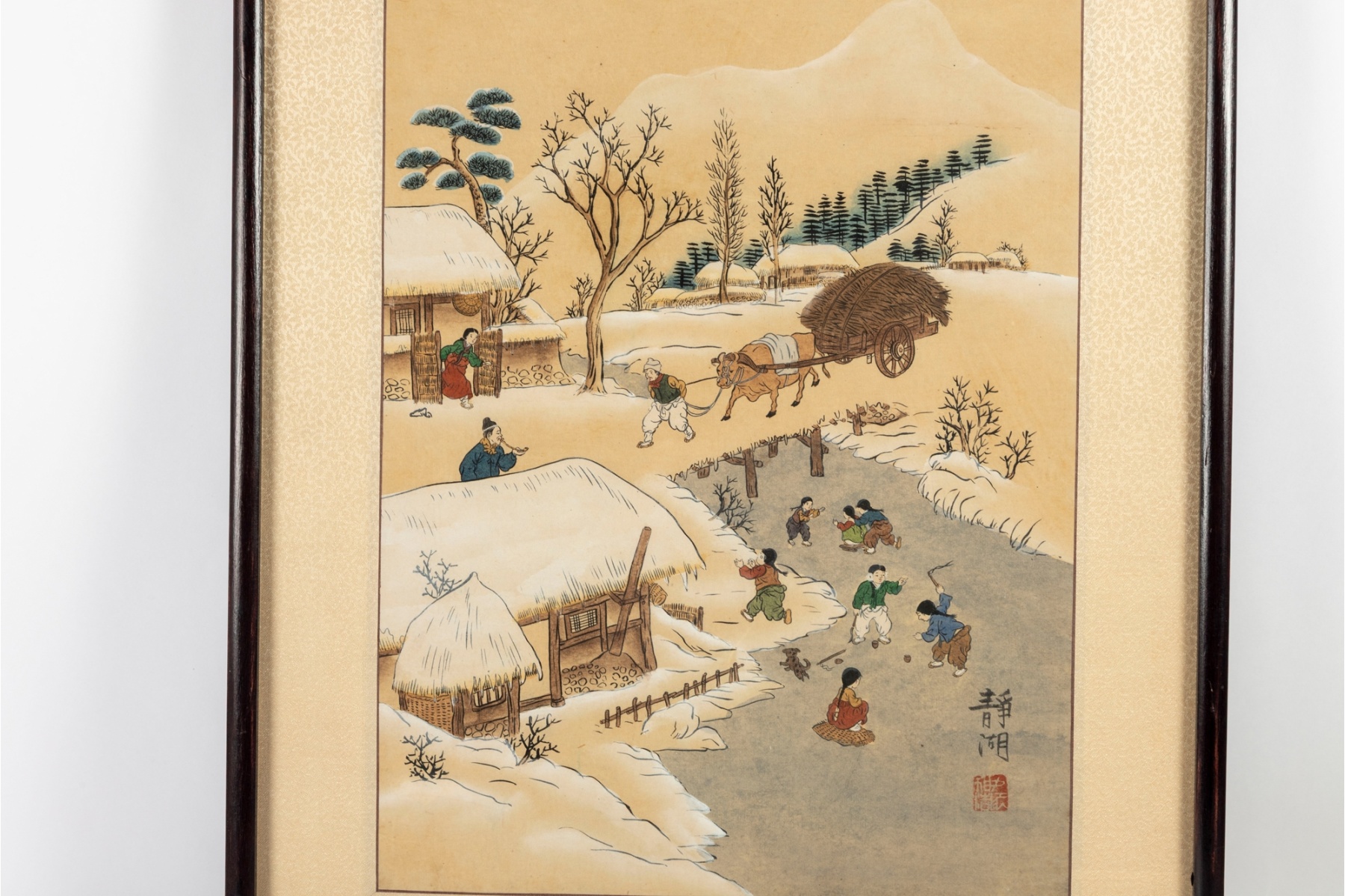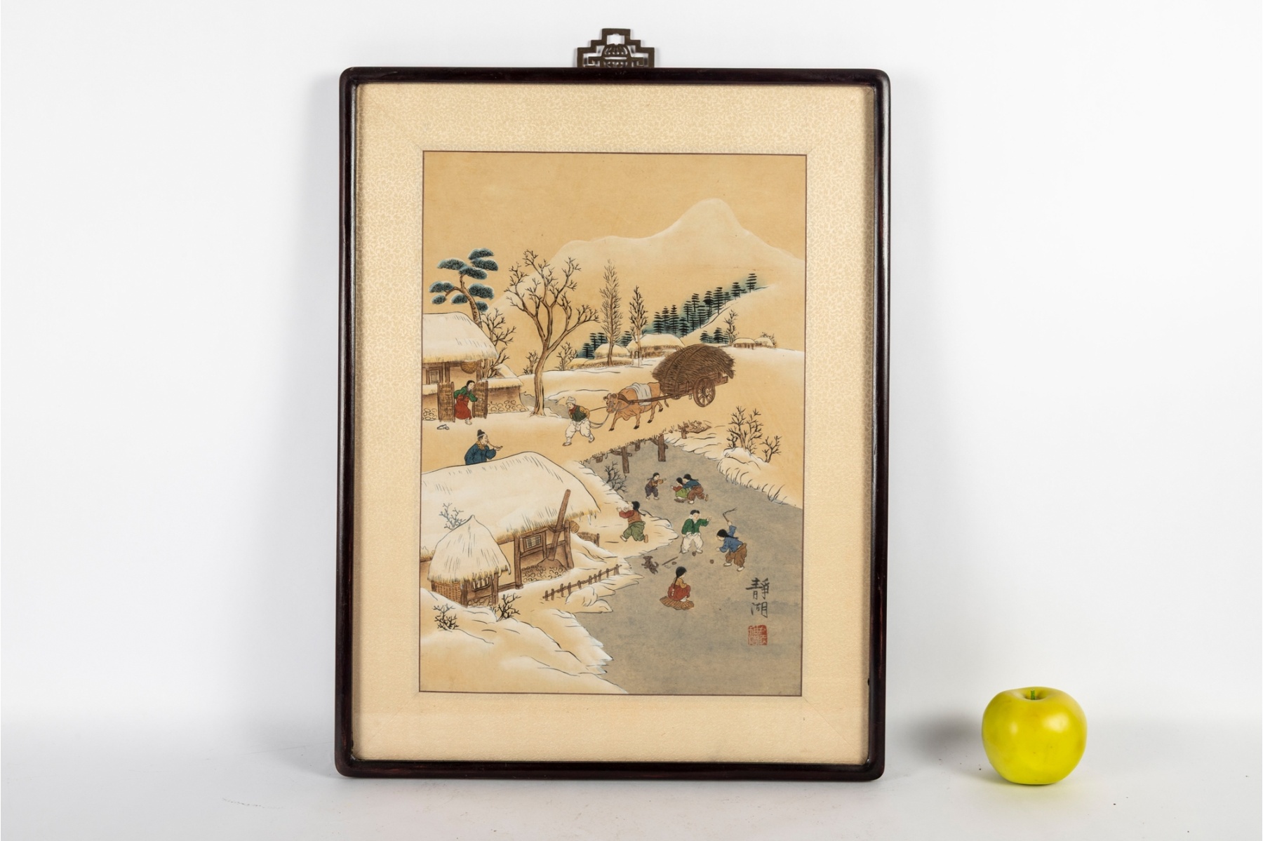 Charming Korean ink and watercolor painting on silk depicting a tranquil winter village scene. The composition shows villagers engaged in daily life including children playing on a frozen stream, a farmer guiding his ox-drawn cart, and residents gathered near thatched-roof cottages beneath snow-covered trees and rolling hills.