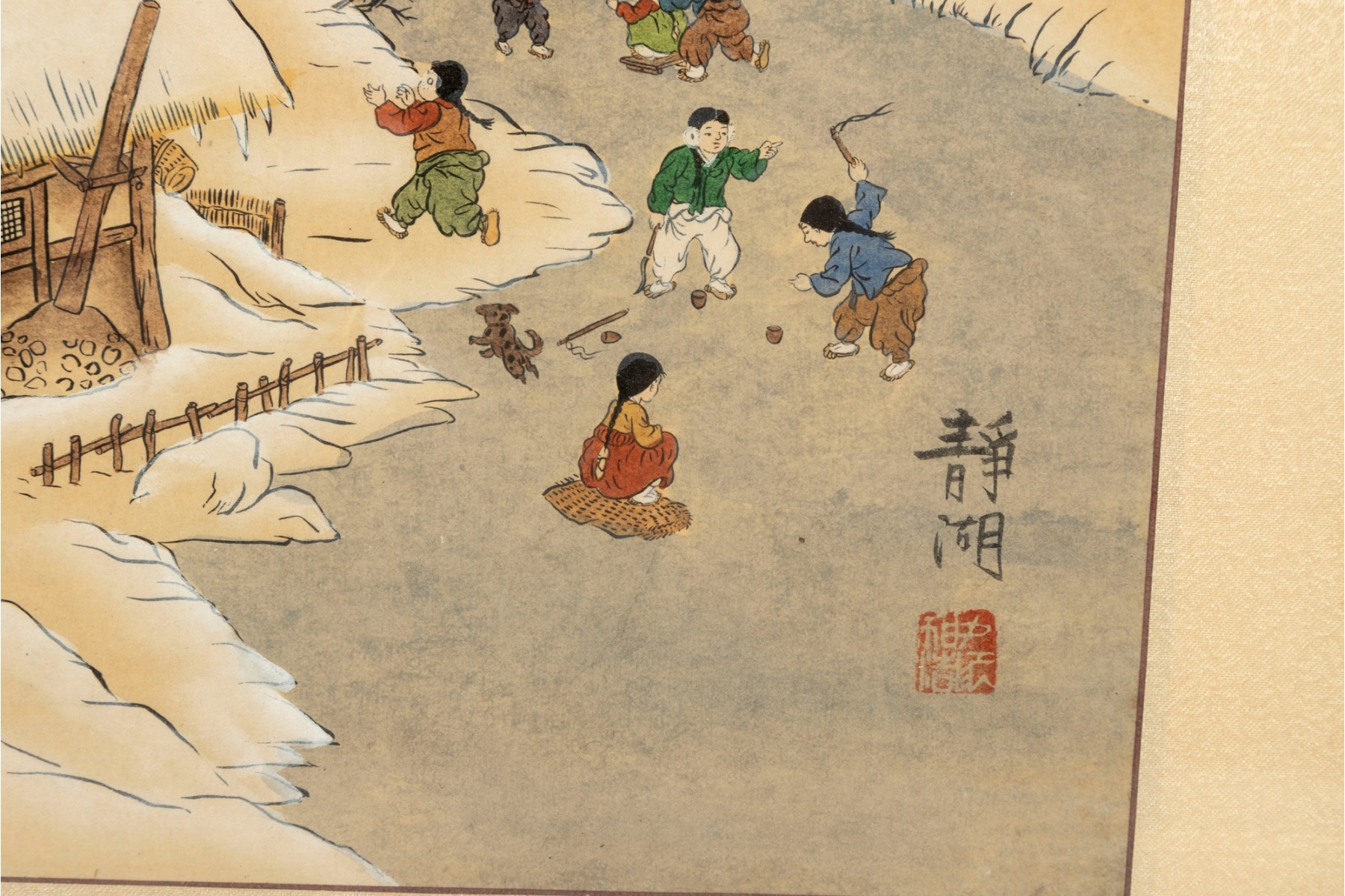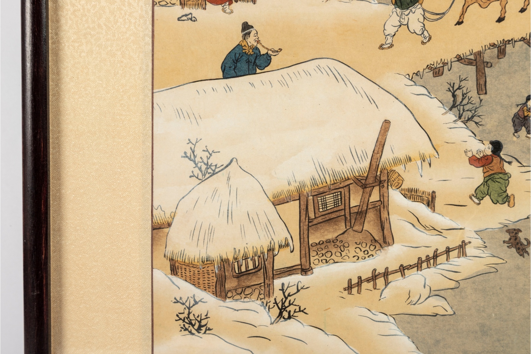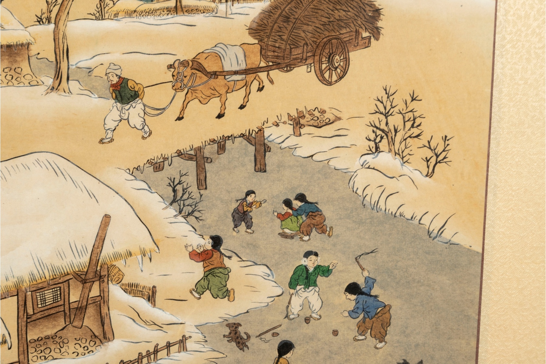 Charming Korean ink and watercolor painting on silk depicting a tranquil winter village scene. The composition shows villagers engaged in daily life including children playing on a frozen stream, a farmer guiding his ox-drawn cart, and residents gathered near thatched-roof cottages beneath snow-covered trees and rolling hills.